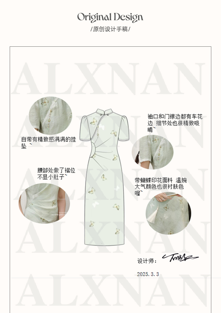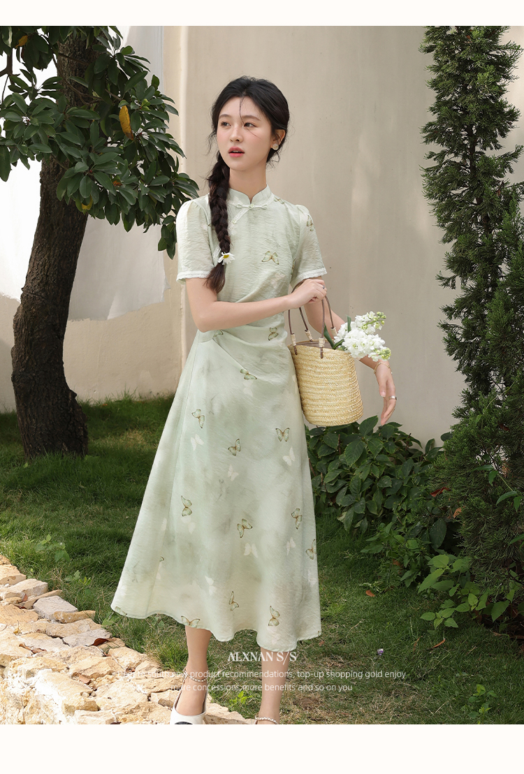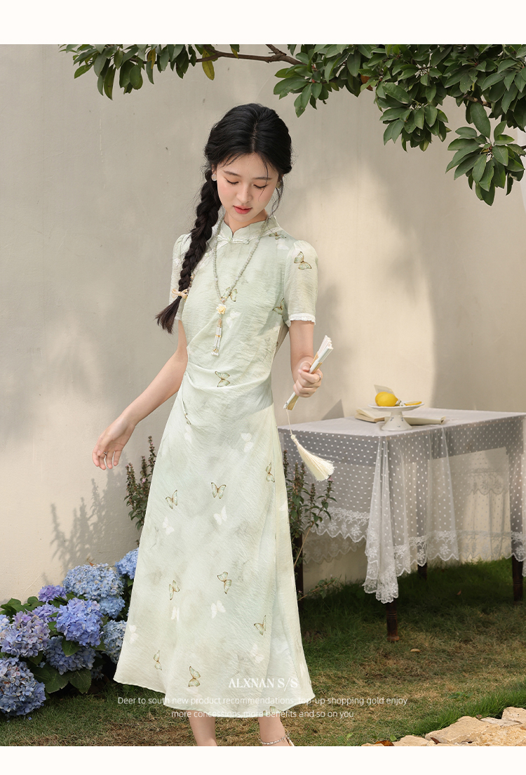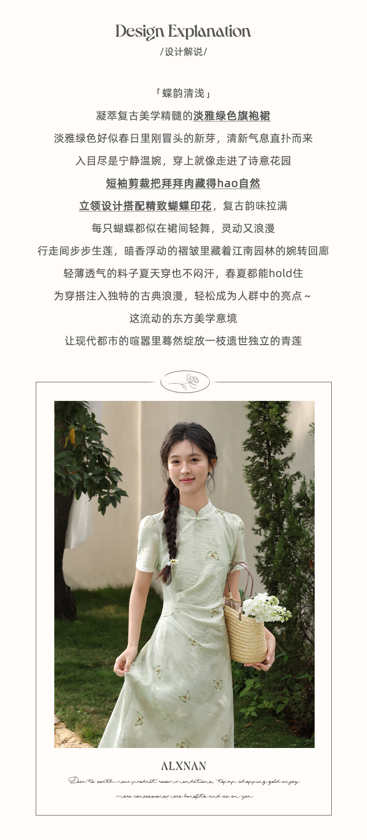 鹿向南「春山赴雪」绿色新中式连衣裙女夏季改良款旗袍复古长裙子L53902