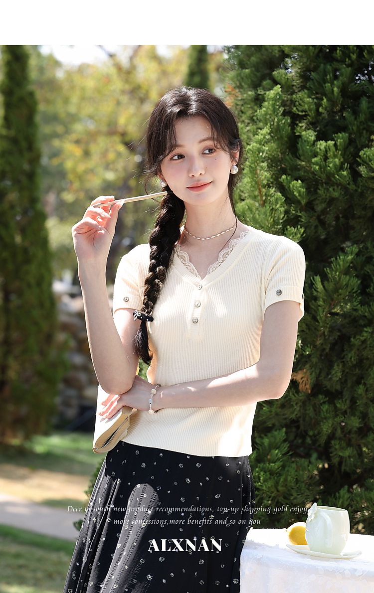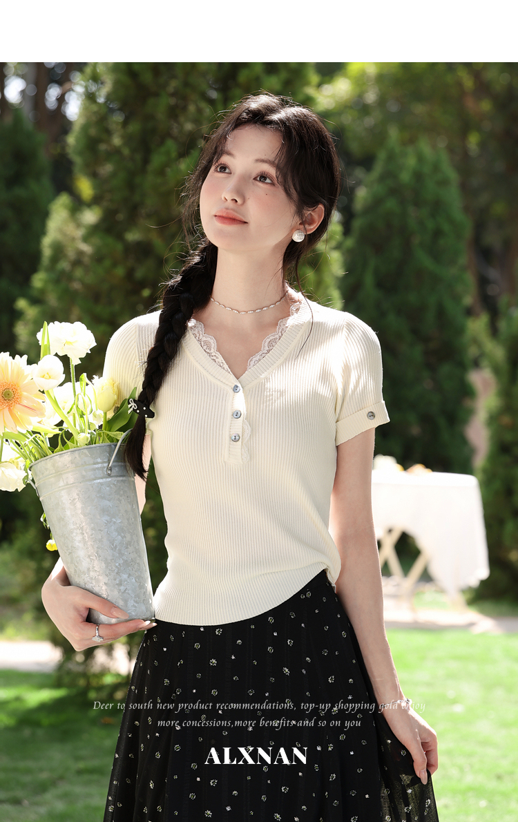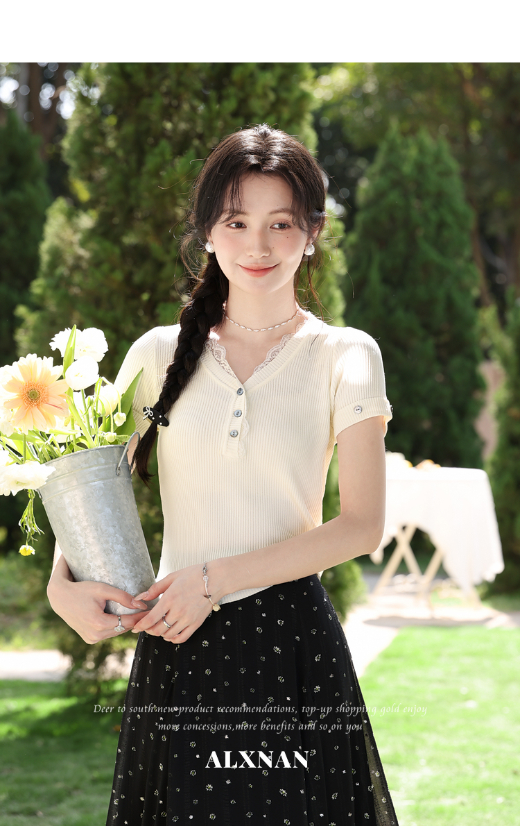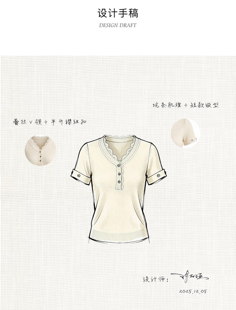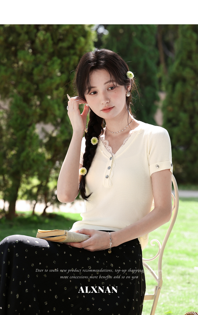 鹿向南「浅叙柔夏」纽扣V领针织短袖t恤夏季新款减龄修身上衣女