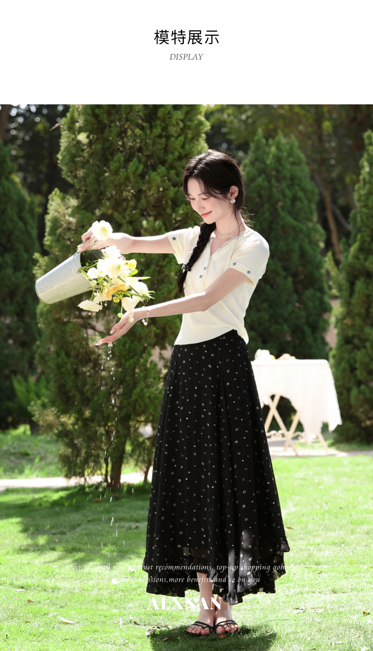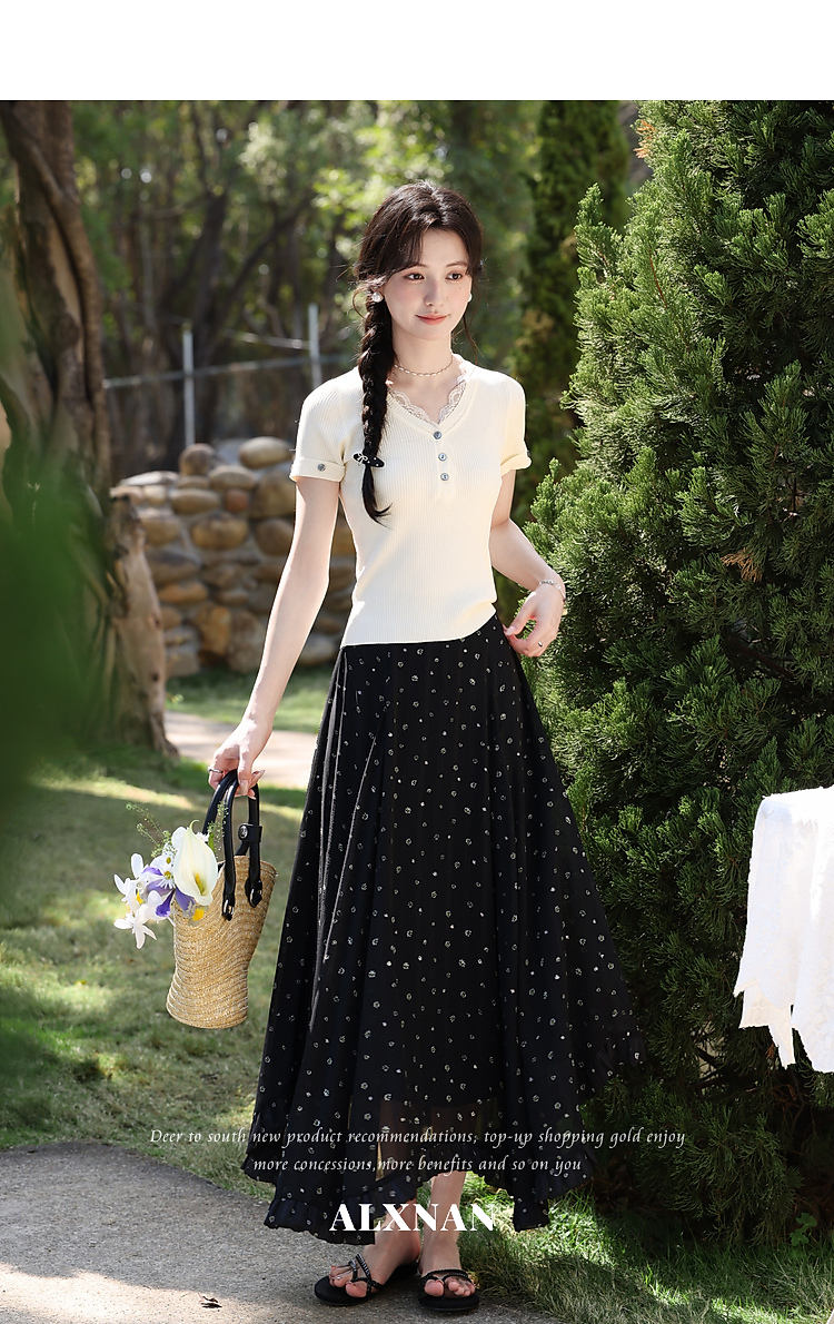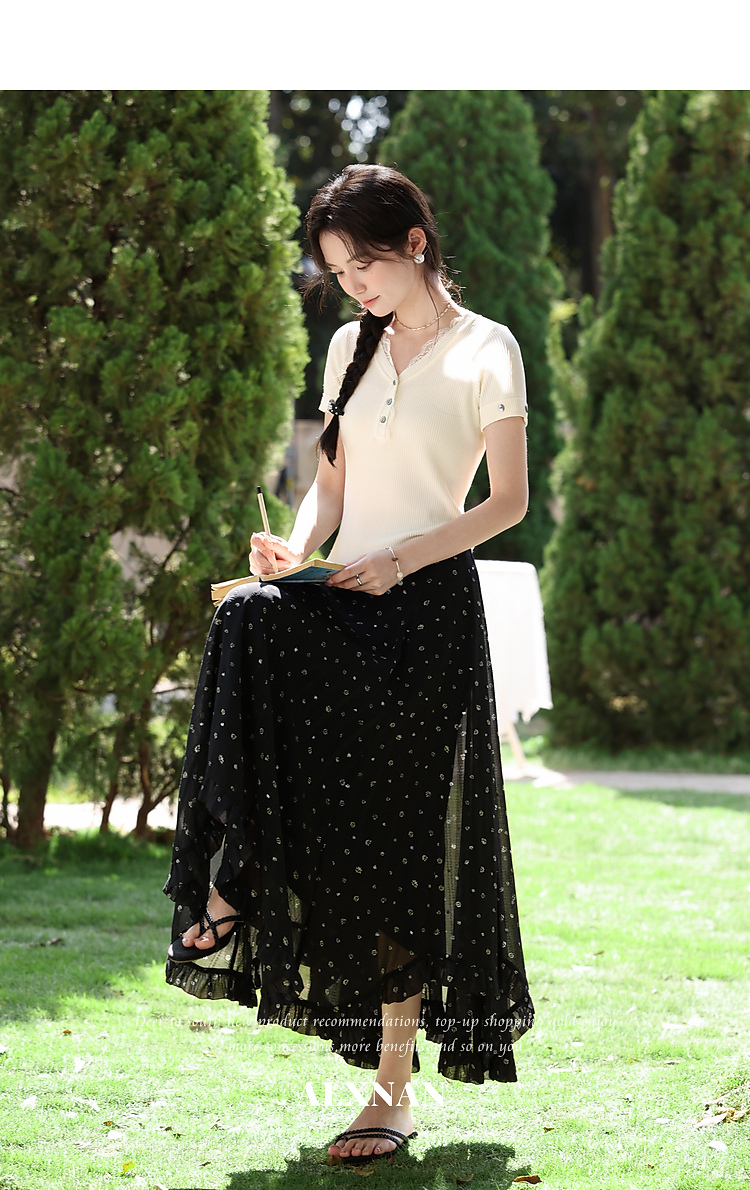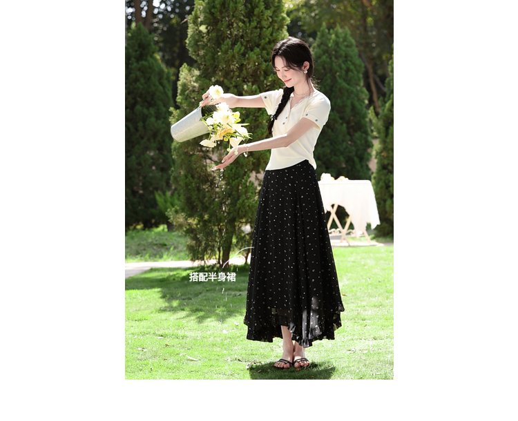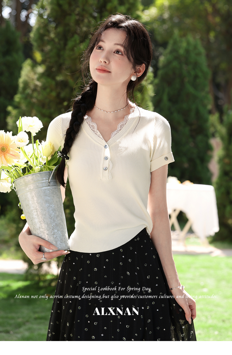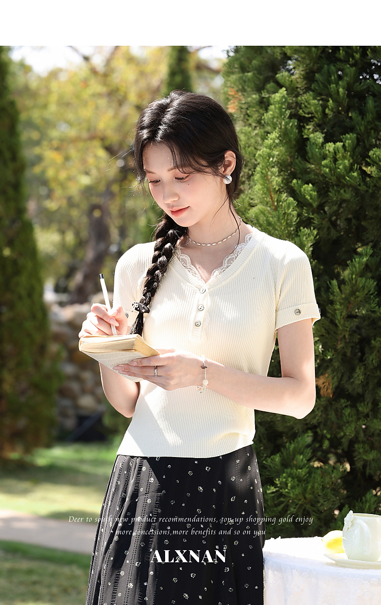 鹿向南「浅叙柔夏」纽扣V领针织短袖t恤夏季新款减龄修身上衣女