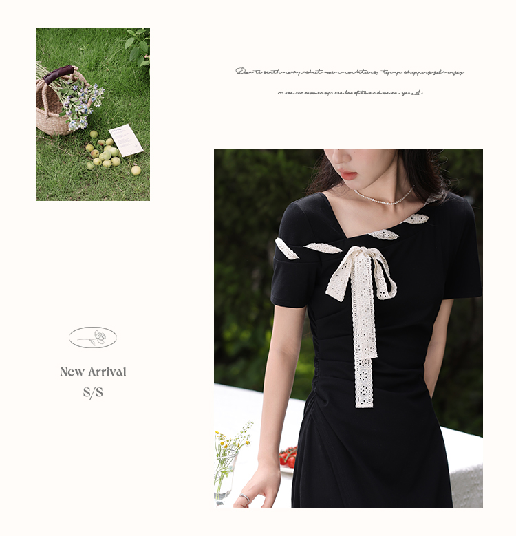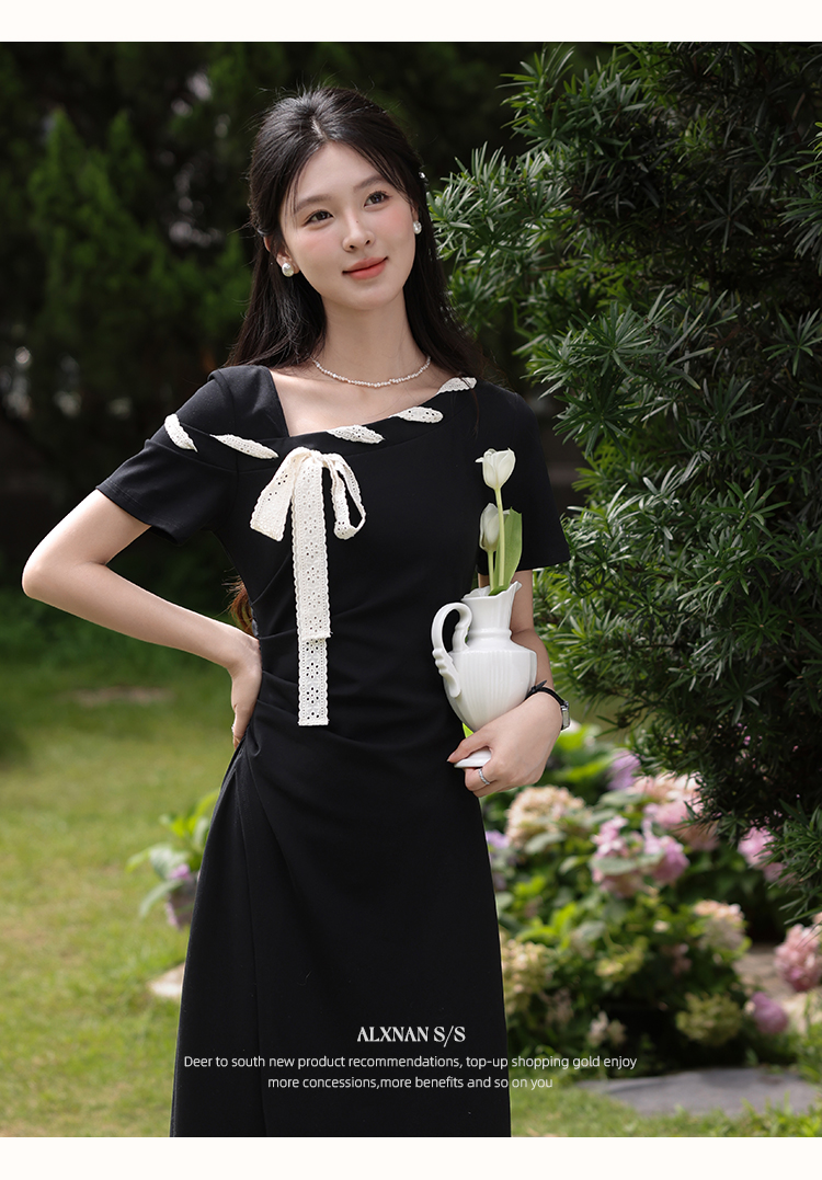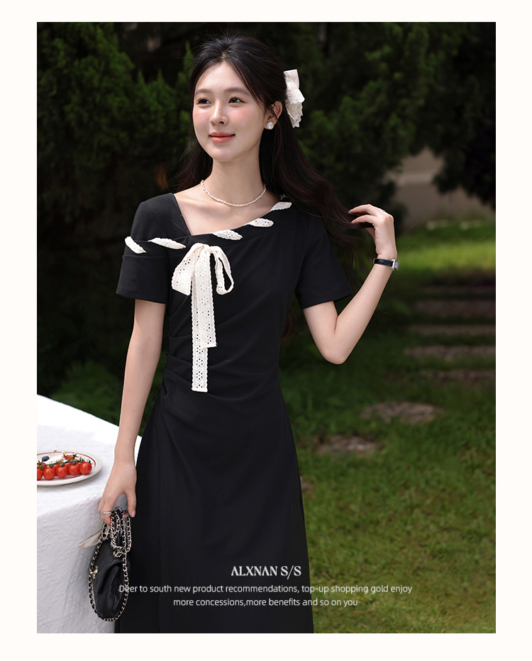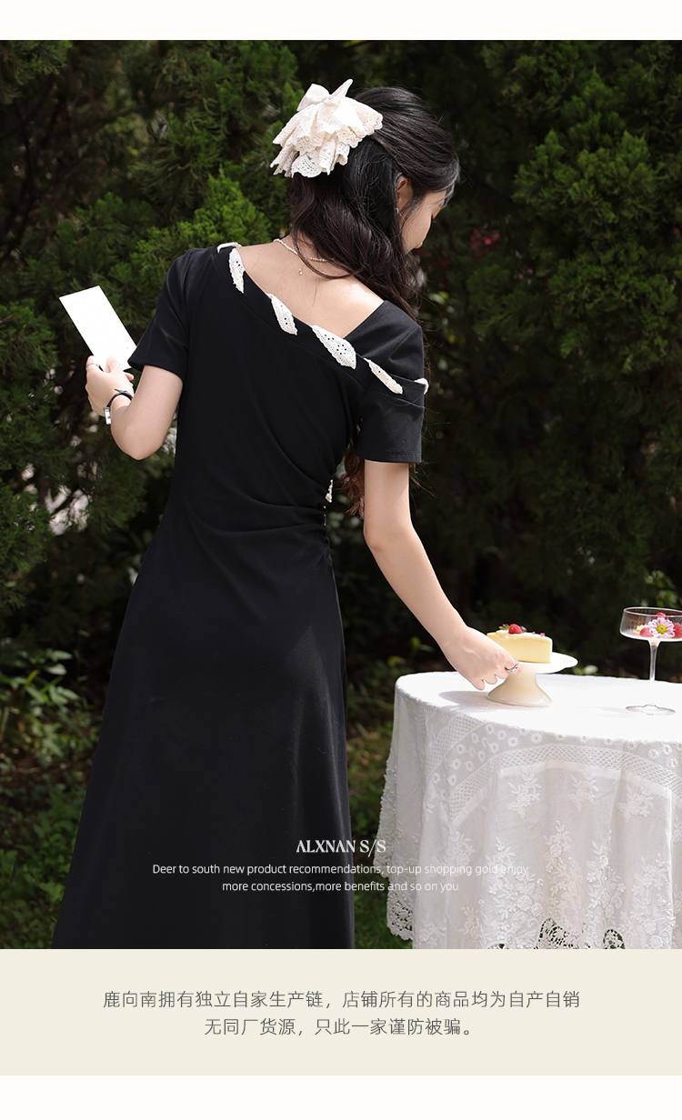 【6折秒杀】鹿向南「法式软糖」气质不规则黑色短袖斜肩连衣裙女夏A字长裙子