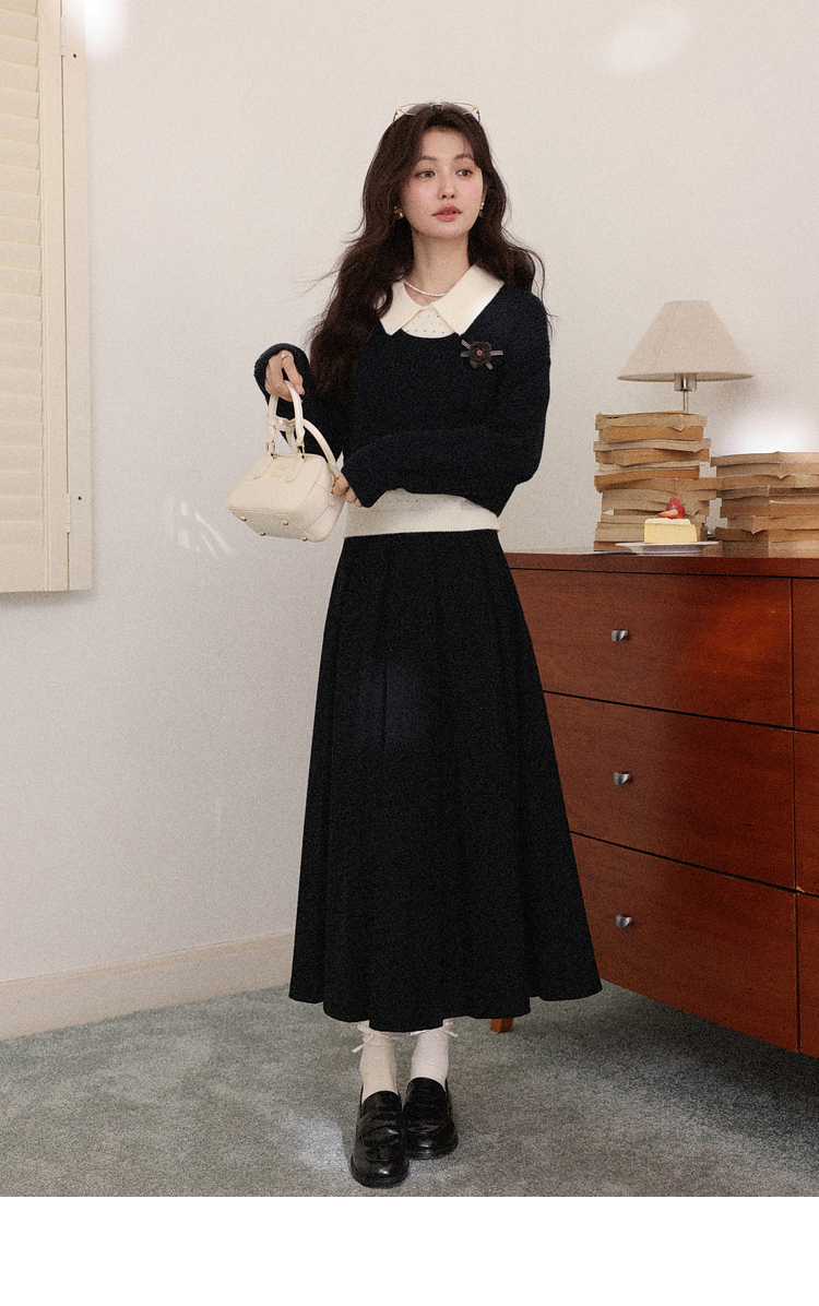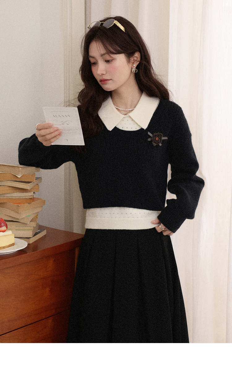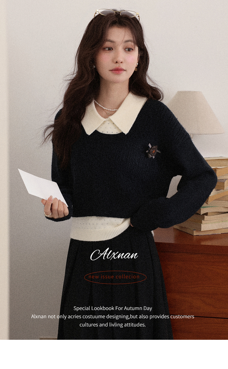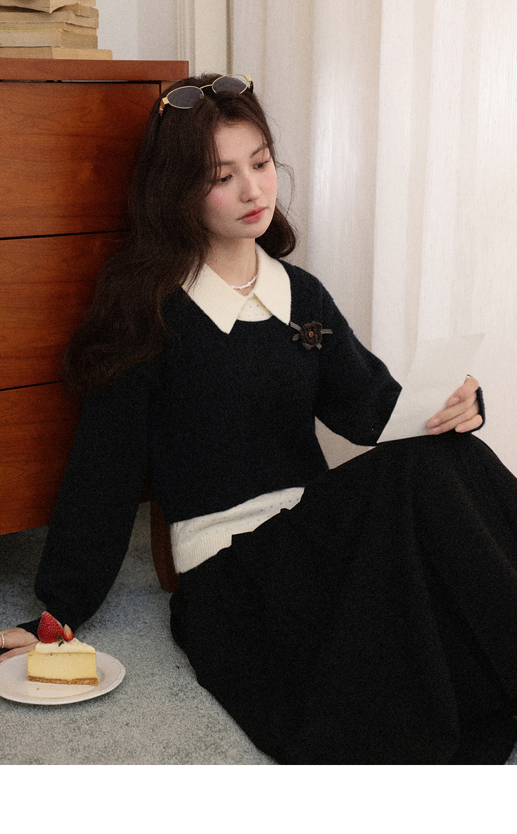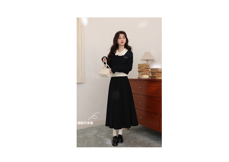 鹿向南「格雷奏曲」法式圆领黑色长袖毛衣秋冬新款时尚短款上衣女