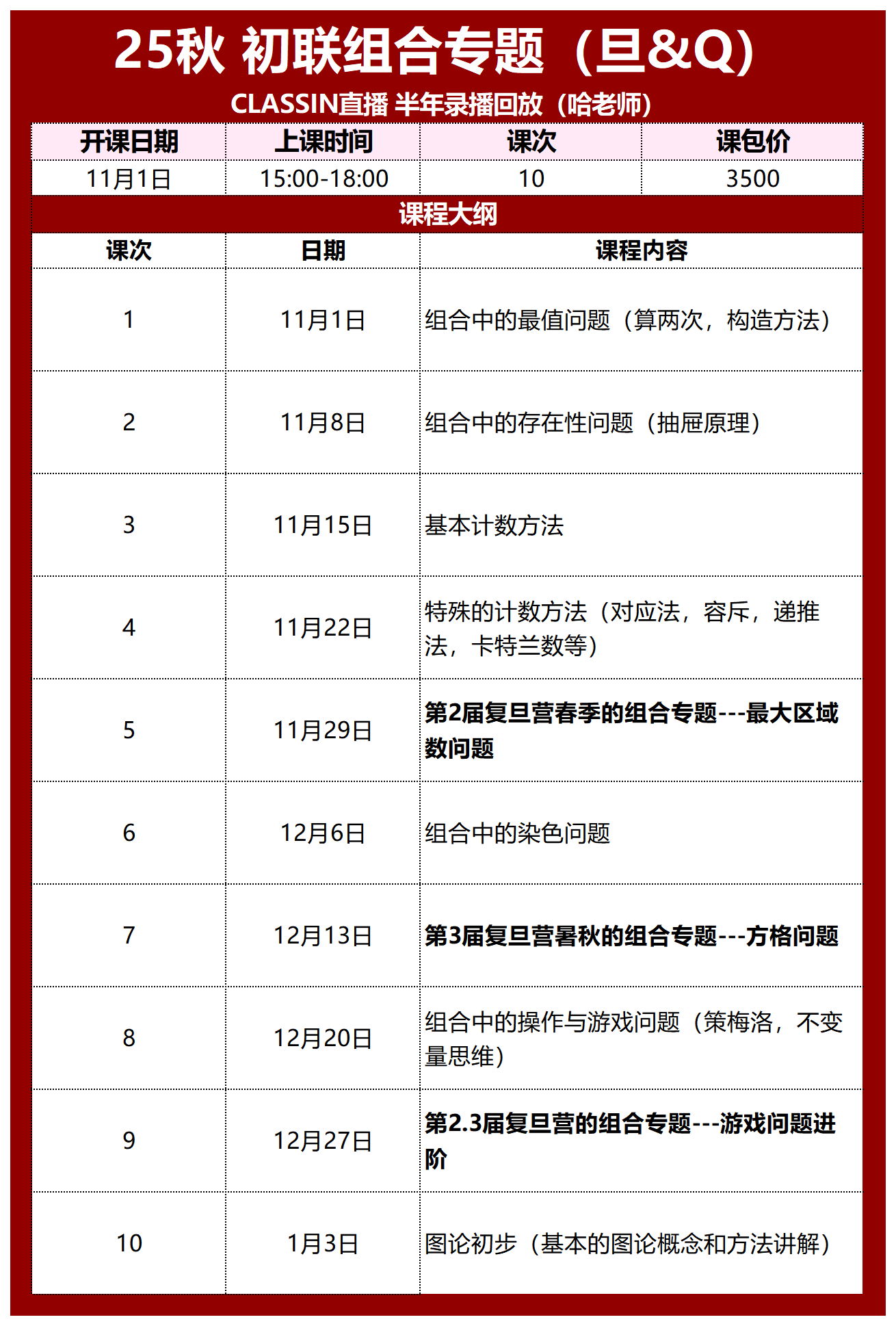 🏖️赠送一次复旦营考试真题汇集的模拟考试(含第1.2.3届复旦营中,组合板块的几乎所有考题,并且有一个图论中的现学现考的板块),测试时间待定