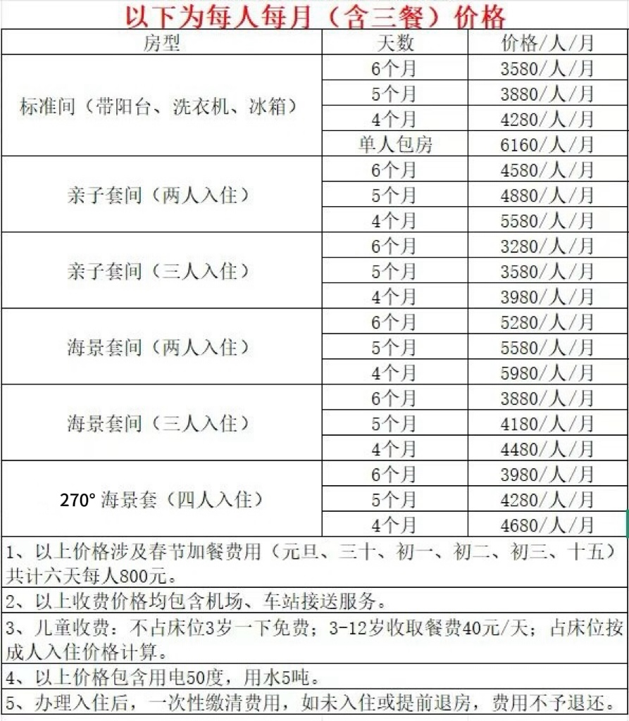 1、以下价格涉及春节加餐费用(元旦、三十、初一、初二、初三、十五)共计六天每人800元。