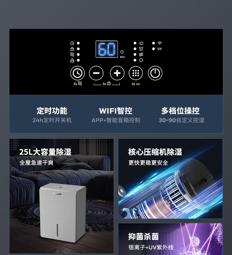 霍尼韦尔(Honeywell)除湿机/抽湿机 25L/天家用大除湿量干燥机吸湿器干衣除菌除湿器APP操作自动除霜TPPWR25CALSG-25L