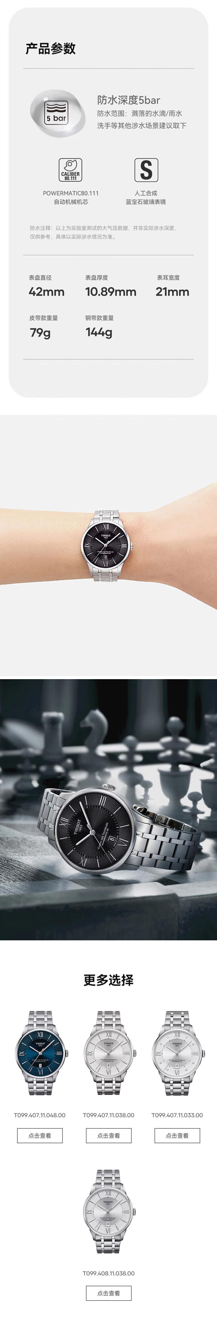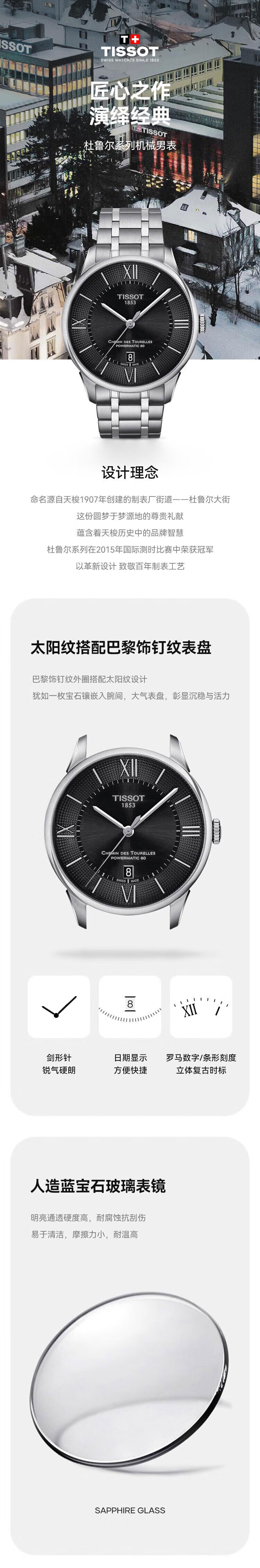 天梭Tissot杜鲁尔系列80机芯机械男表黑盘钢带 T099.407.11.058.00