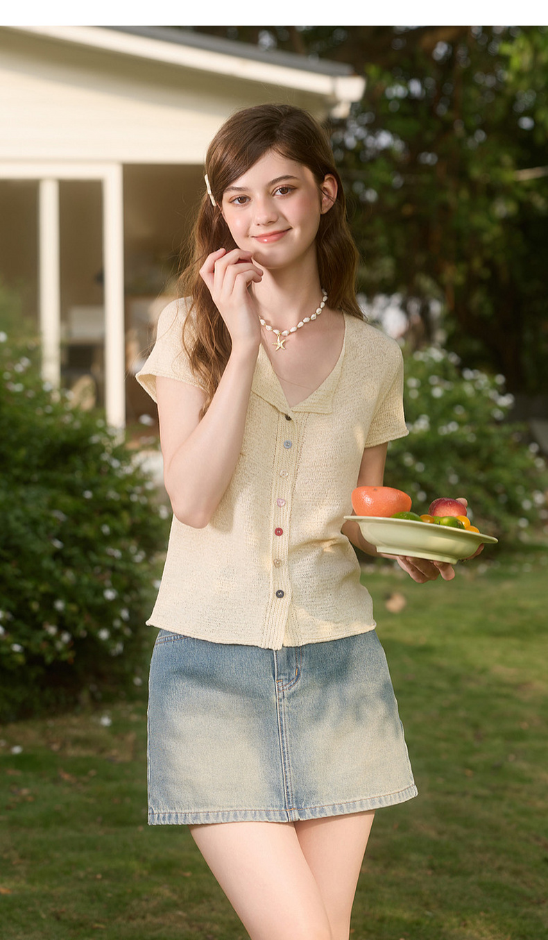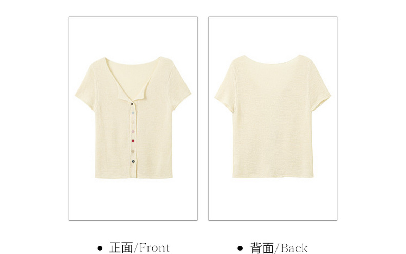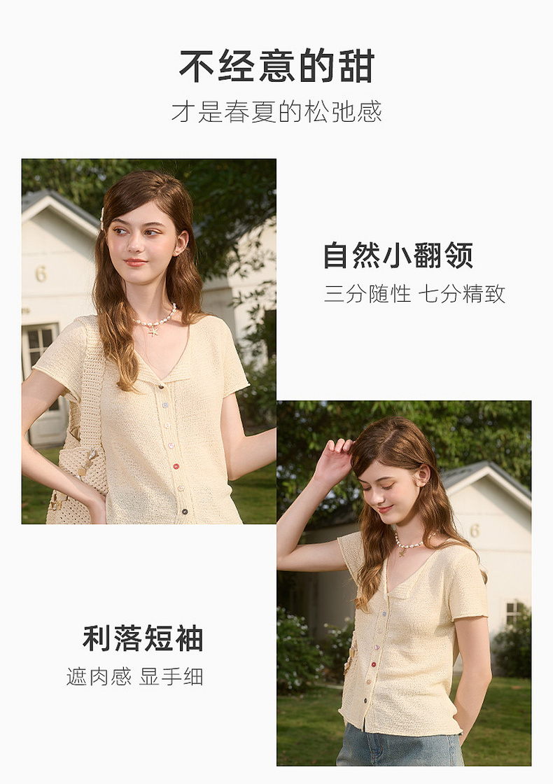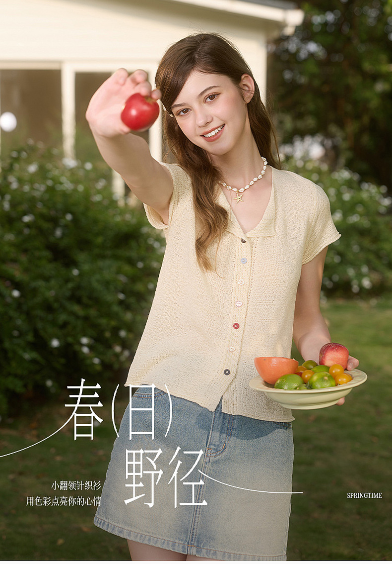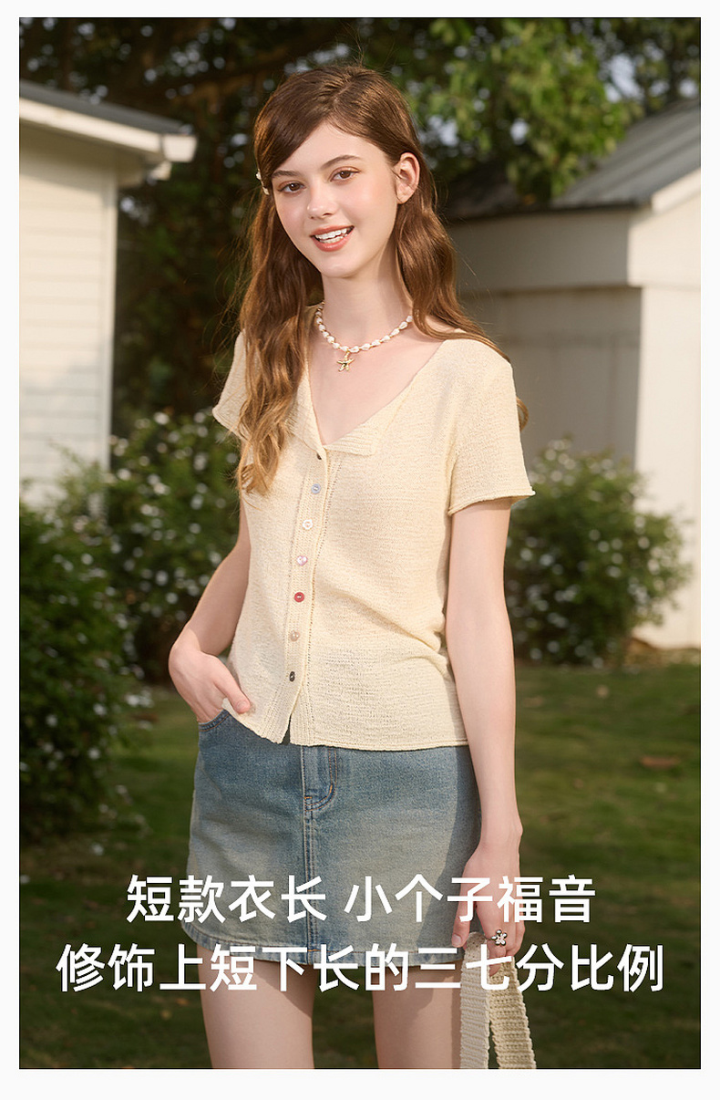 三彩独醒2026春季新款多巴胺针织衫小翻领短袖毛衫修身短款上衣F