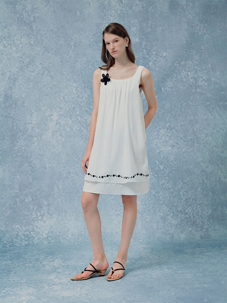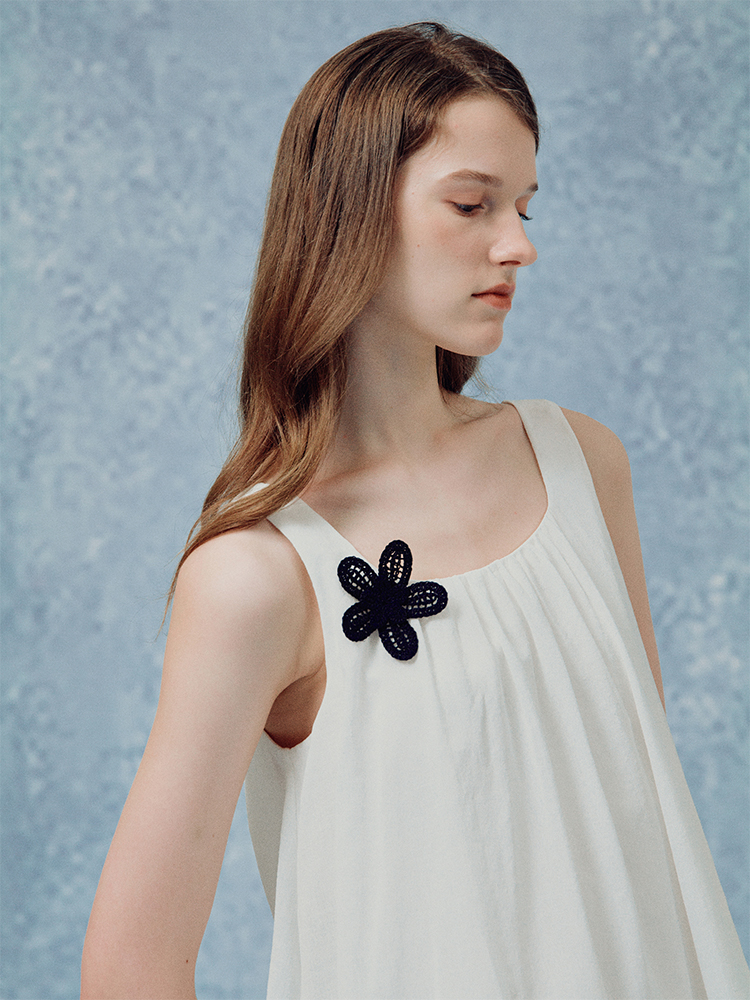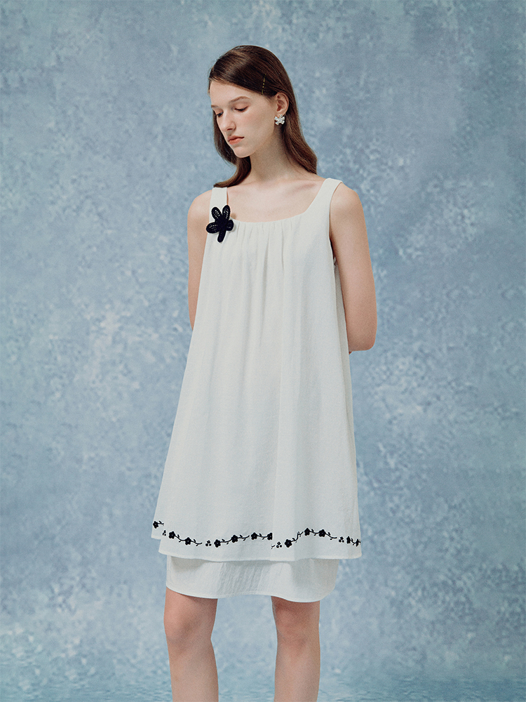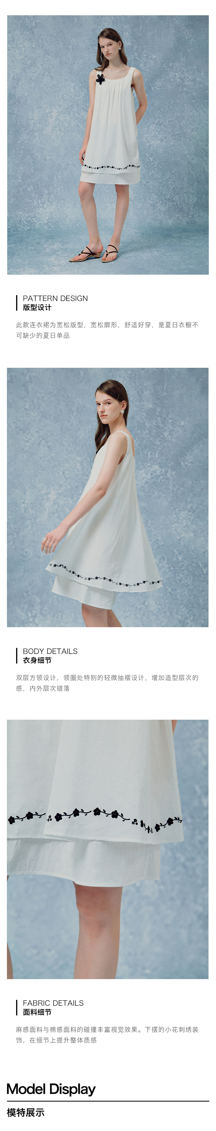 ForPoem 现货 25/SS原创设计假两件方领可拆卸花朵胸针刺绣连衣裙