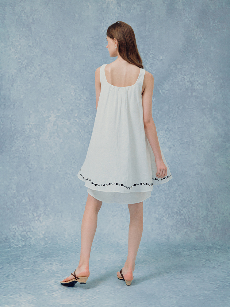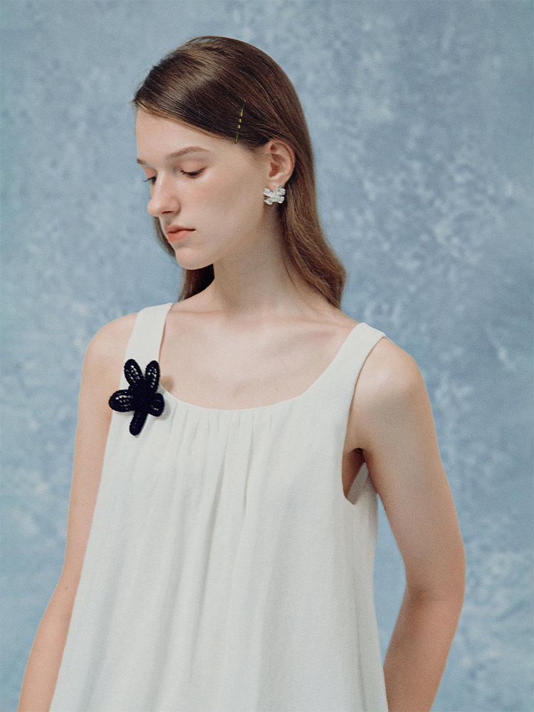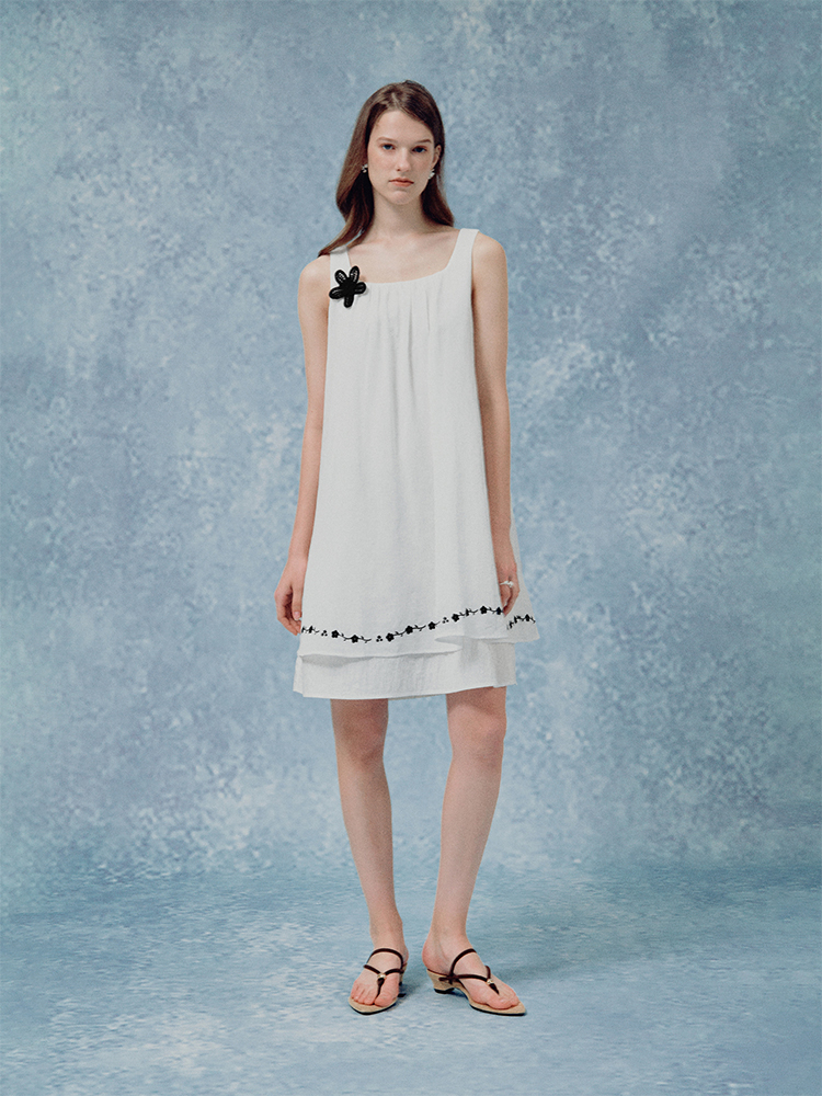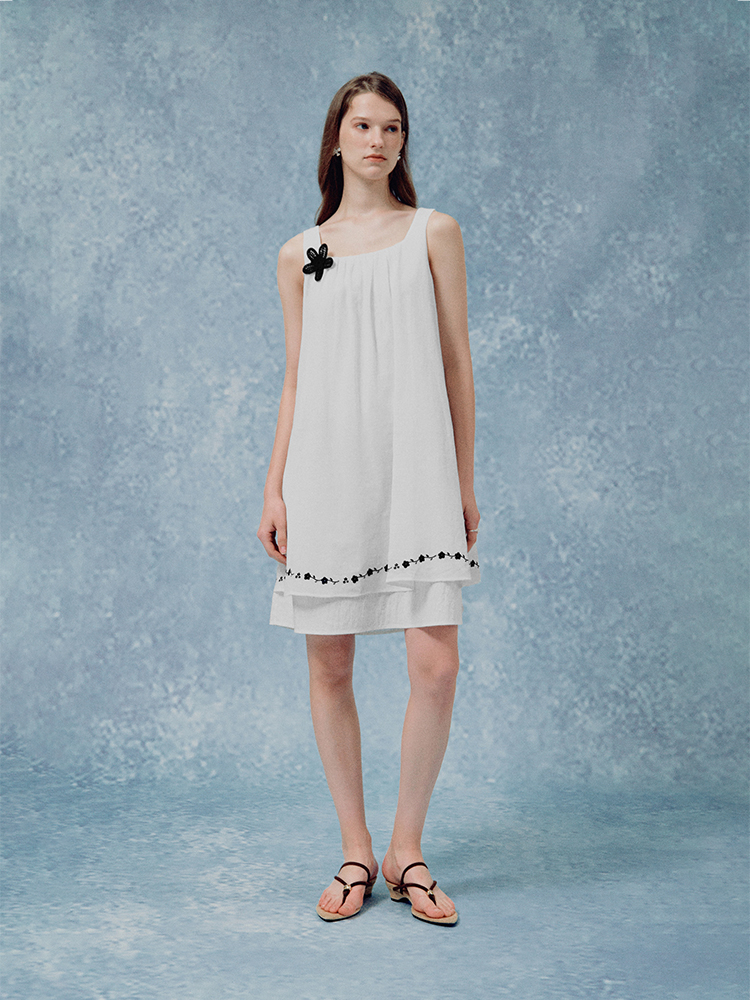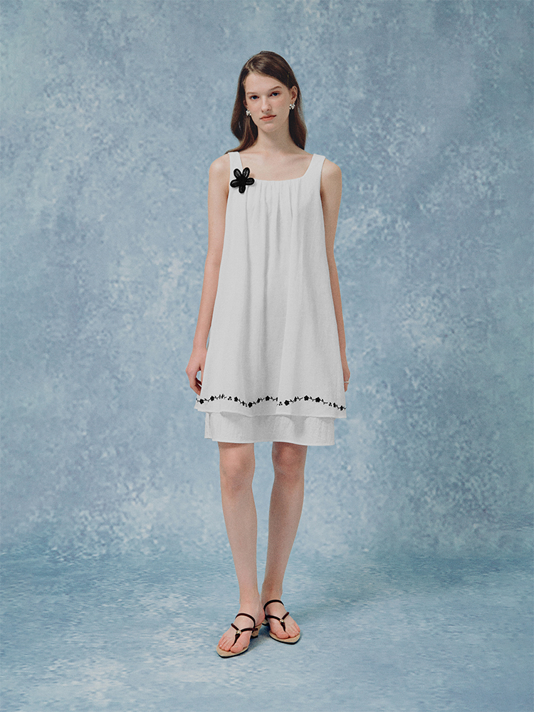 ForPoem 现货 25/SS原创设计假两件方领可拆卸花朵胸针刺绣连衣裙