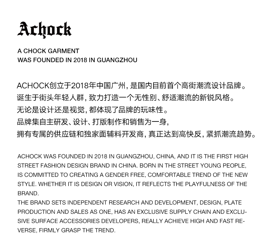 - ACHOCK创立于2018年的中国广州 以高街文化为核心 致力于打造一个无性别 舒适潮流的新锐风格