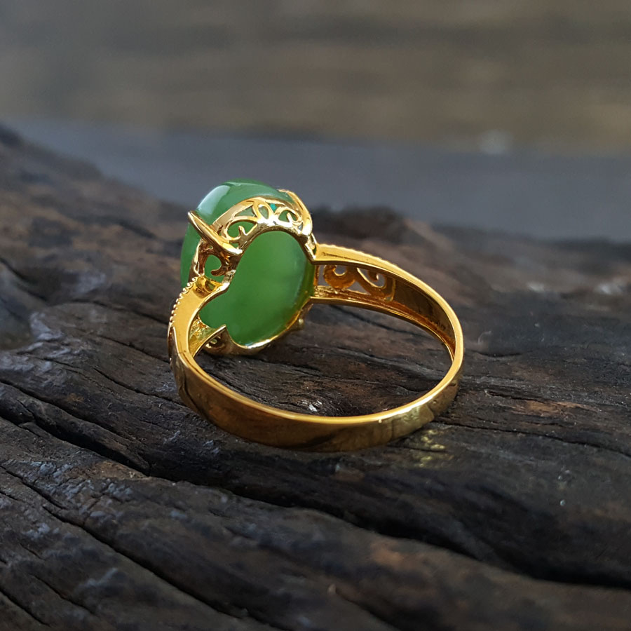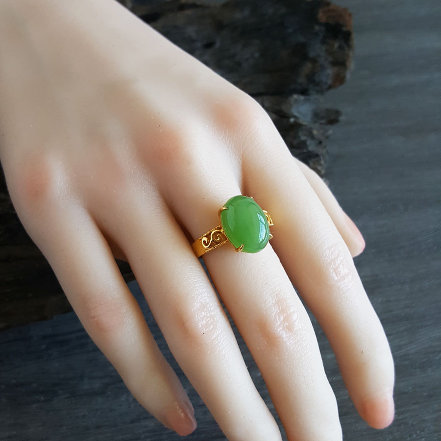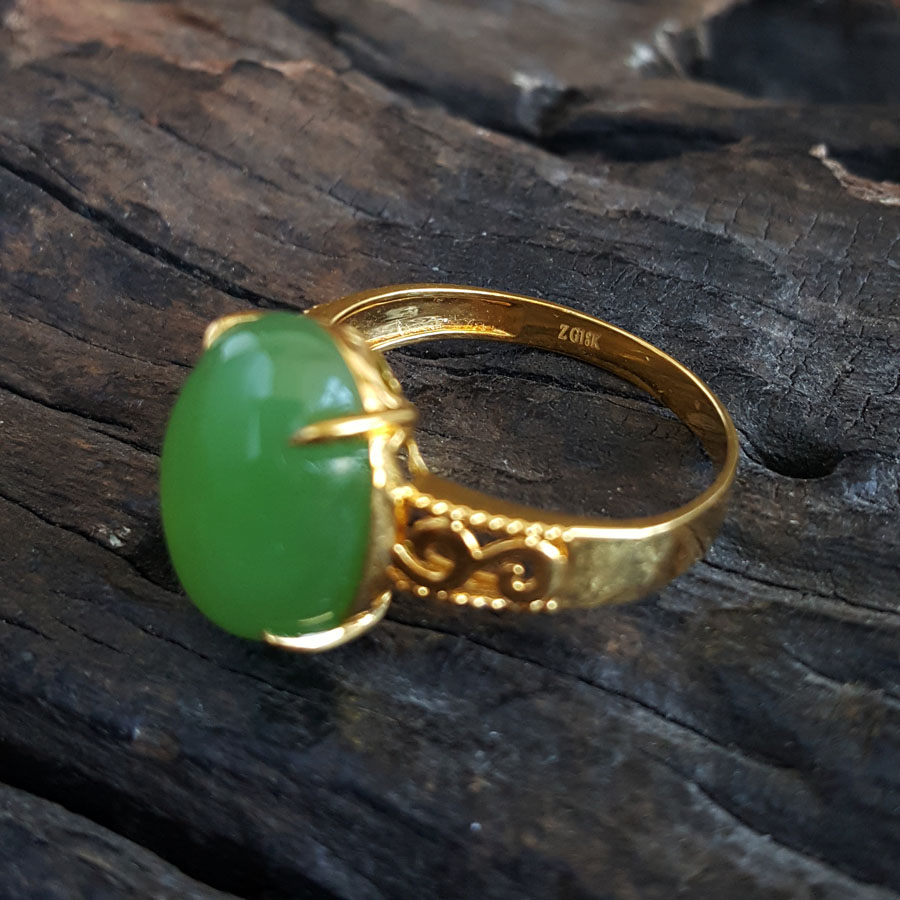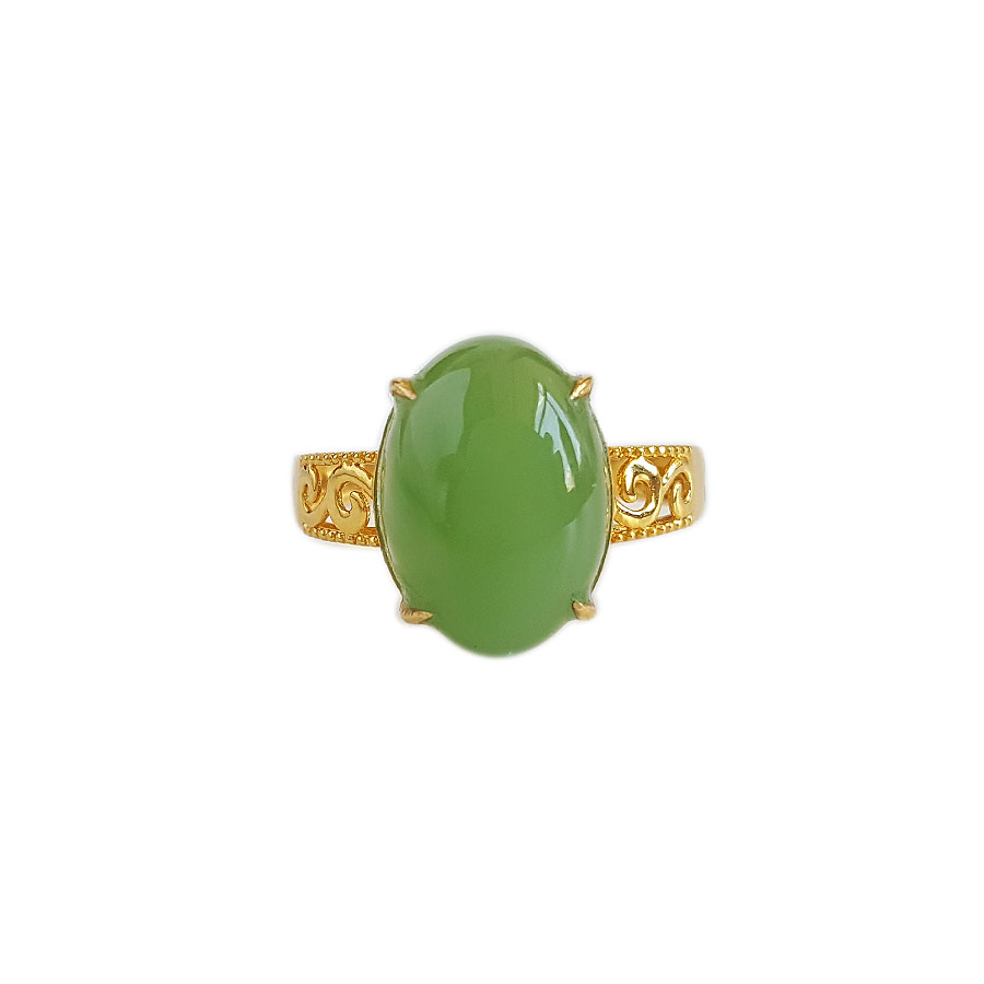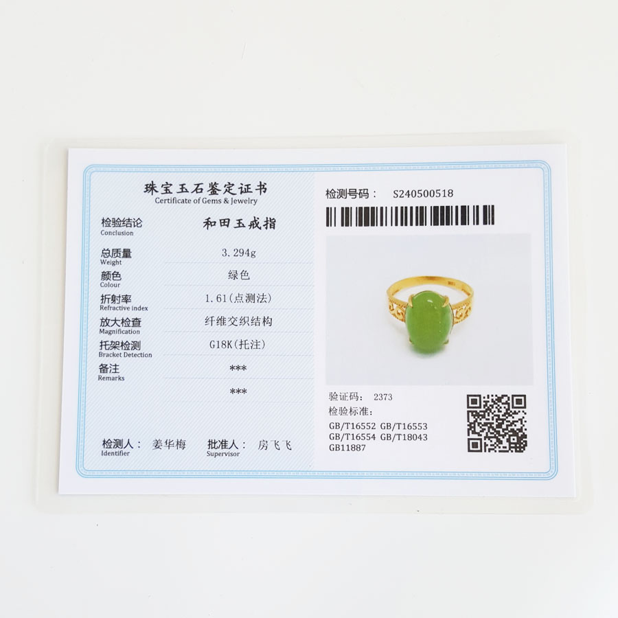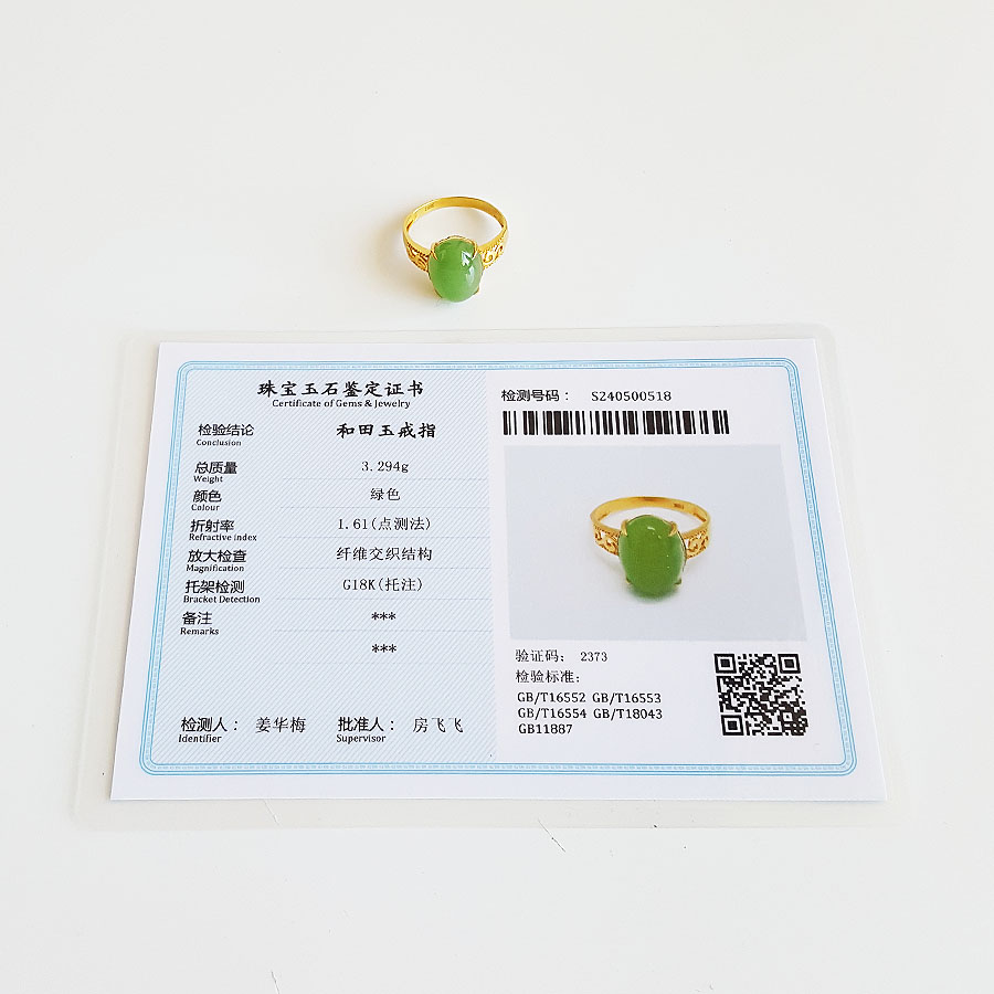 【天然正品】AU750黄金镶天然苹果绿无黑点蛋面和田玉戒指080524NJ11