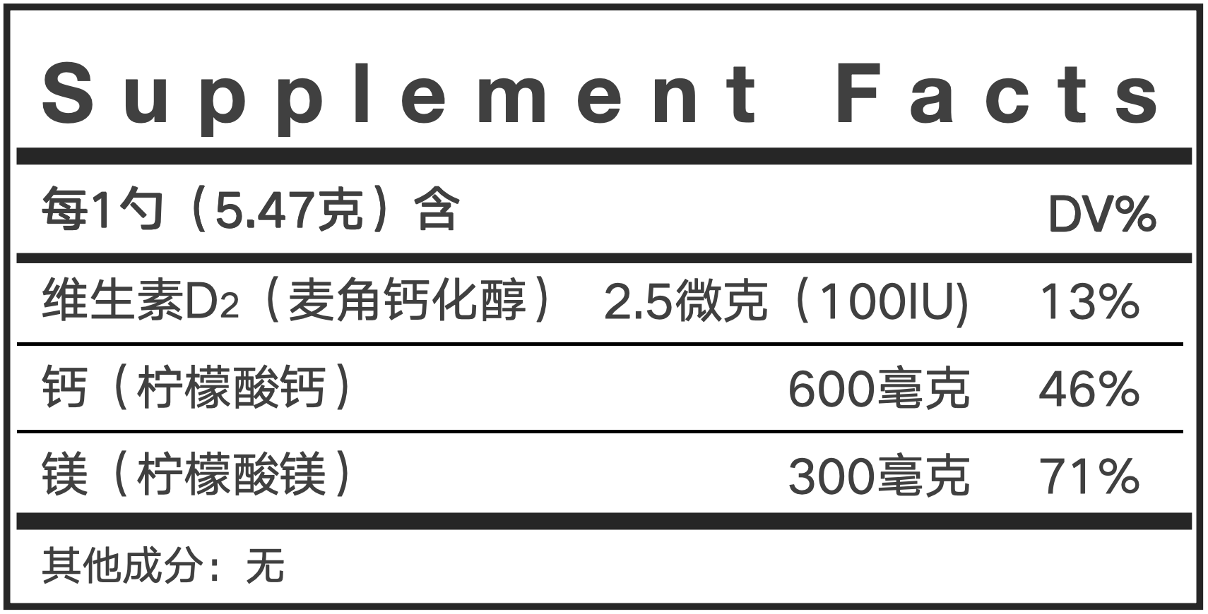 一款含纯净的钙镁粉剂产品,每一勺提供600毫克柠檬酸钙和300毫克柠檬酸镁。