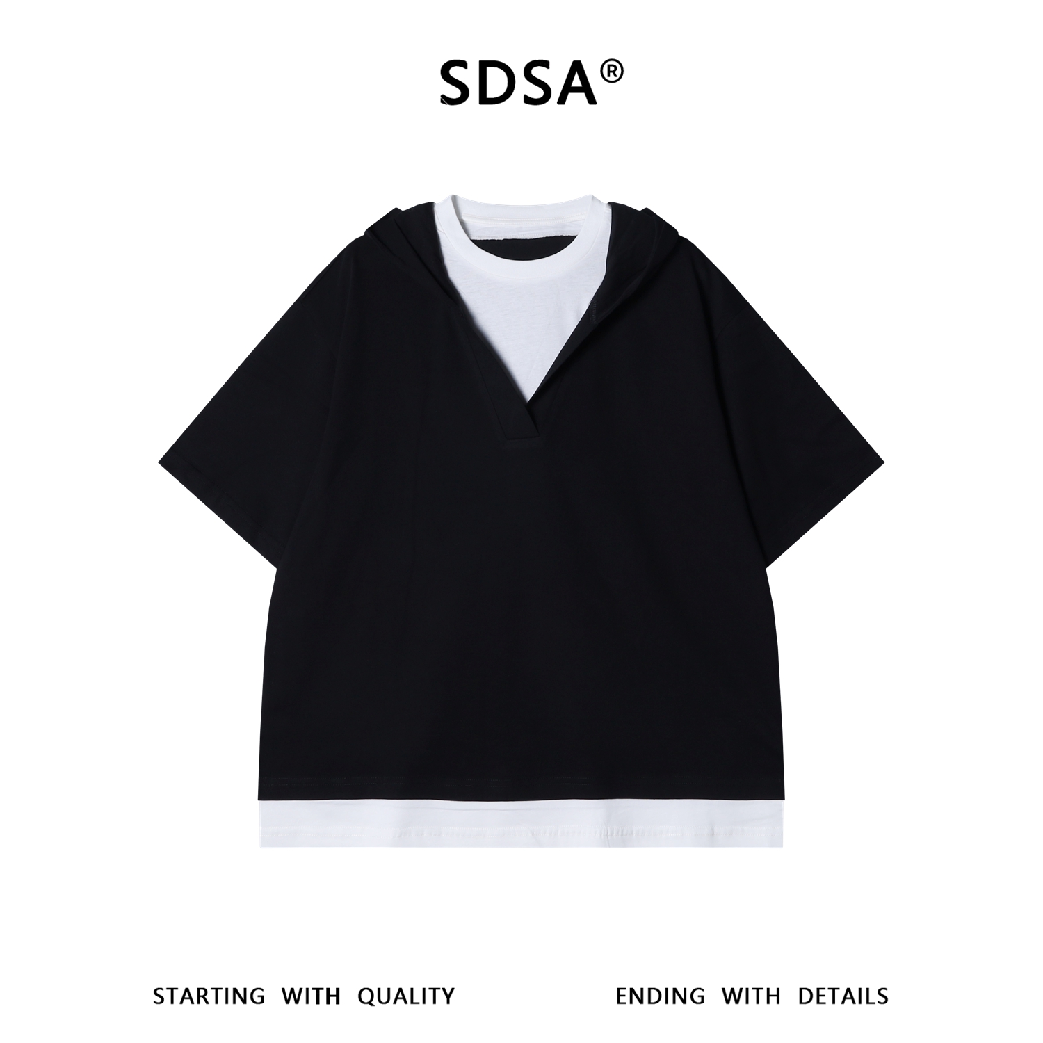 SDSA男装2026新款轻奢潮牌撞色假两件连帽短袖T恤百搭休闲上衣