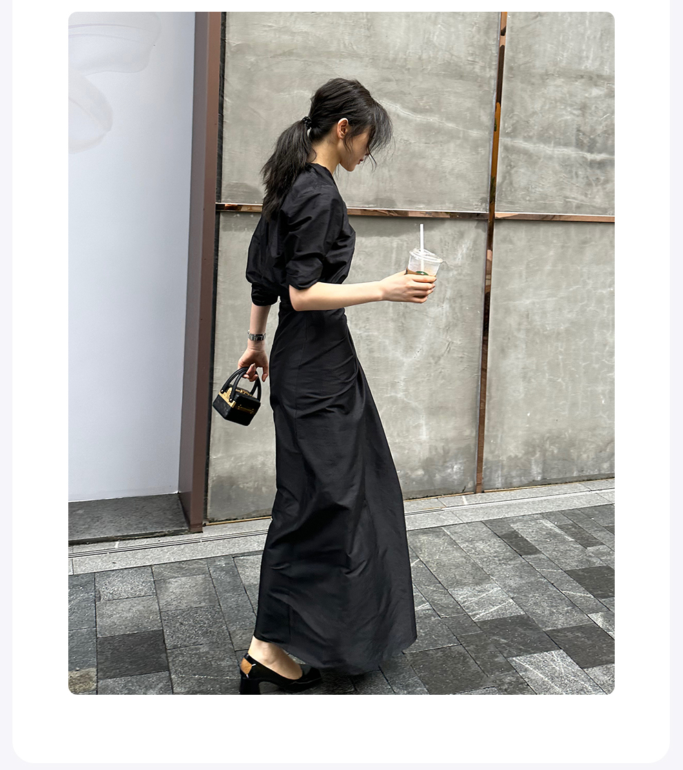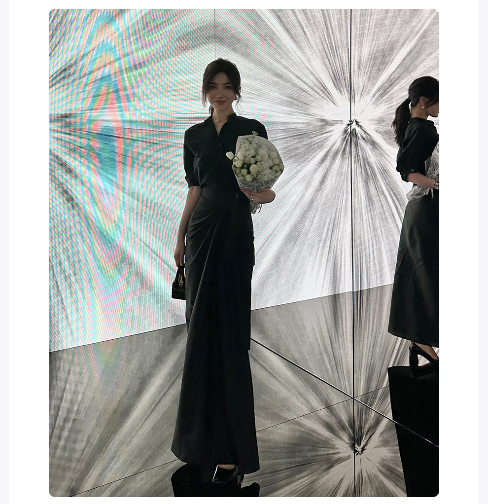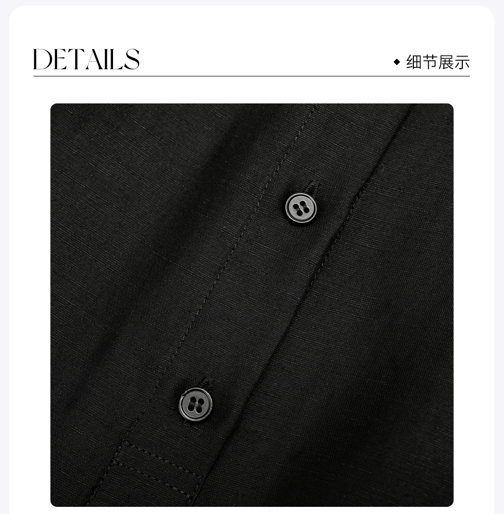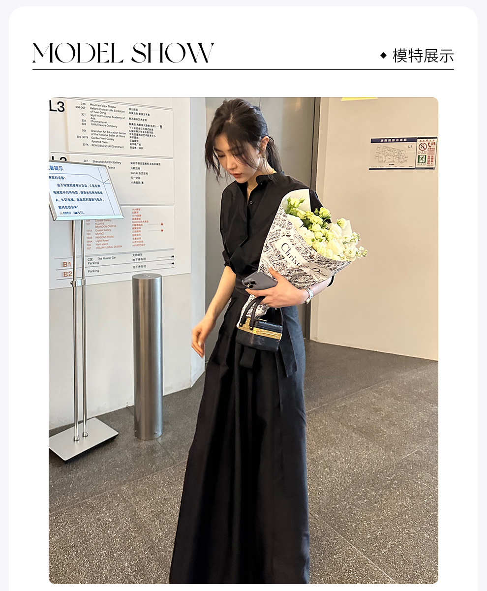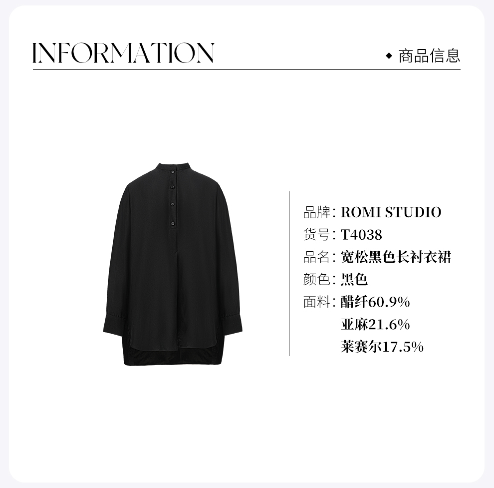 ROMI STUDIO“新中式”醋酸丝麻立领前短后长宽松黑色长衬衣裙T4038