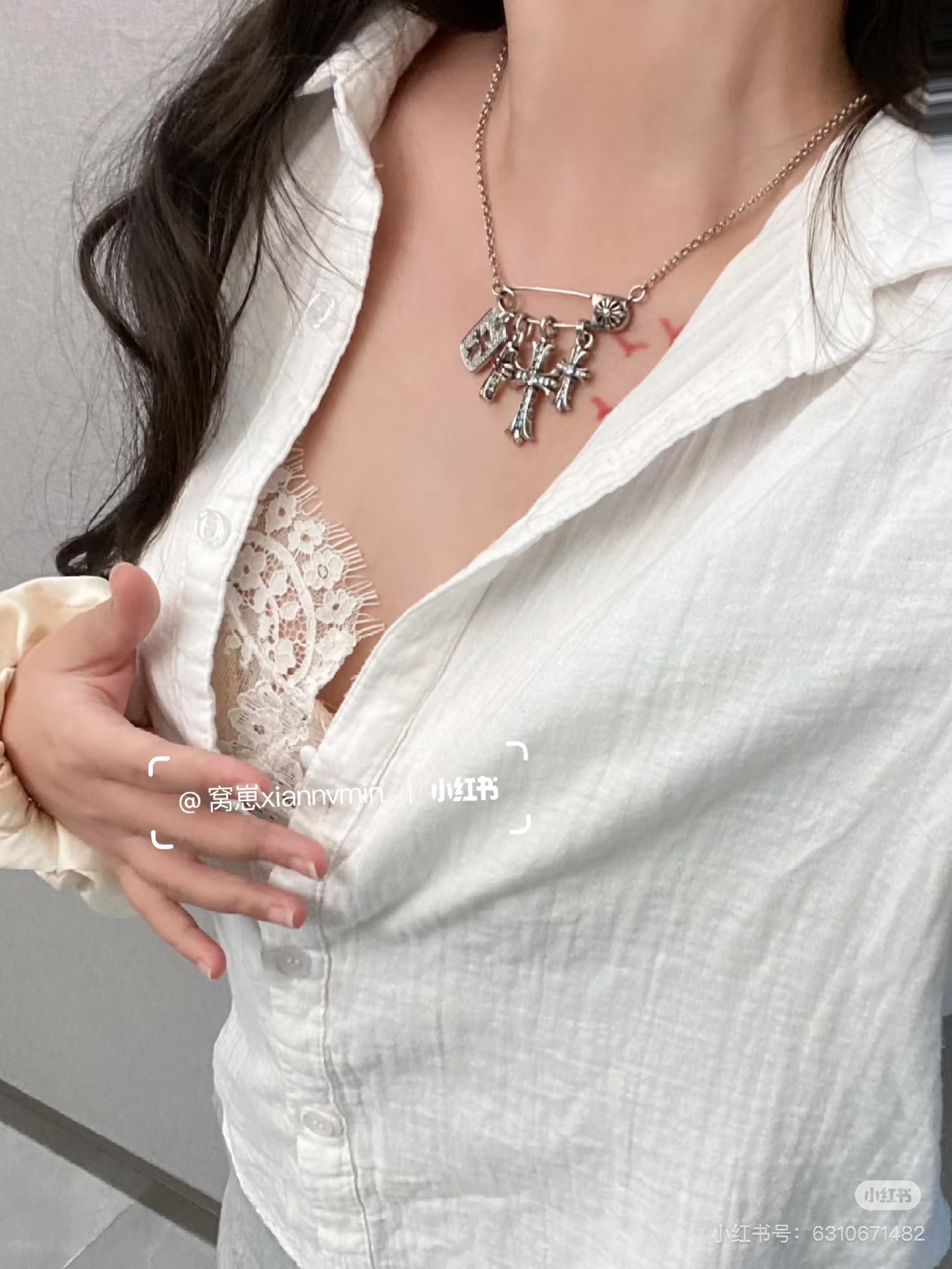 别针是可以打开的哦大家自由搭配,这就是别针🧷项链的魅力所在,有黑钻跟白钻选择,这样的做旧效果恰到好处,四级都非常好搭的款…