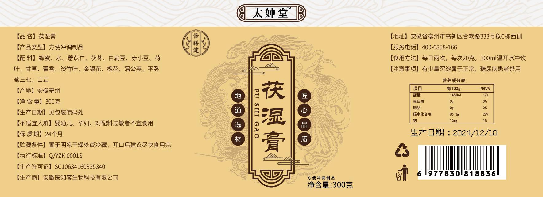 【旗舰正品】太妕堂茯湿膏 传统古法伏湿膏薏仁营养浓缩熬制300g/罐