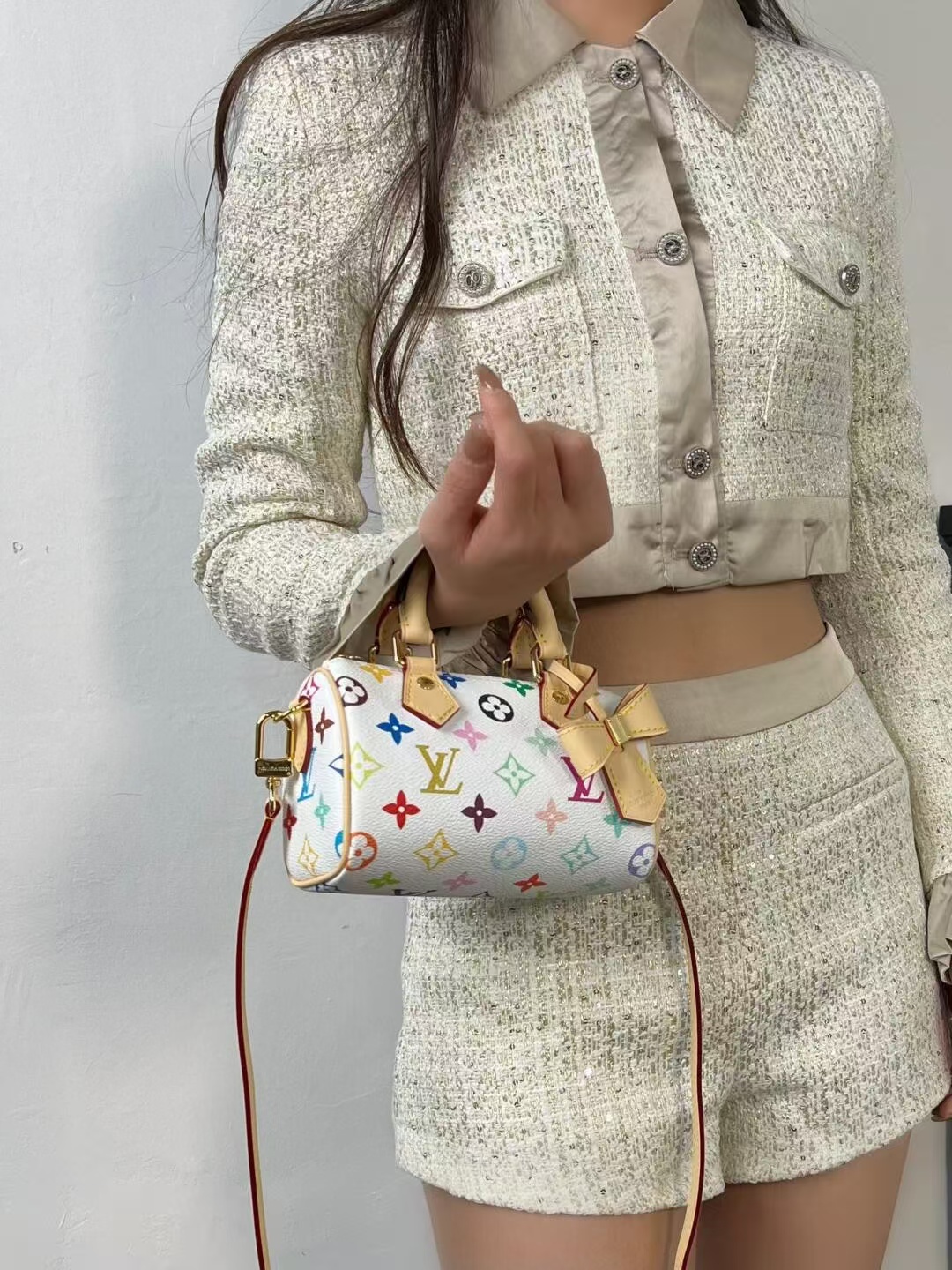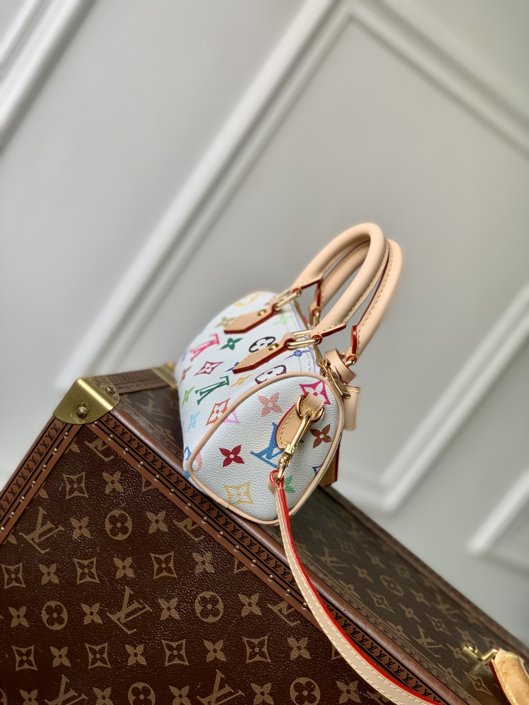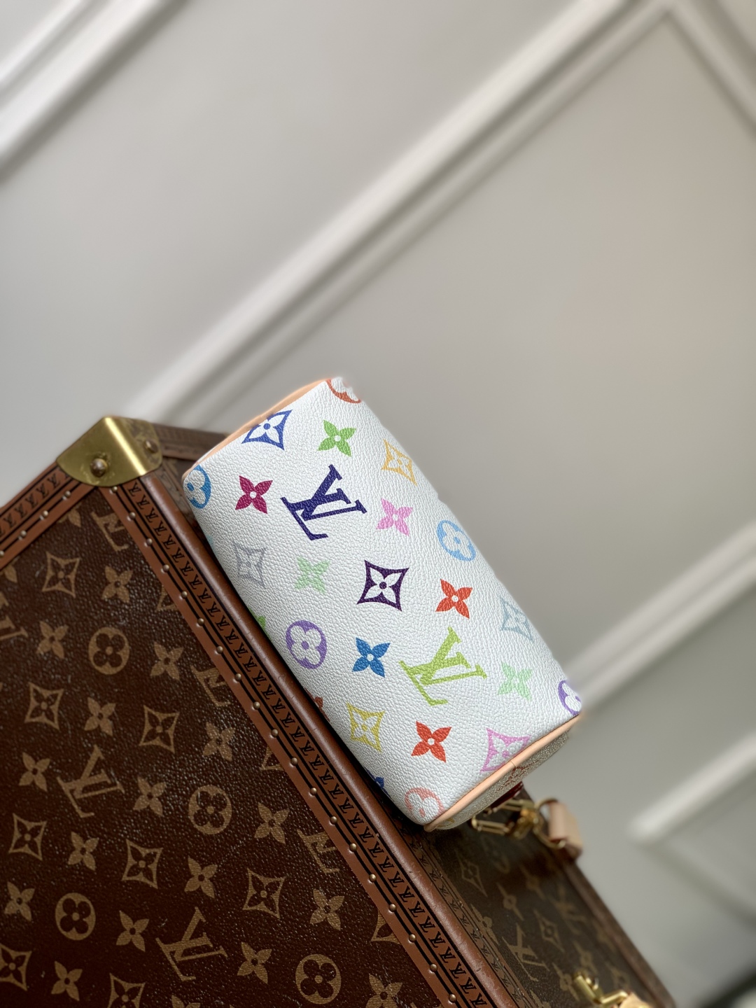 本款 Nano Speedy 手袋选用 Monogram 涂层帆布和牛皮革饰边塑造玲珑构型,以明丽色彩演绎路易威登 x 村上隆再版系列的灵动格调。Toron 手柄和耀目挂锁致敬品牌旅行传承,可拆卸并调节的肩带和别致 LV x TM 钥匙包完善整体。