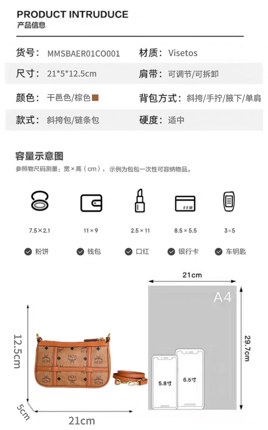 链条肩带斜挎包 独家®️经典干邑色 这款迷你Aren肩背包采用经典Visetos制成,营造出稳重的美感。精致的包袋饰有交叉的Nappa皮革线条,让人联想到城市的网格街道。包袋搭配有可拆卸调节的肩带,双向拉链闭合确保财物安全,棉质衬里可存放您的必需品。 型号:MMSBAER01CO001 尺寸:21*5*12.5cm 肩带:102-118cm 链条:垂长17cm 颜色:干邑色/棕色🏾