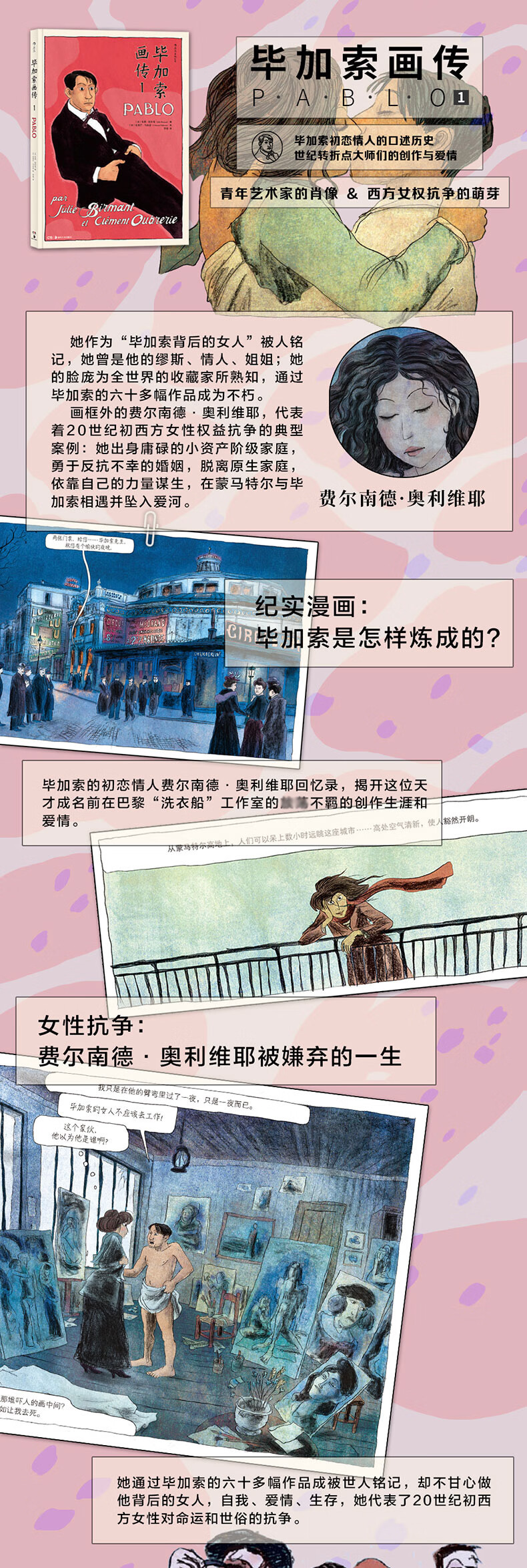 ◎毕加索是怎样炼成的?毕加索情人的口述史,一部别样的美术史,贯穿艺术家的“玫瑰时期”一个天才的成长有时好比一名君王抵达权力中心的过程:至高的美和力量背后,是无数人的牺牲、包容和付出。这部画传以费尔南德·奥利维耶的视角,为我们讲述一个私密、任性、才华横溢的年轻毕加索。◎费尔南德·奥利维耶被嫌弃的一生:她作为“毕加索背后的女人”被人铭记,她曾是他的缪斯、情人、姐姐;她的脸庞为全世界的收藏家所熟知,通过毕加索的六十多幅作品成为不朽。画框外的费尔南德·奥利维耶,代表着20世纪初西方女性权益抗争的典型案例:她出身庸碌的小资产阶级家庭,勇于反抗不幸的婚姻,脱离原生家庭,依靠自己的力量谋生,在蒙马特尔与毕加索相遇并坠入爱河。◎二十世纪艺术史的发蒙:世纪转折点的蒙马特尔,古典艺术与现代艺术的风云际会,艺术创作的黄金时代,天才和天才的交汇和大放光彩;毕加索、阿波利奈尔、雷诺阿、劳特累克……这些如雷贯耳的名字都会出现在这部画传中。