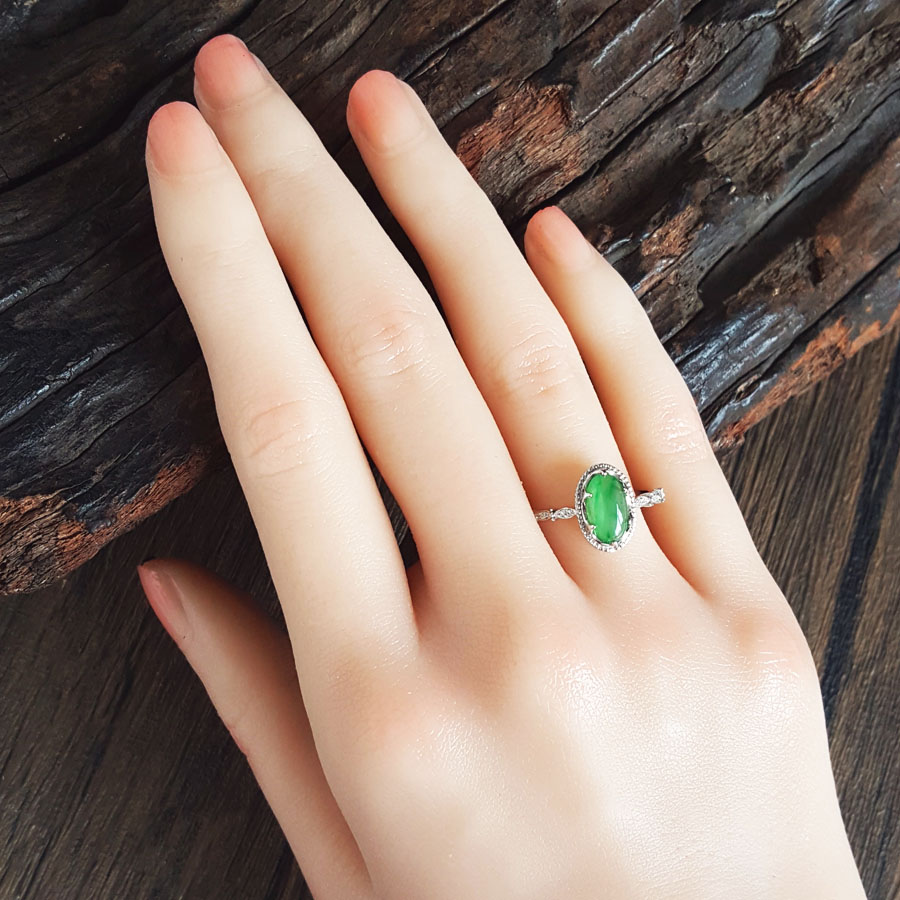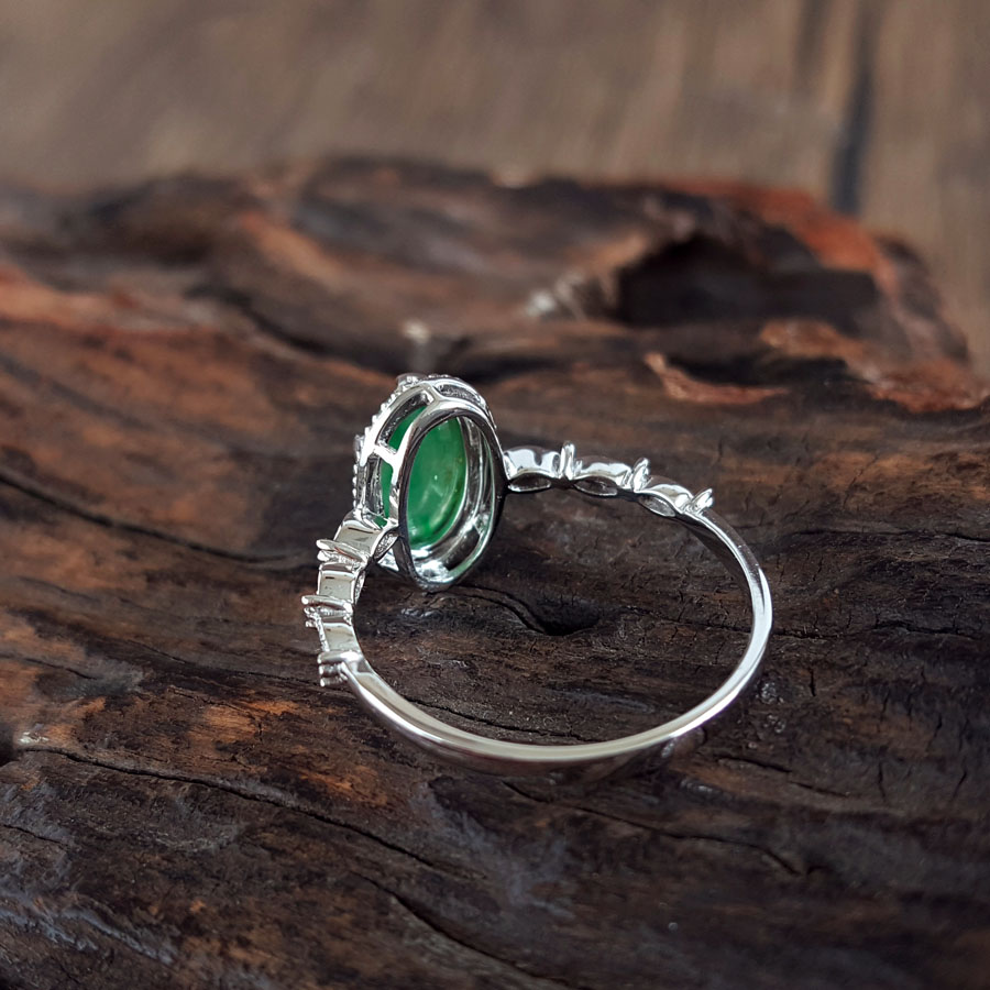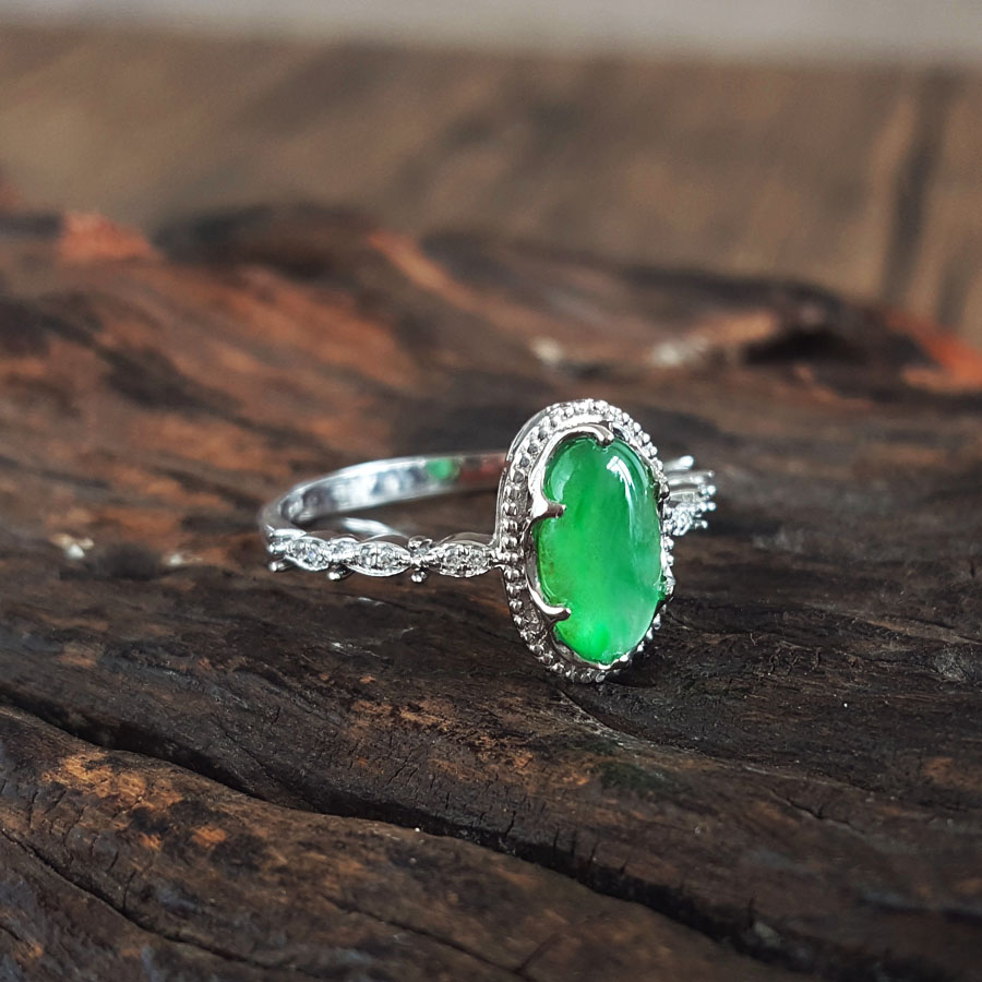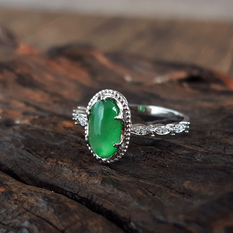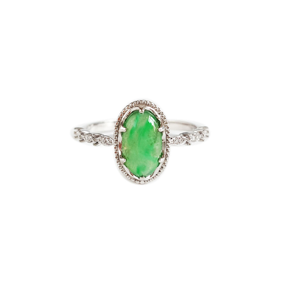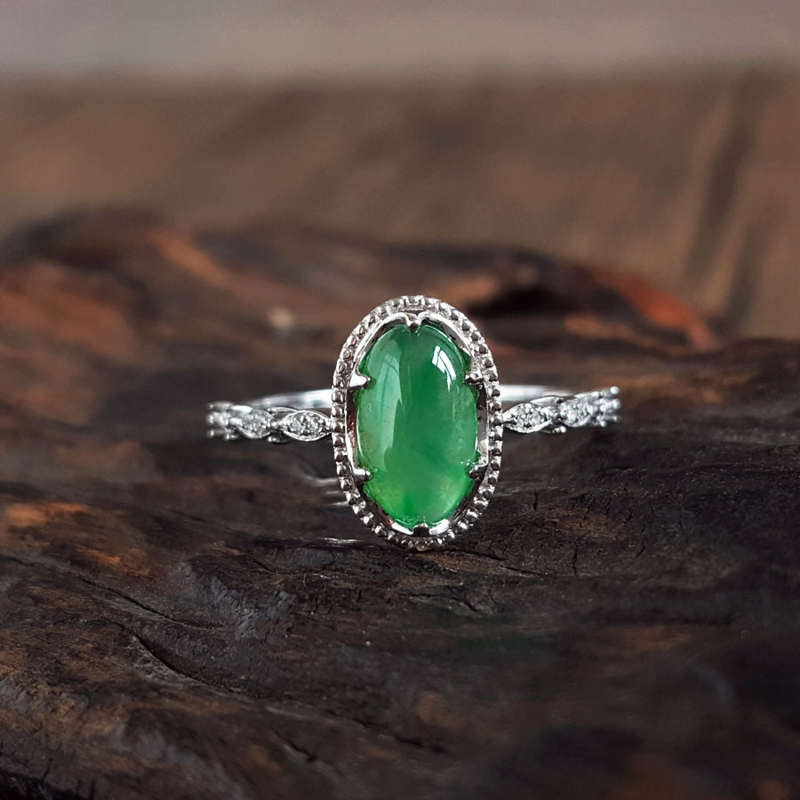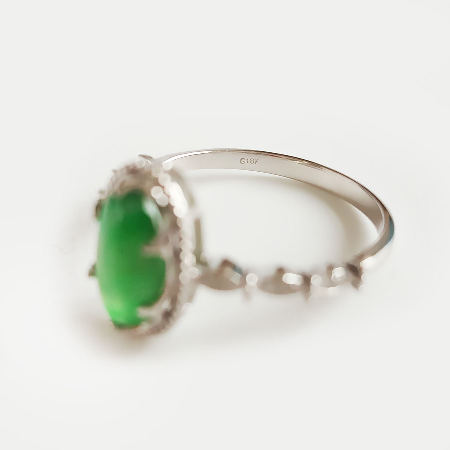 名称 | AU750白金镶钻镶天然细腻冰种飘花蛋面满绿翡翠戒指 |