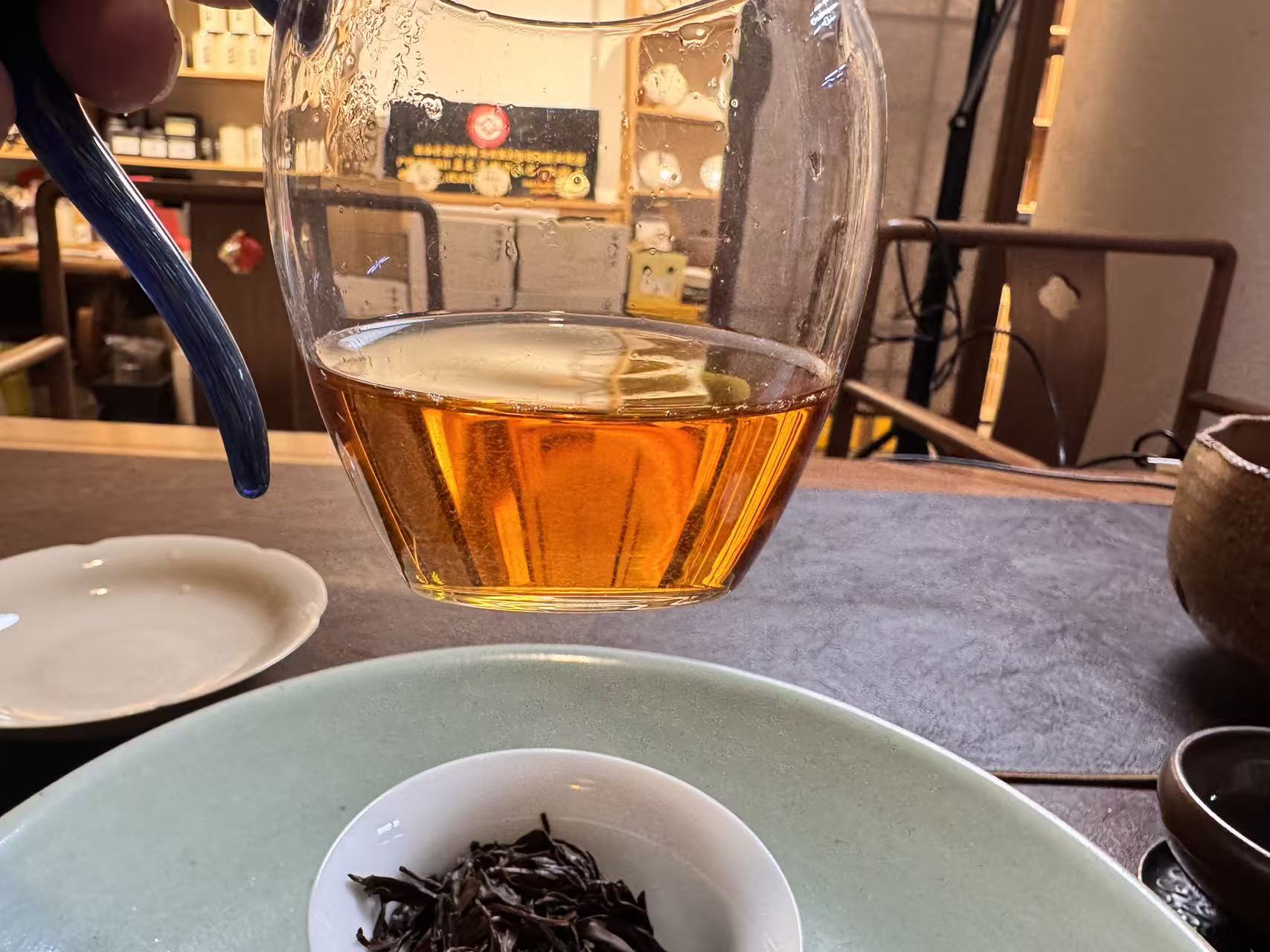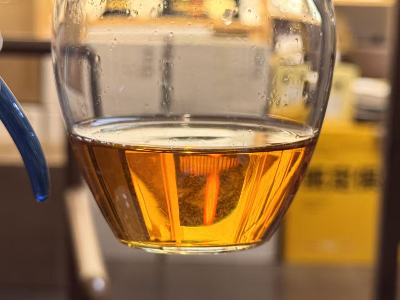 第五道:大家看汤色,这是不闷泡的汤色,金黄明亮,透亮度极好;