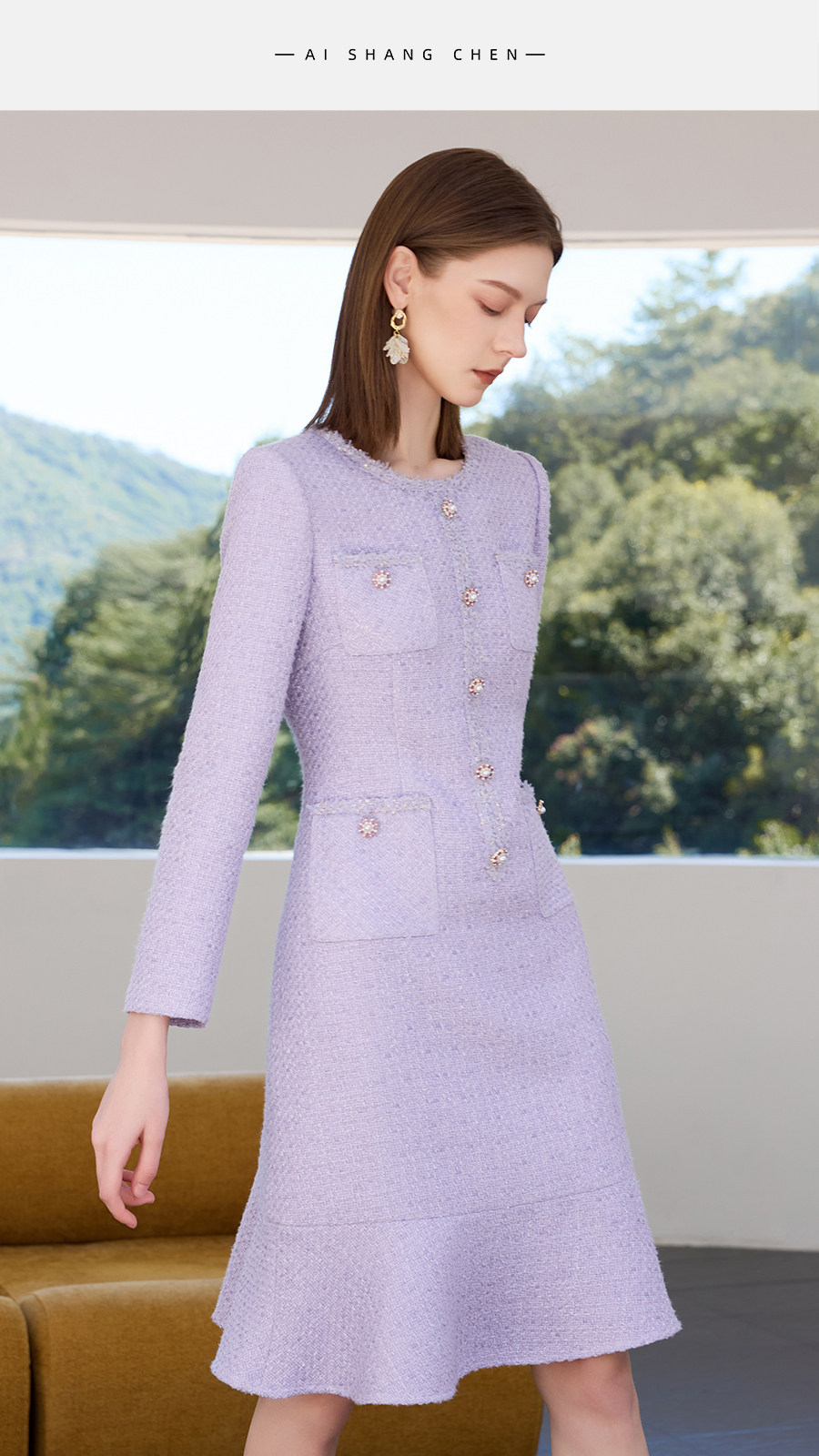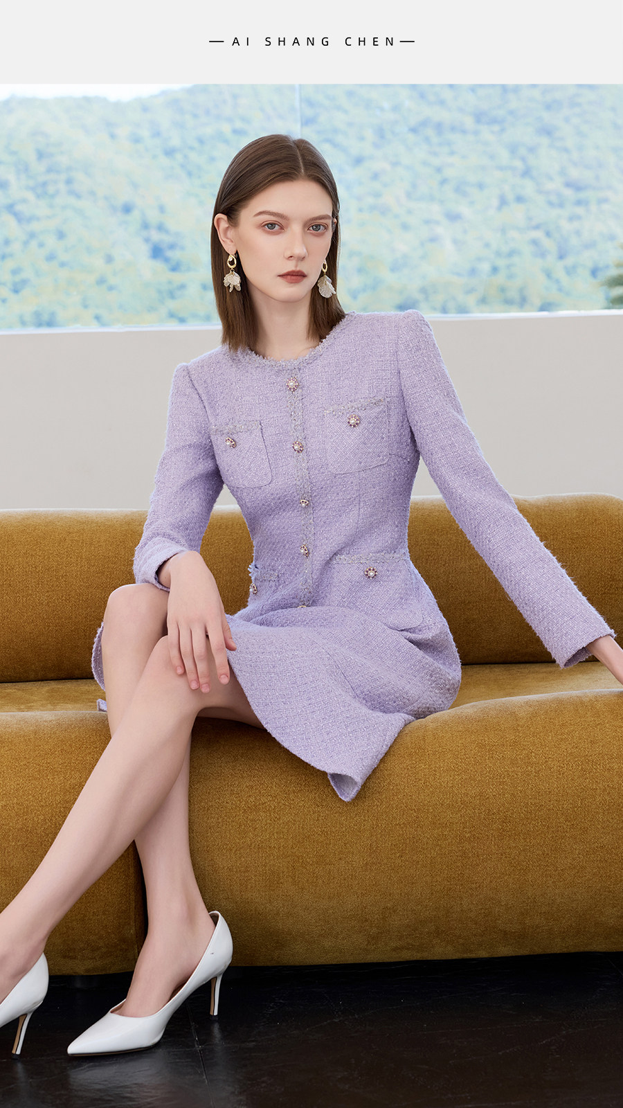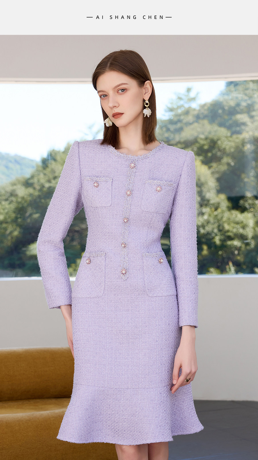 艾尚臣星河紫小香风连衣裙女高级感气质主持人修身显瘦通勤A字裙