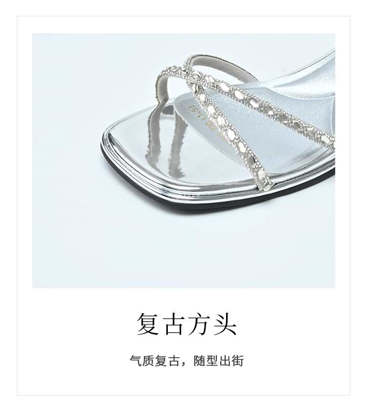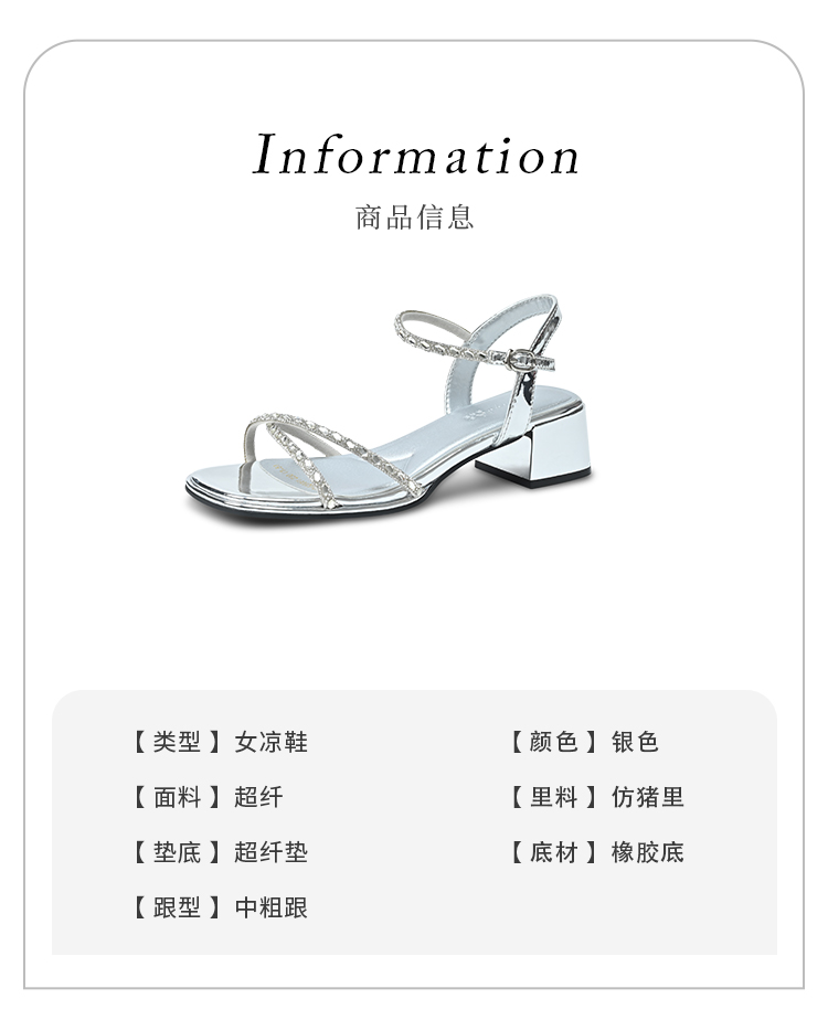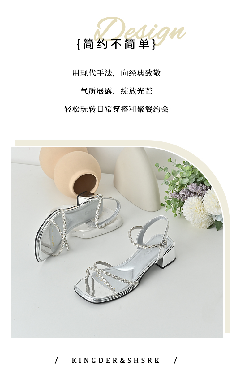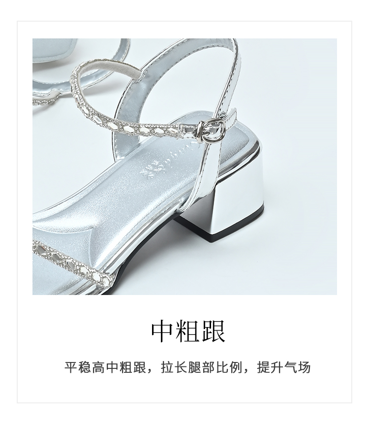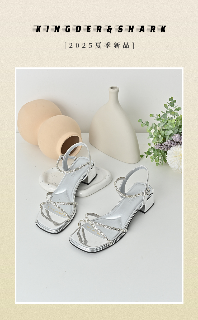 经典鲨2025夏季新款时尚银色水钻中粗跟显瘦通勤气质凉鞋女KW127-529061