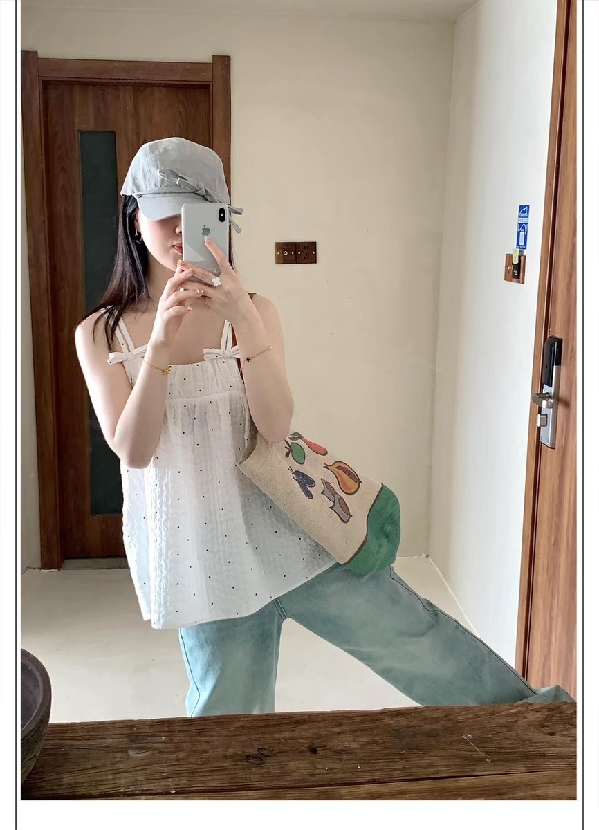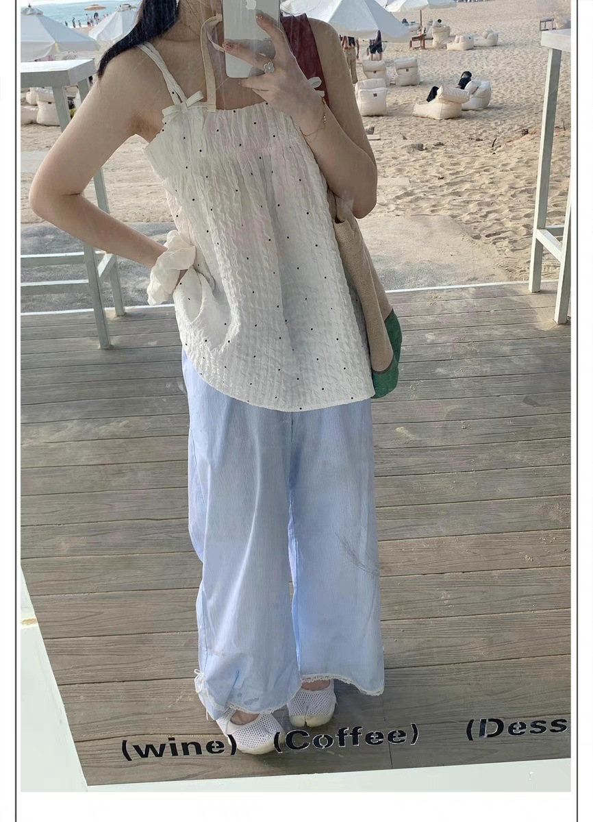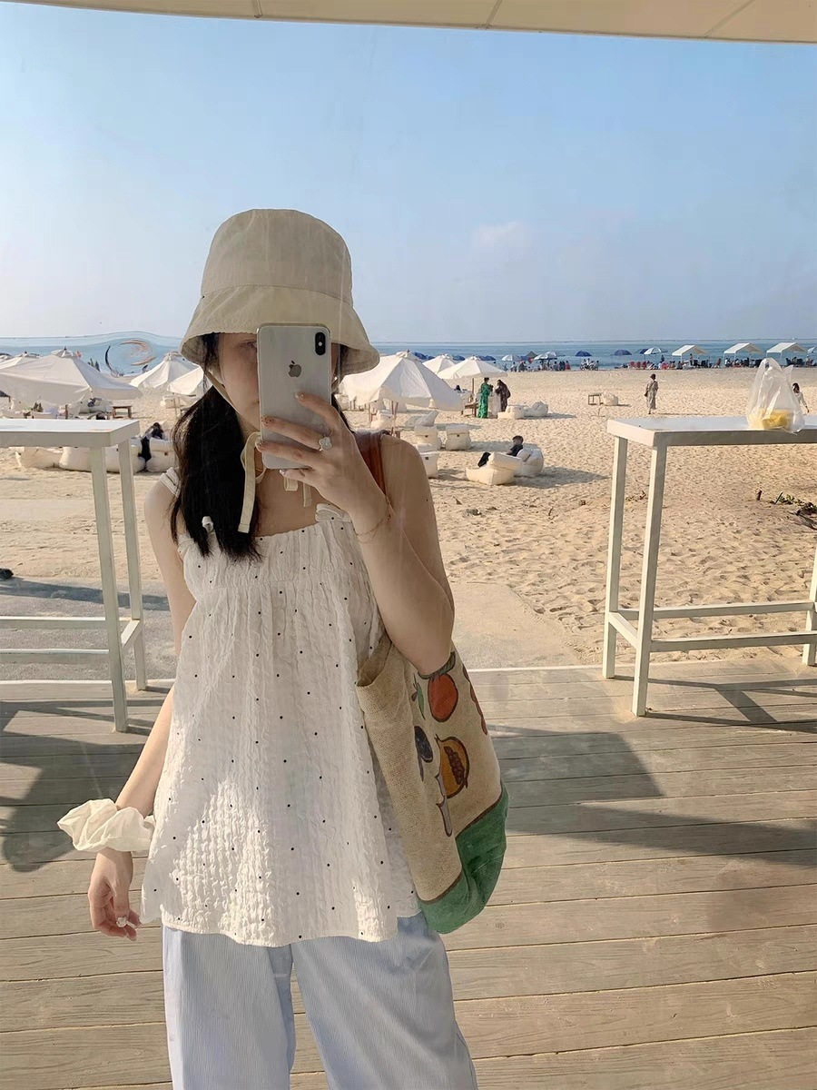 【犯规可爱白色褶肌理感波点吊带】度假风新款甜美小清新波点吊带,蝴蝶结减龄娃娃衫露肩,甜美宽松夏季蝴蝶结无袖宽松上衣女外穿QQ