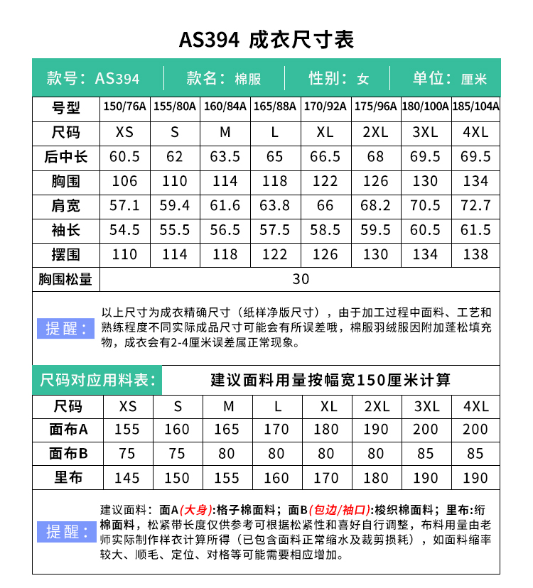 裁缝学苑AS394复古加厚夹棉夹克外套女冬圆领棉服纸样绗棉小棉袄