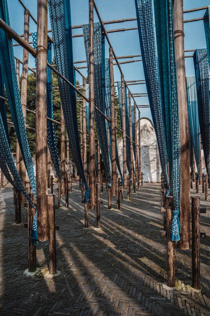 晒场上随风舞动的蓝印花布