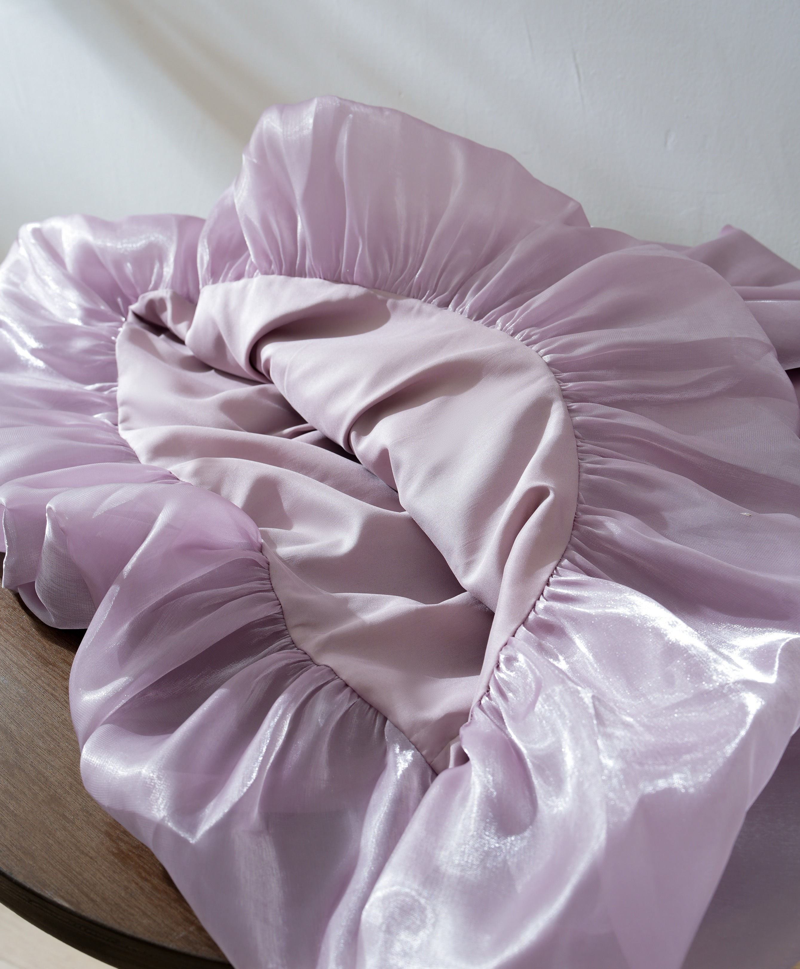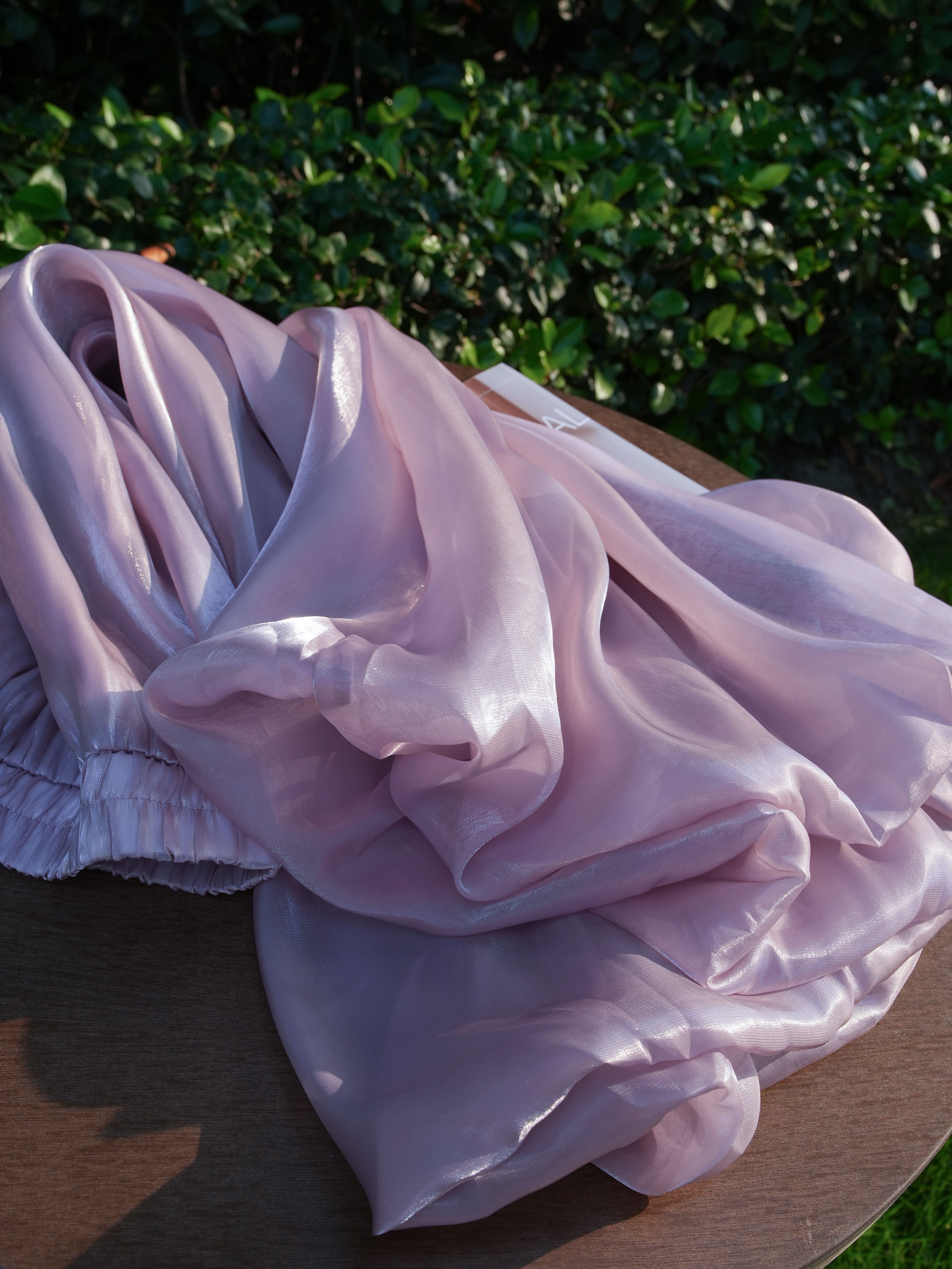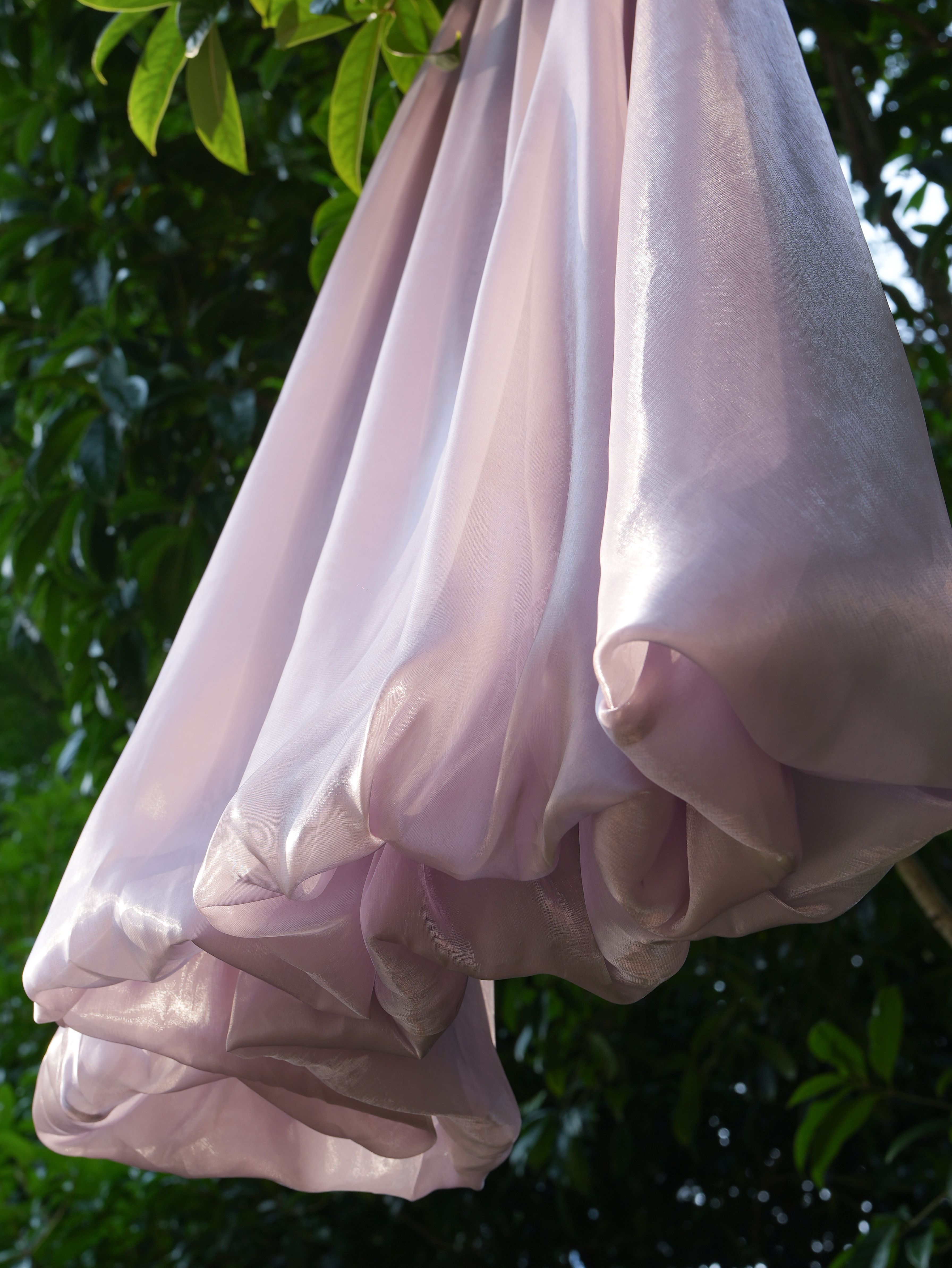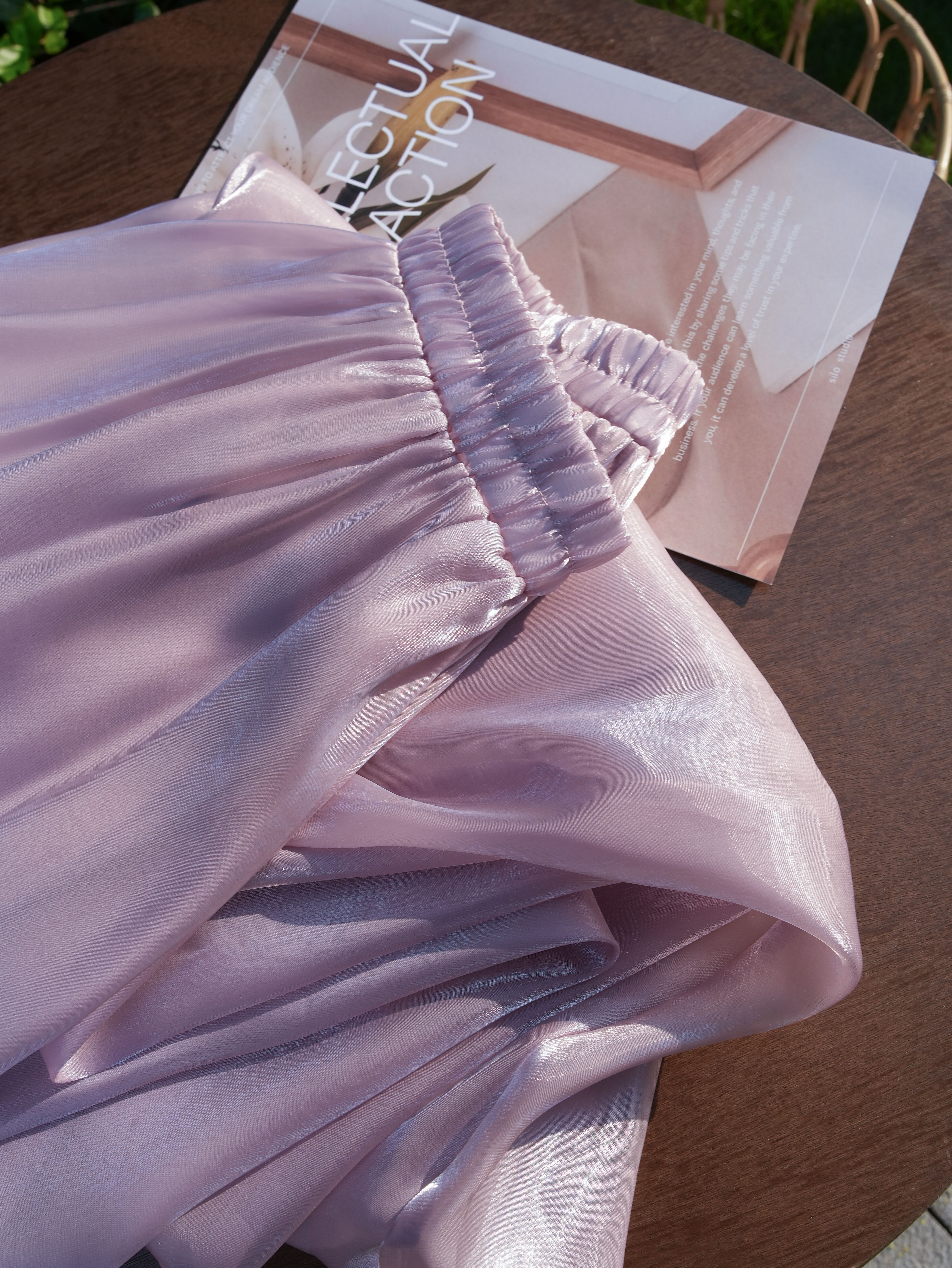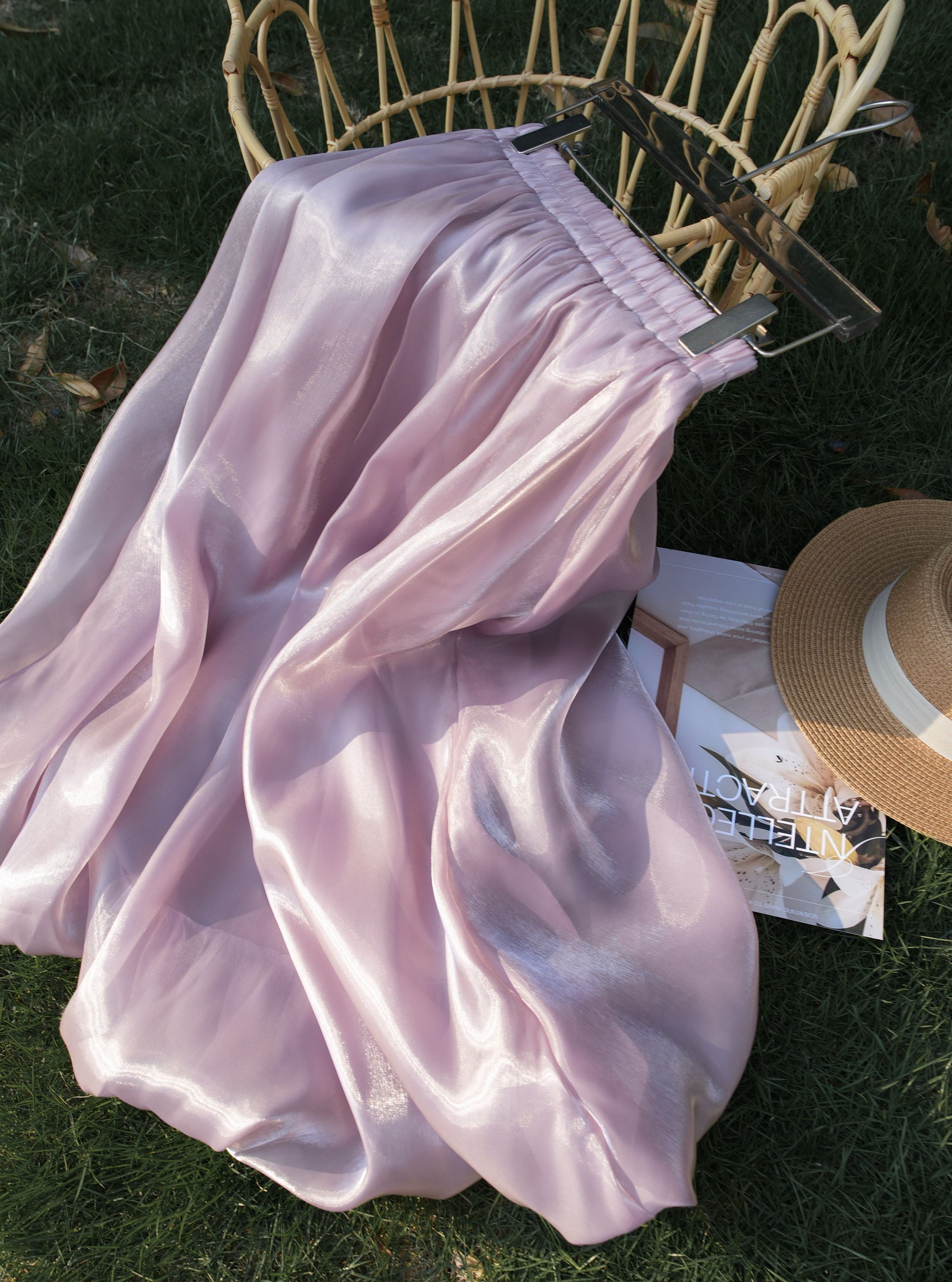 琉璃面料表面自带微皱肌理,清雅气质不单调~走动时透出忽明忽暗的珠光感,温柔华美,自带光芒~真的神采奕奕。