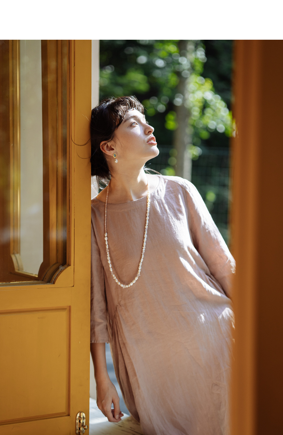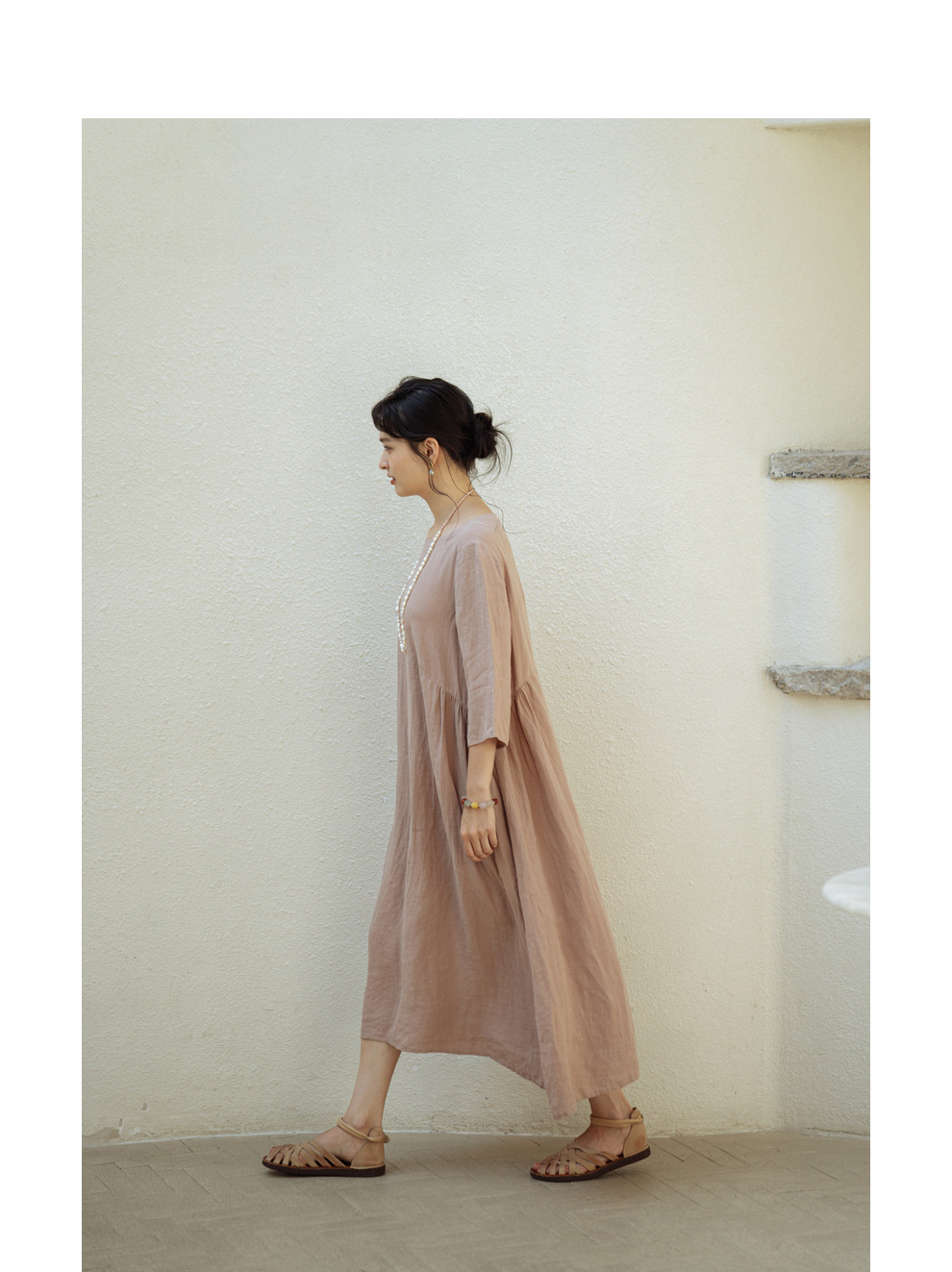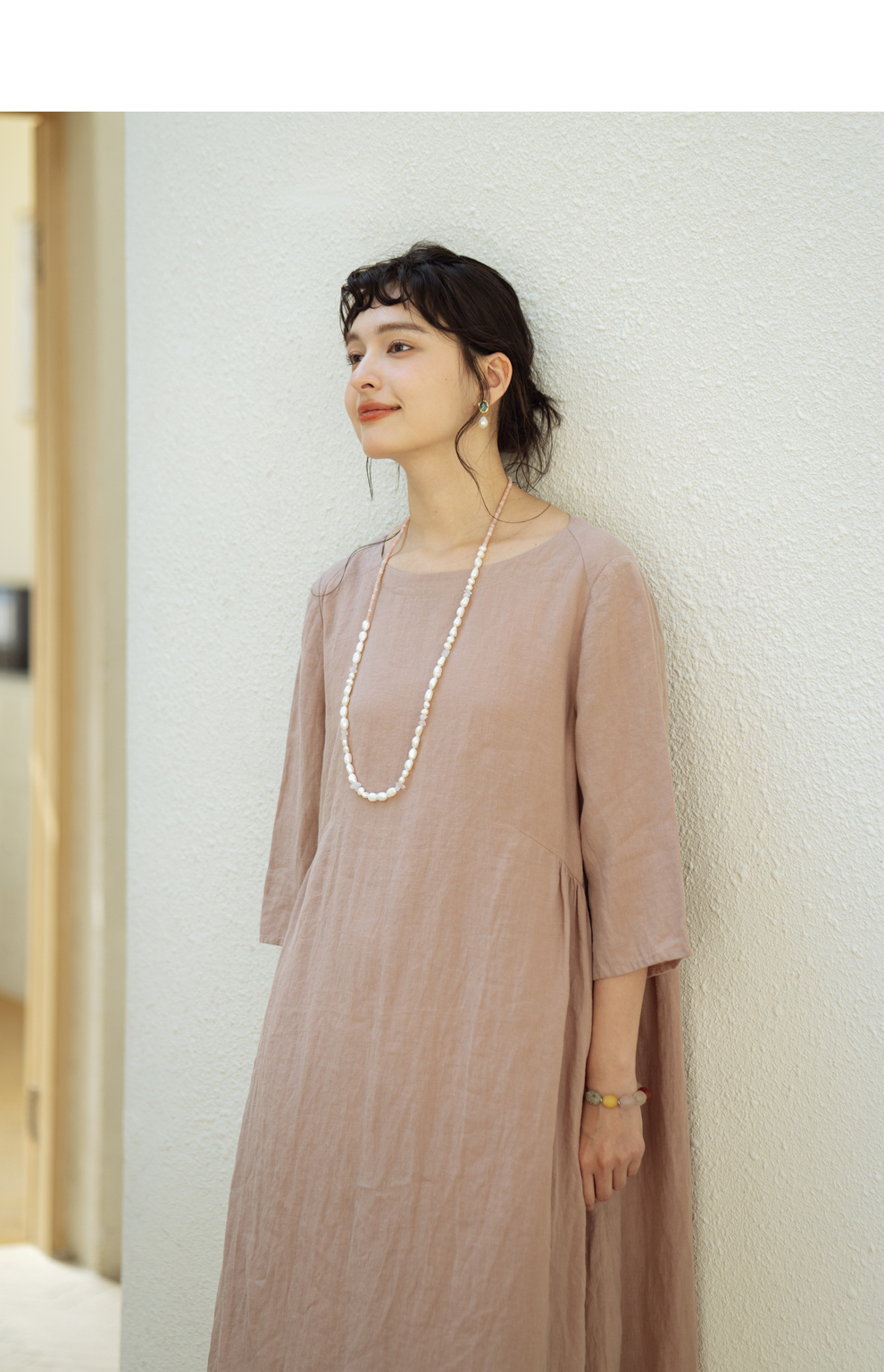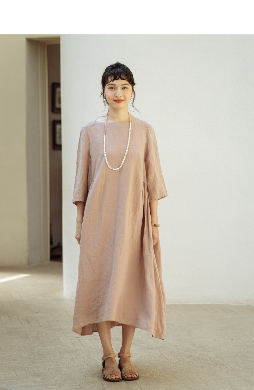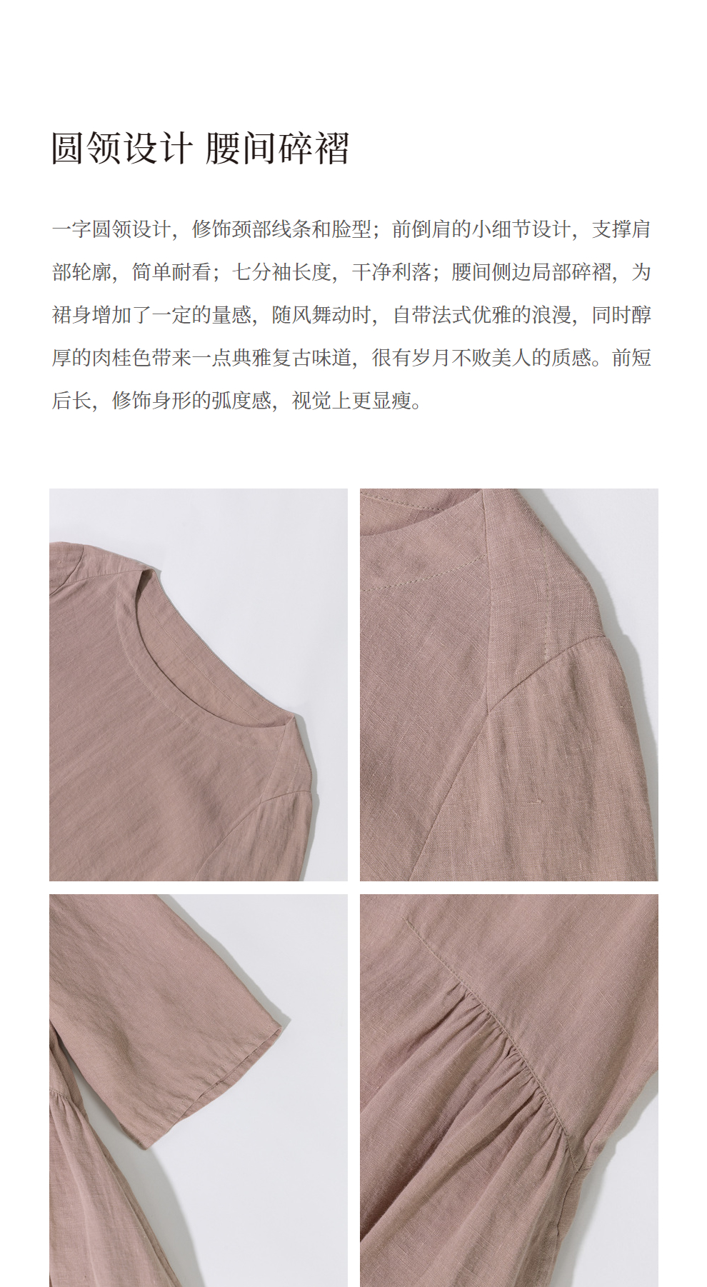 绽放372【甜茶系列·肉桂】高支砂洗亚麻一字领七分袖碎褶连衣裙