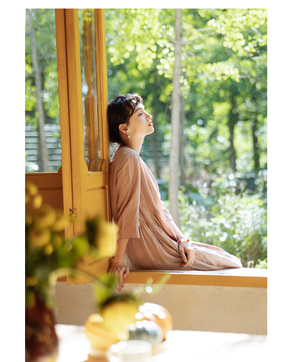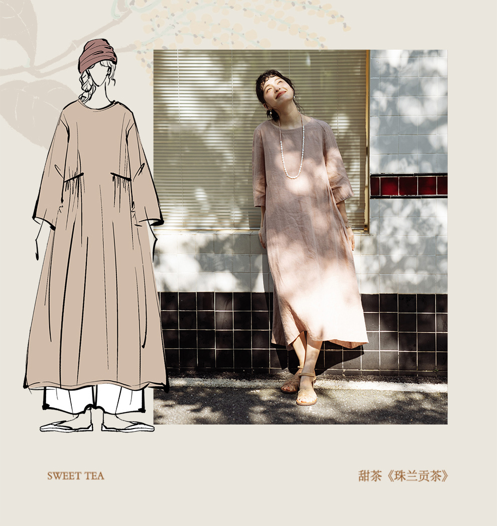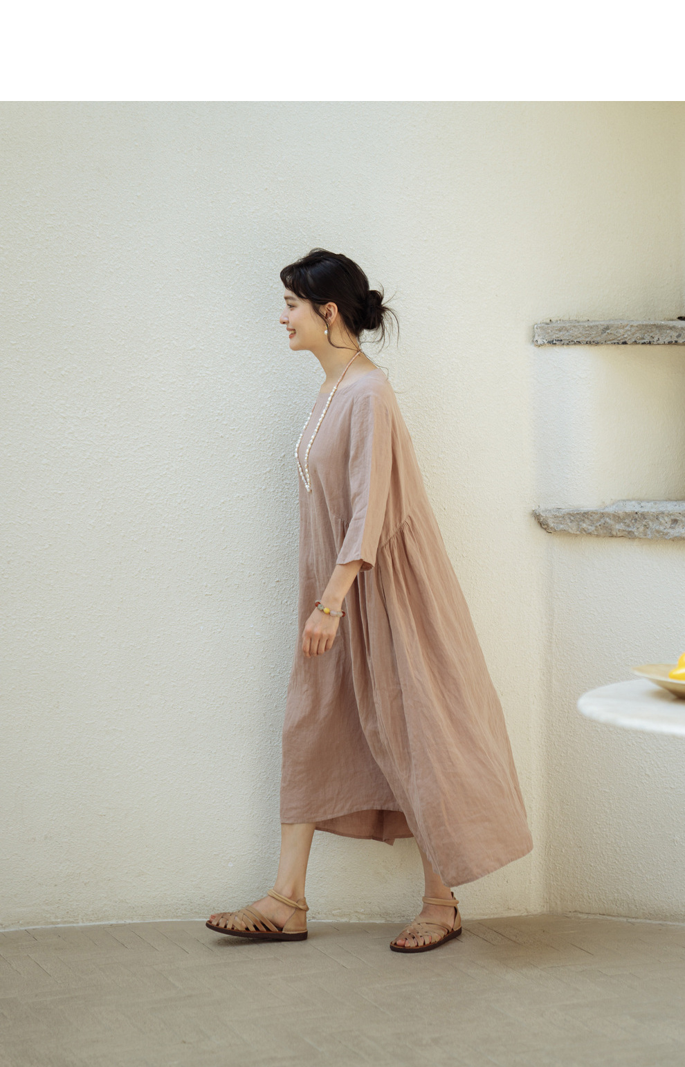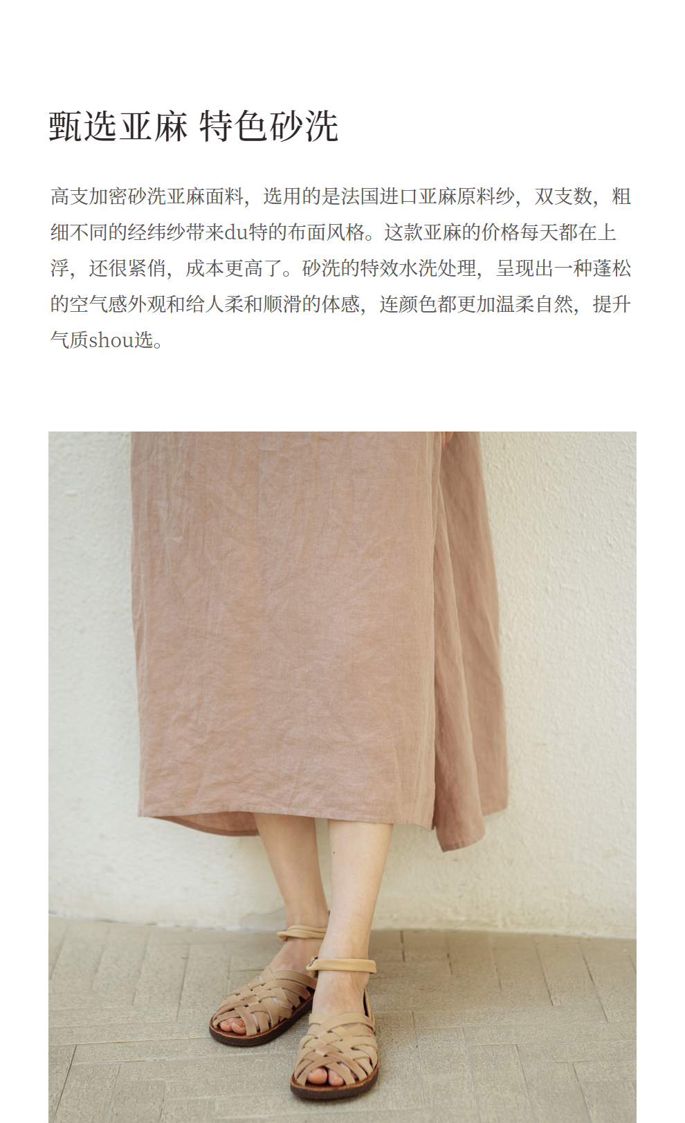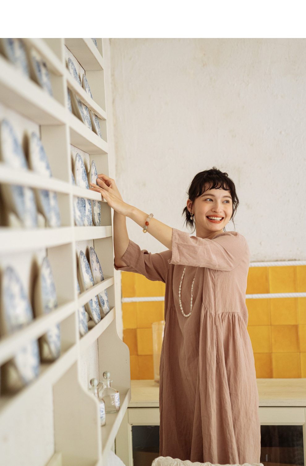 绽放372【甜茶系列·肉桂】高支砂洗亚麻一字领七分袖碎褶连衣裙