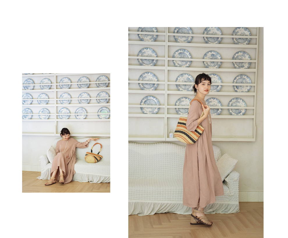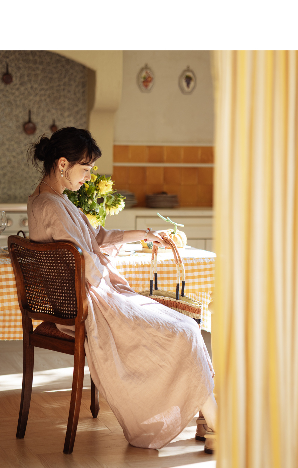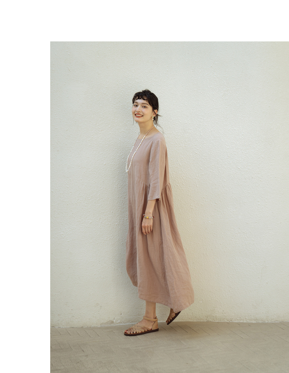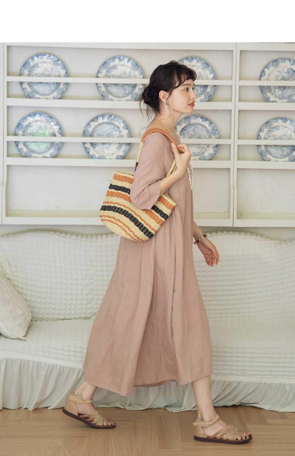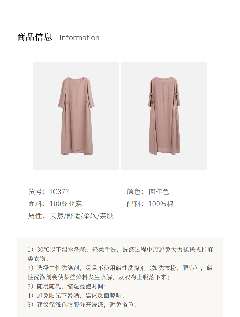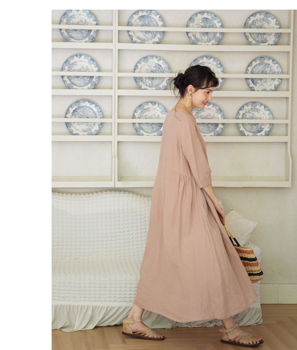绽放372【甜茶系列·肉桂】高支砂洗亚麻一字领七分袖碎褶连衣裙