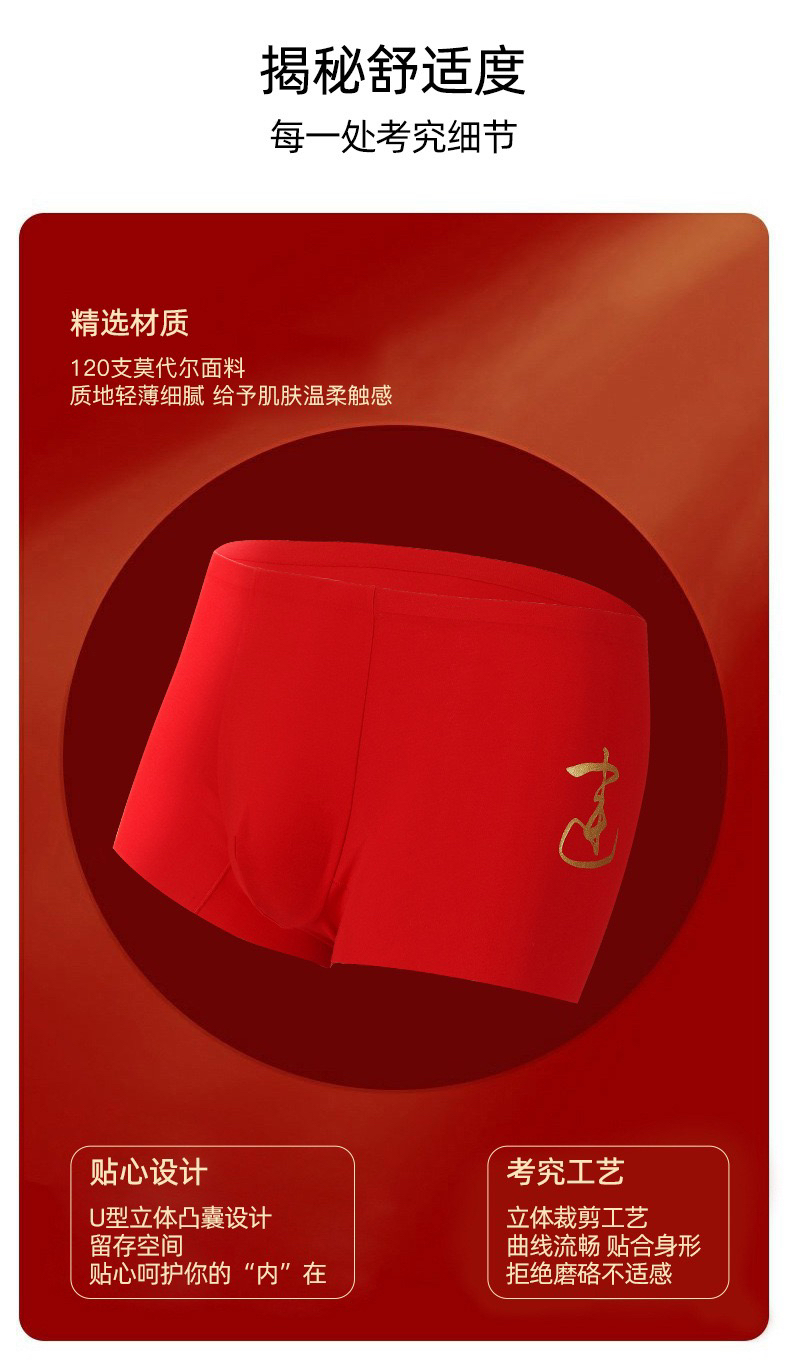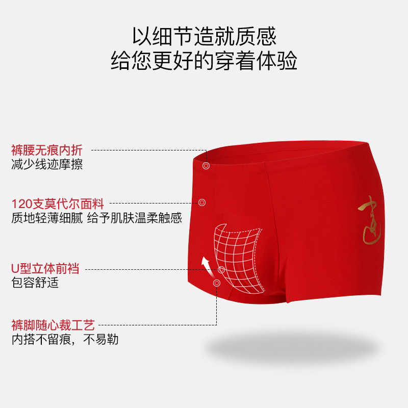 柜上1028! 两条装爱家120S莫代尔男士内裤新年本命年结婚鎏金红运随心裁男士内裤 U型内裆平角裤短