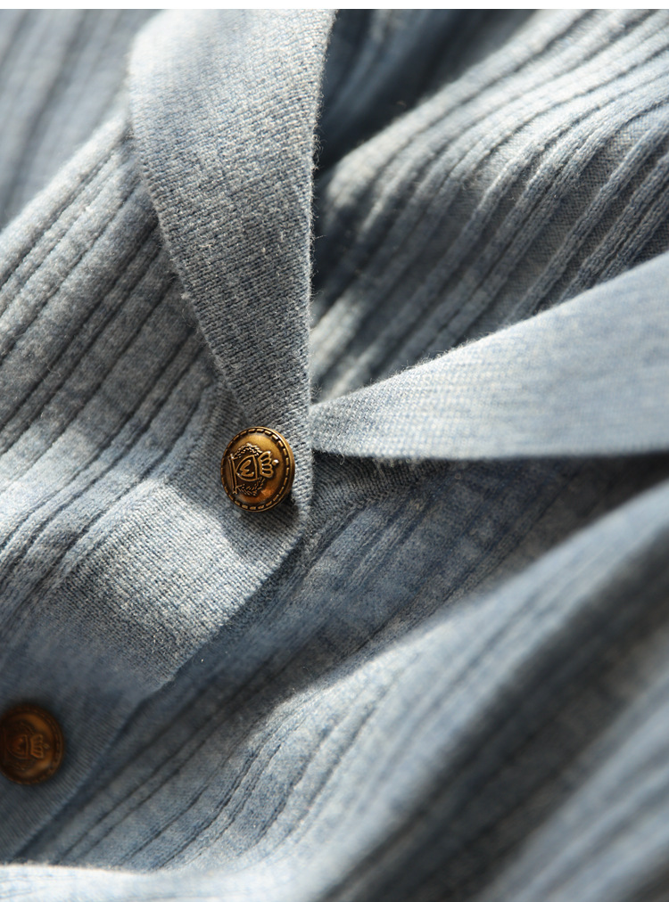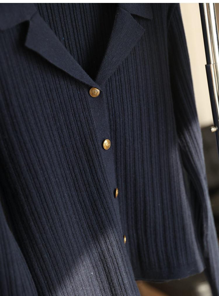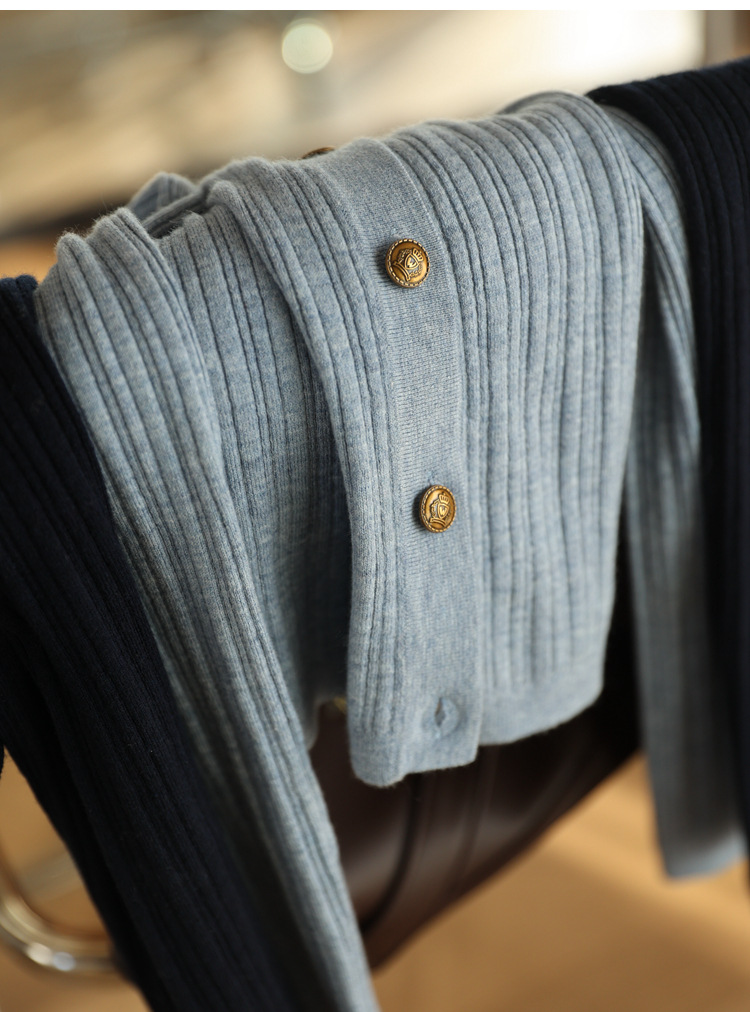 修身但又不紧绷,微微的离体感,修饰身型。门襟复古铜色金属扣,浮雕小皇冠纹样,增添了一份精致华丽。