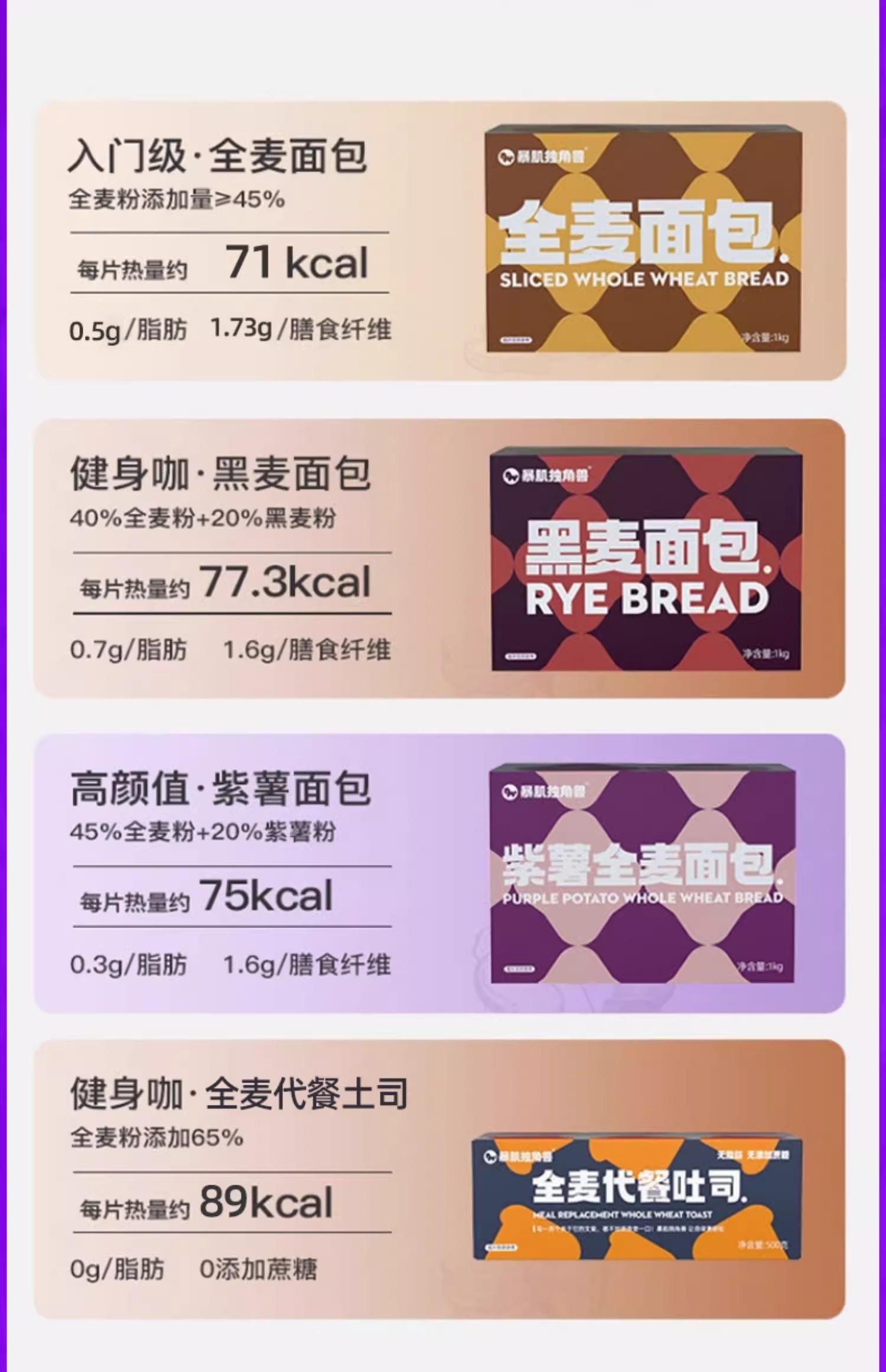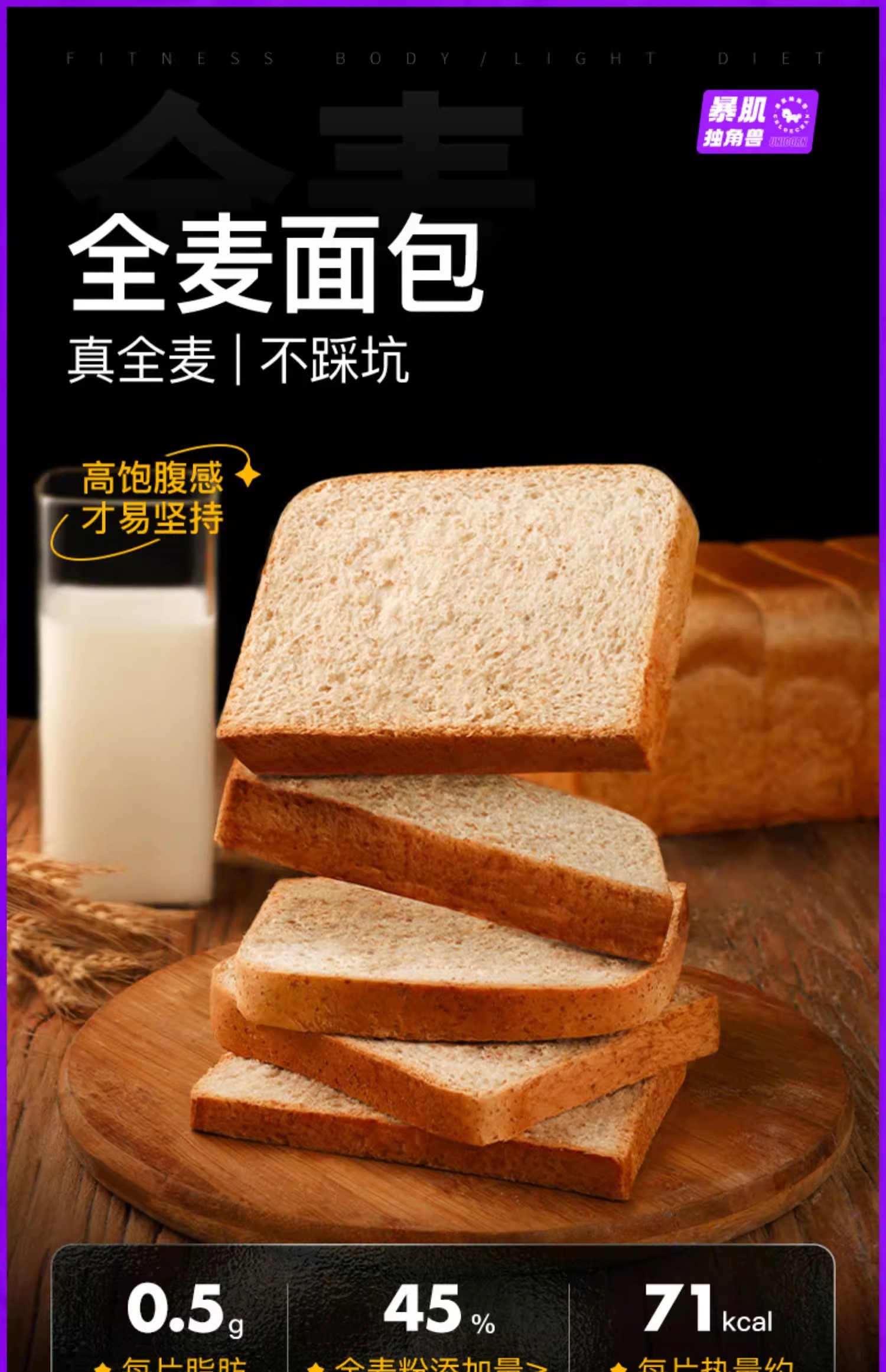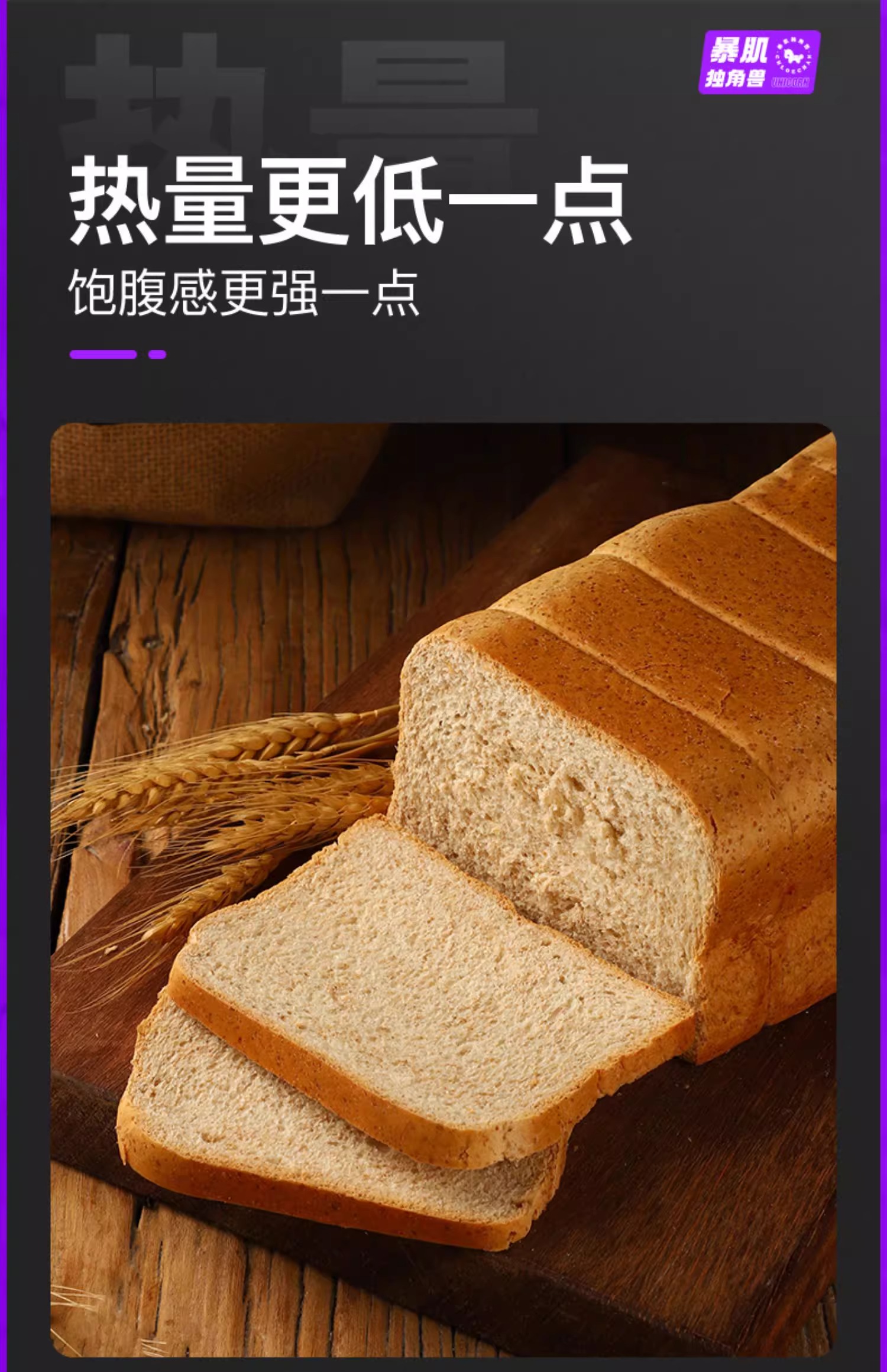 【暴肌独角兽 全麦面包】全麦/黑麦/紫薯面包 科学配比 | 粗纤袋装即食1kg*1箱