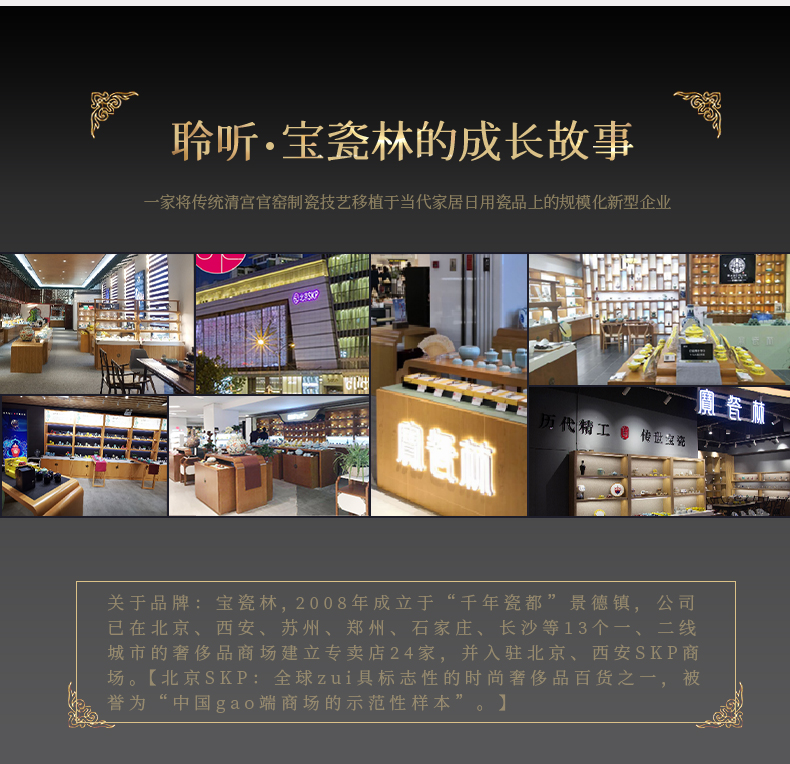 宝瓷林,2008年创立,是一家将传统清宫官窑制瓷技艺,移植于当代家居日用瓷品上的景德镇陶瓷骨干企业,是当下唯一一家代表“千年瓷都-景德镇”走向全球的陶瓷连锁品牌,被誉为陶瓷界的“国酒茅台”。