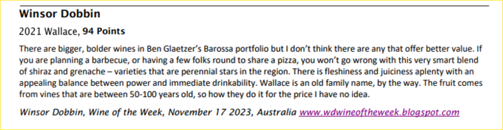 “在Ben Glaetzer的巴罗萨系列中,的确又许多庞大且豪迈的酒,但我认为没有哪款兼具优越的性价比。如果你计划举办烧烤派对,或邀请朋友享用披萨,选择这款西拉与歌海娜的巧妙混酿准是没错的。这两种葡萄品种是该产区的常青明星。酒体丰腴多汁,在强劲且即可饮用的愉悦感之间达到绝佳平衡。顺便提一句,华莱士是个古老的家族姓氏,这些葡萄藤龄在50-100年之间,至于如何达到这样的价格我就无从而知了。”
