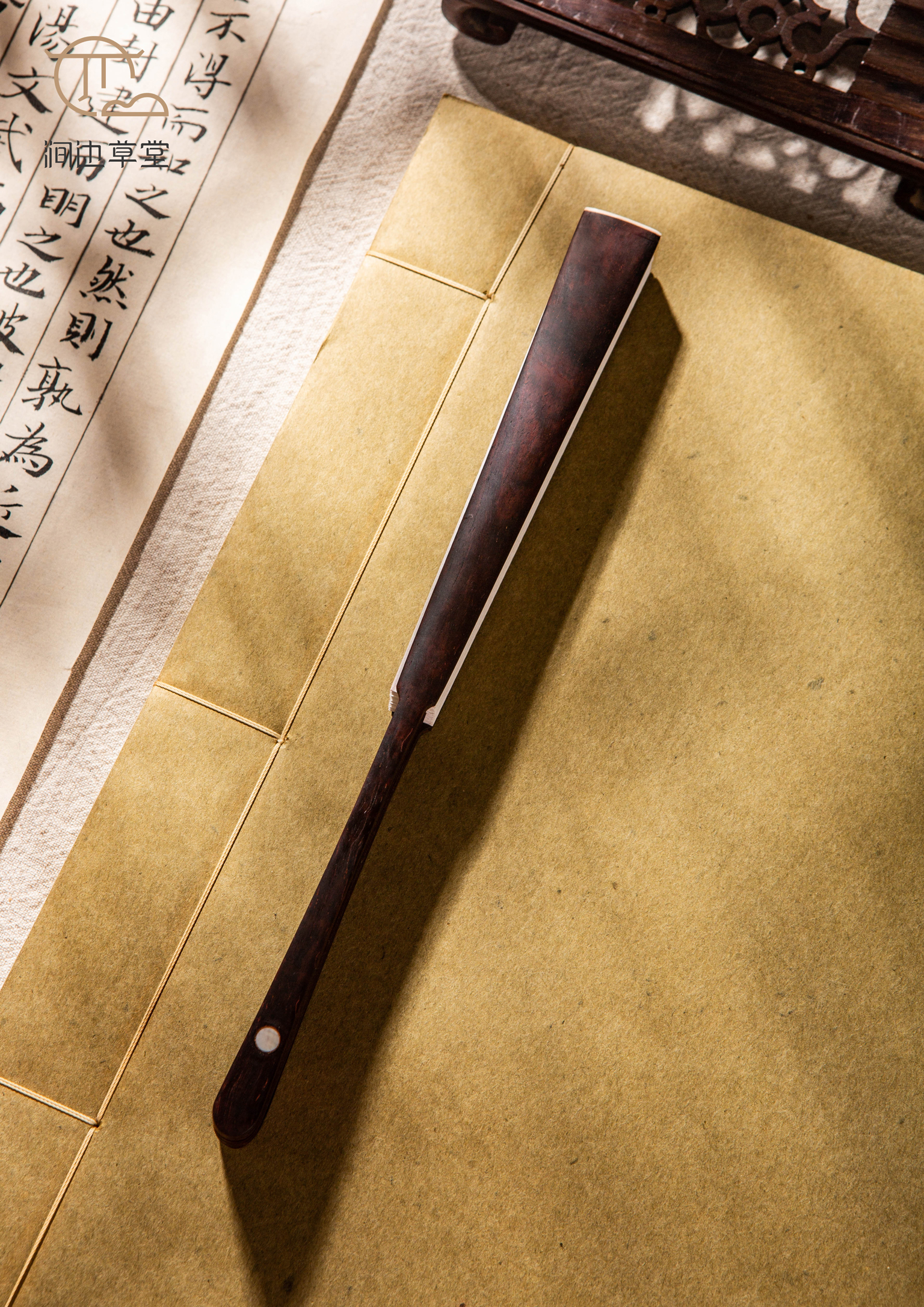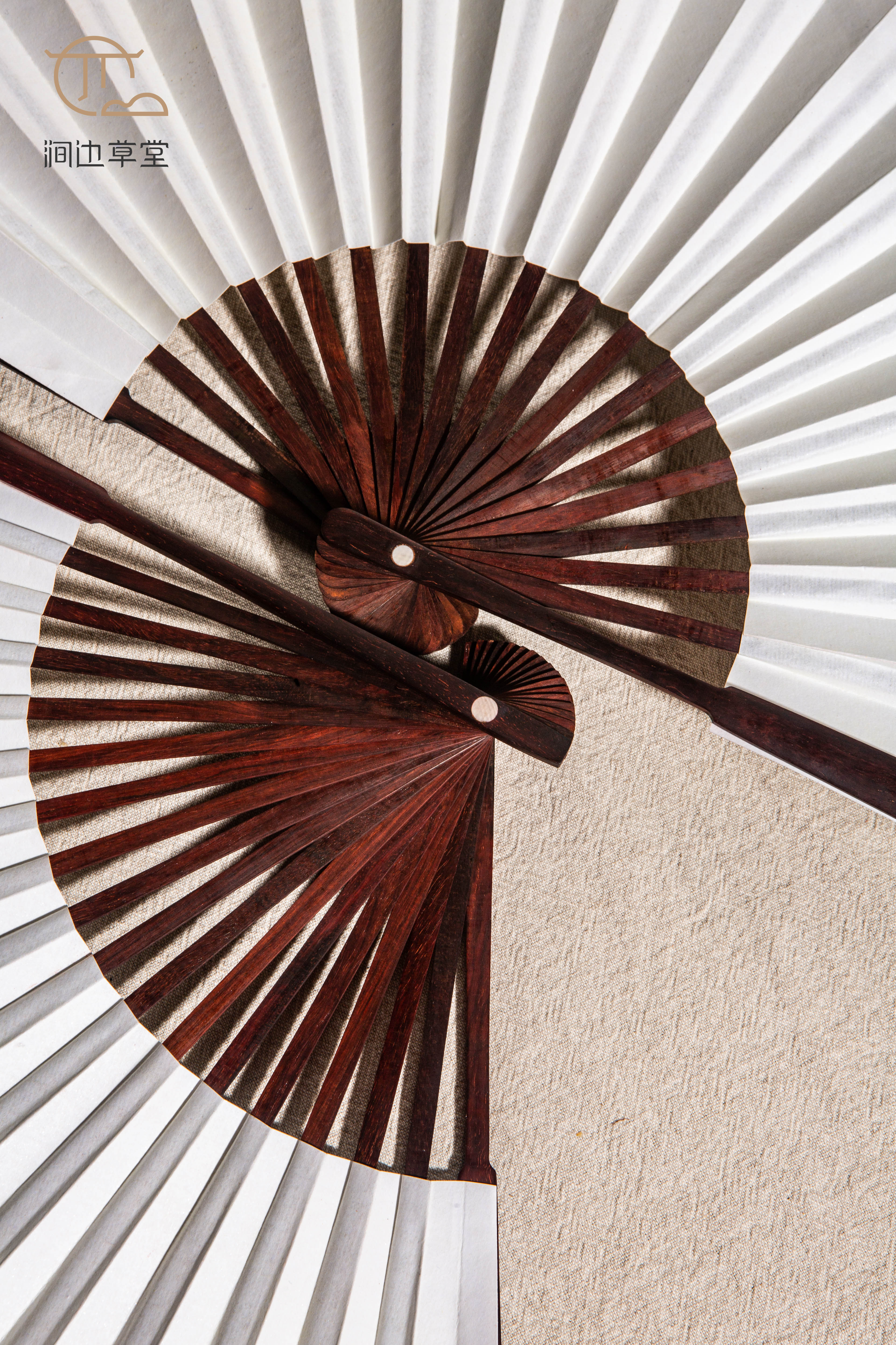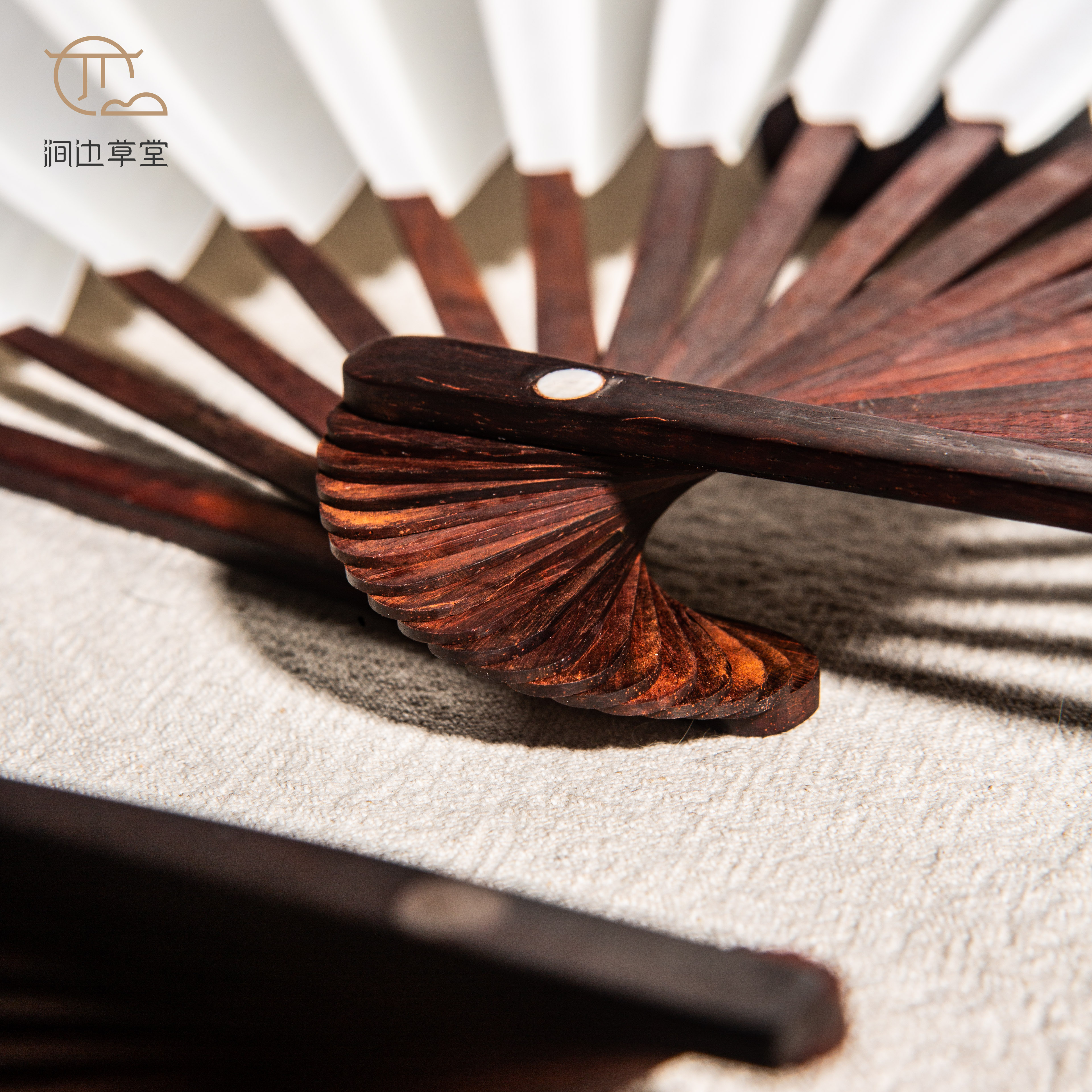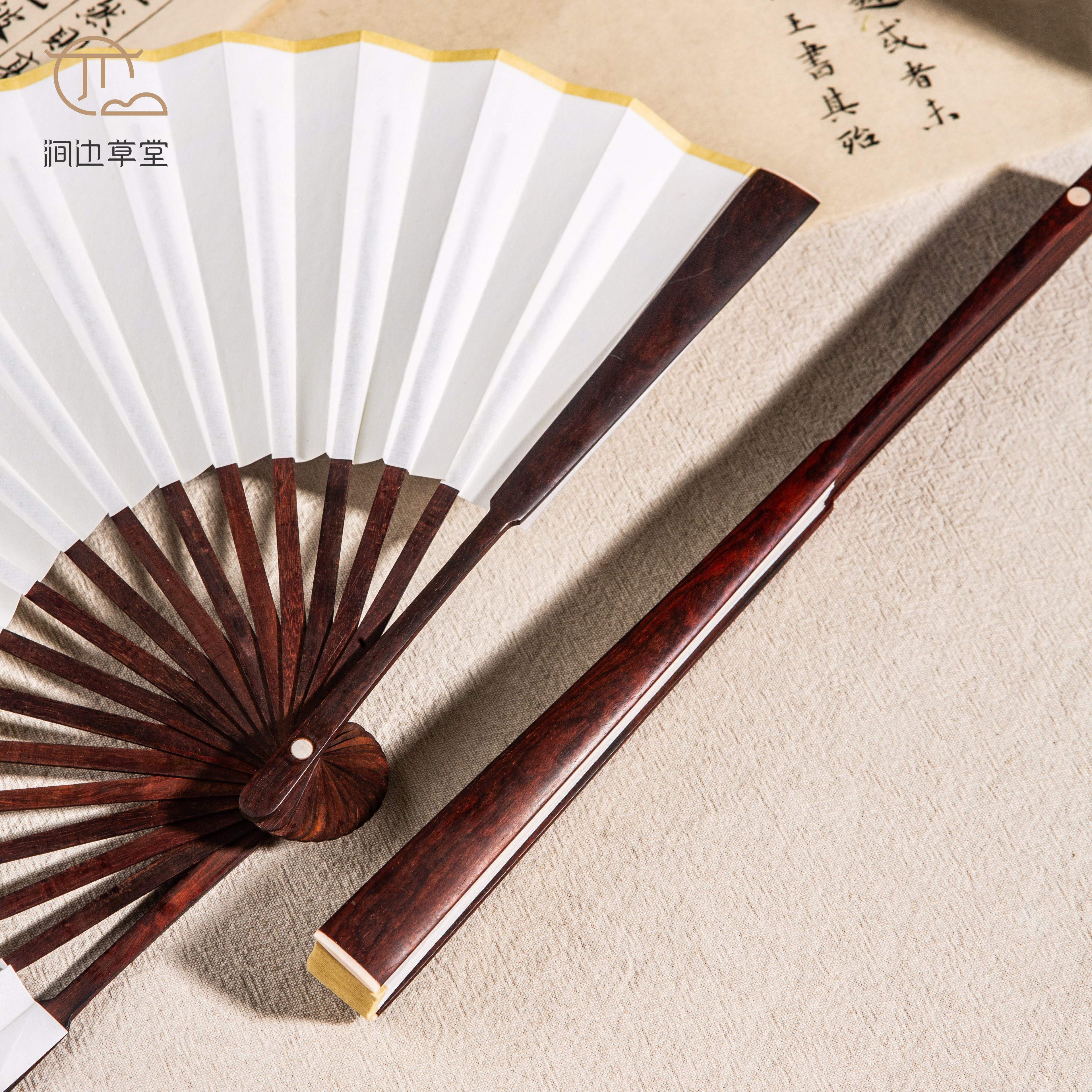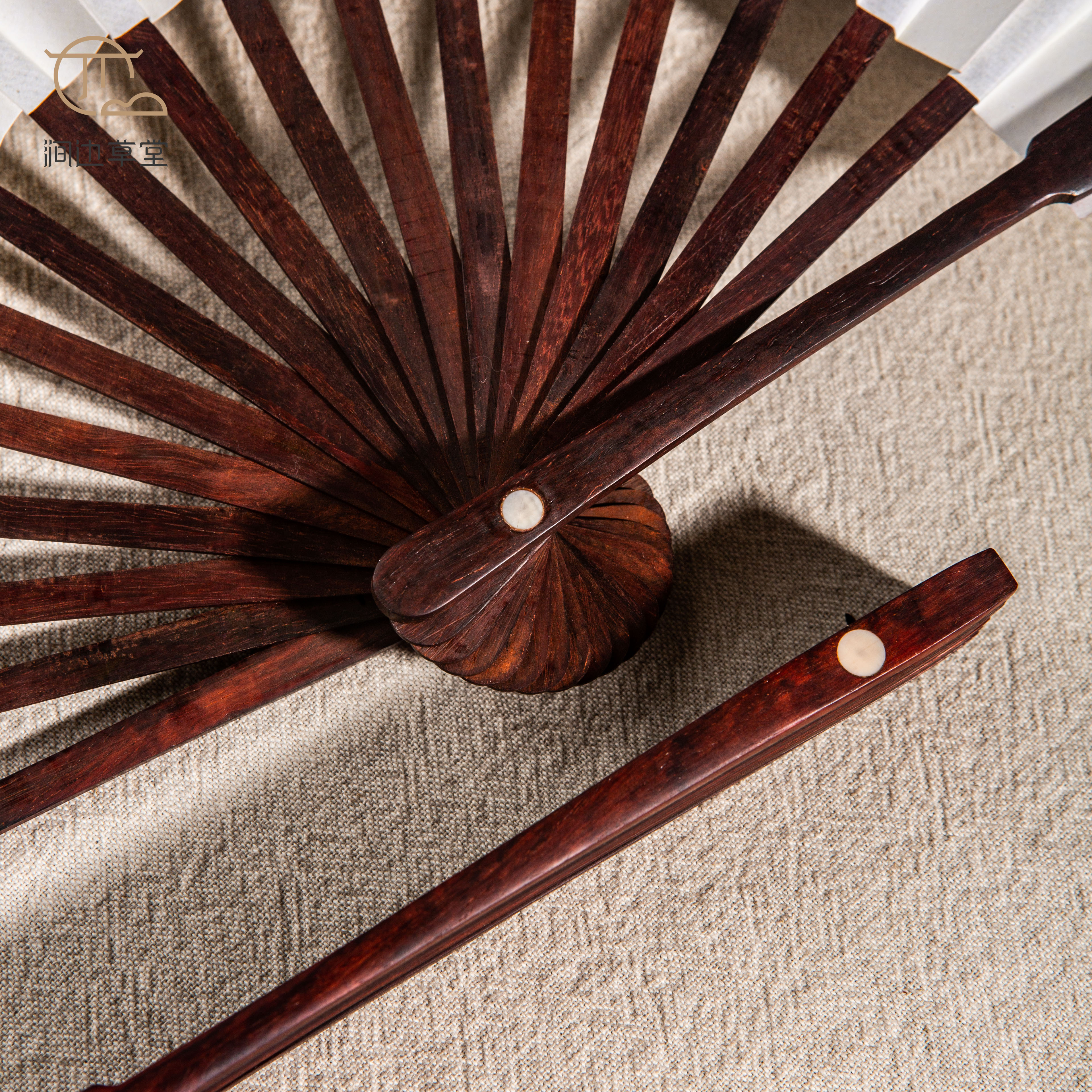 清代紫檀老料制苏工折扇,每一根扇骨均为纯手工精制并精细打磨,百年紫檀老料油性大、密度高、颜色沉稳,扇钉为猛犸所制上档次,顶部白色配饰亦为猛犸所制,真可谓是匠心之作。此扇在手尽显风度,亦是一件可传承之物。