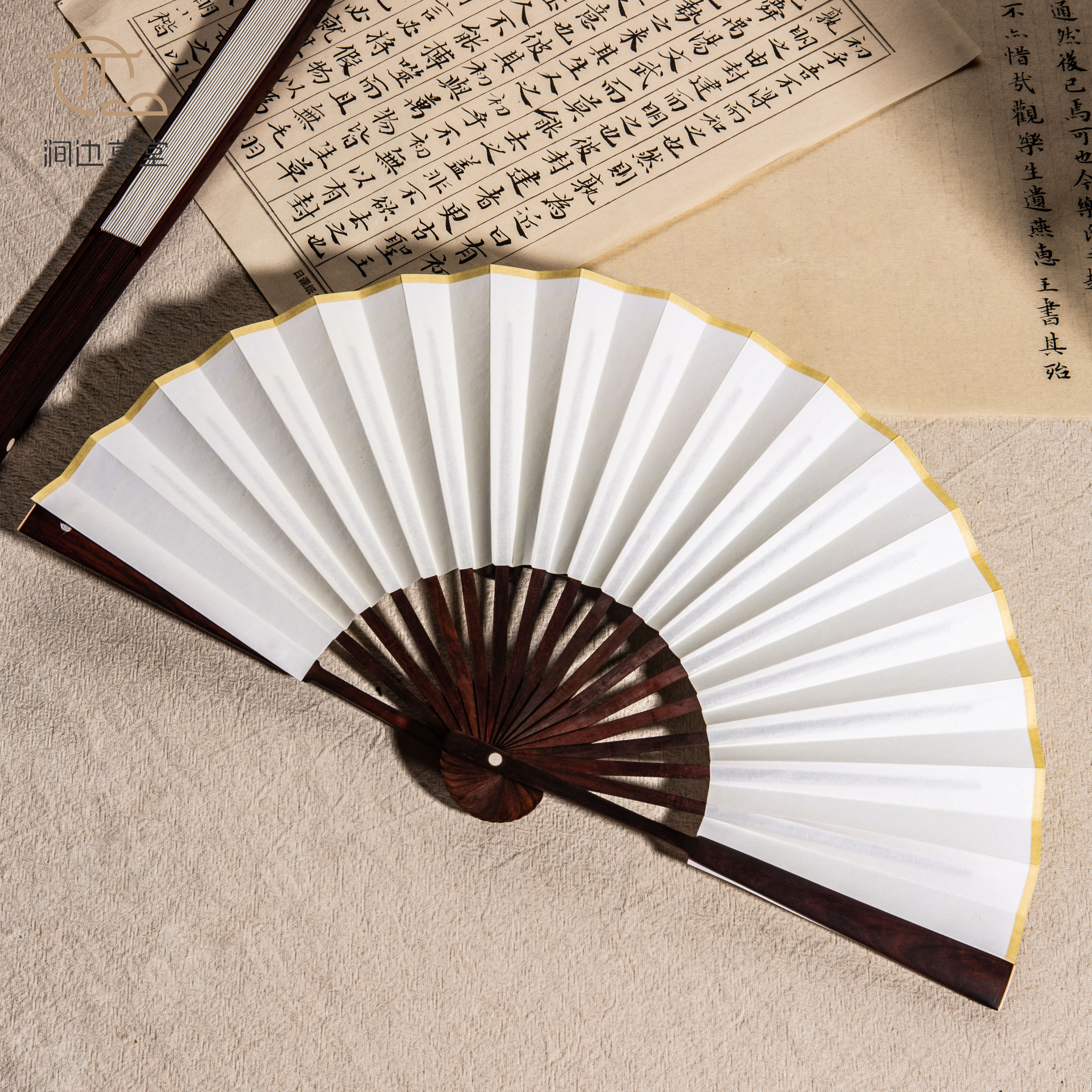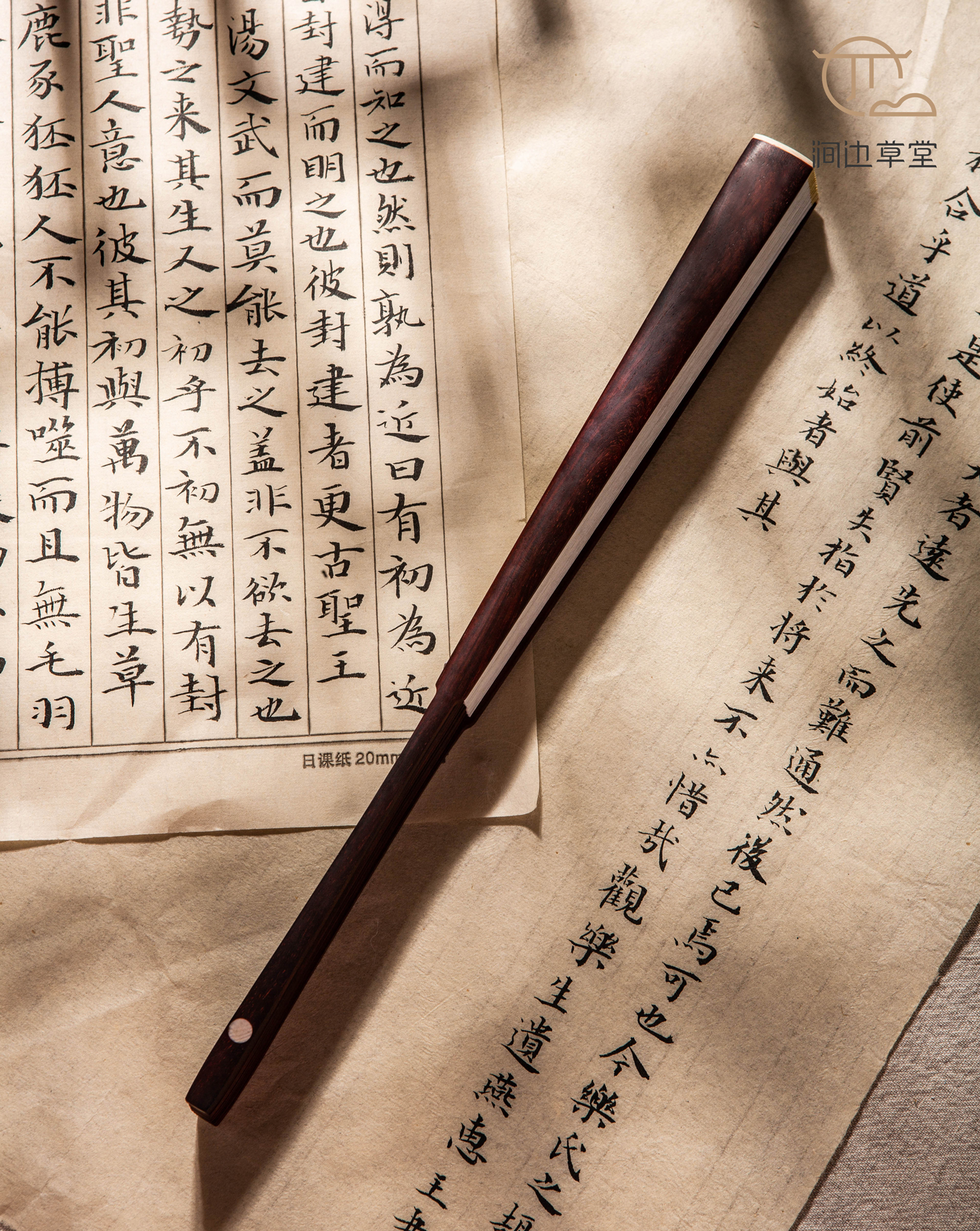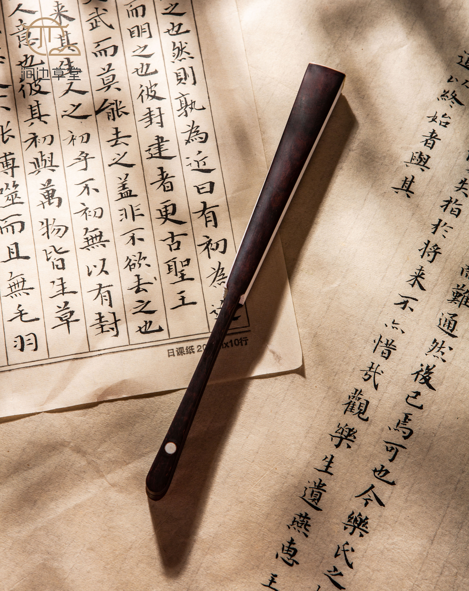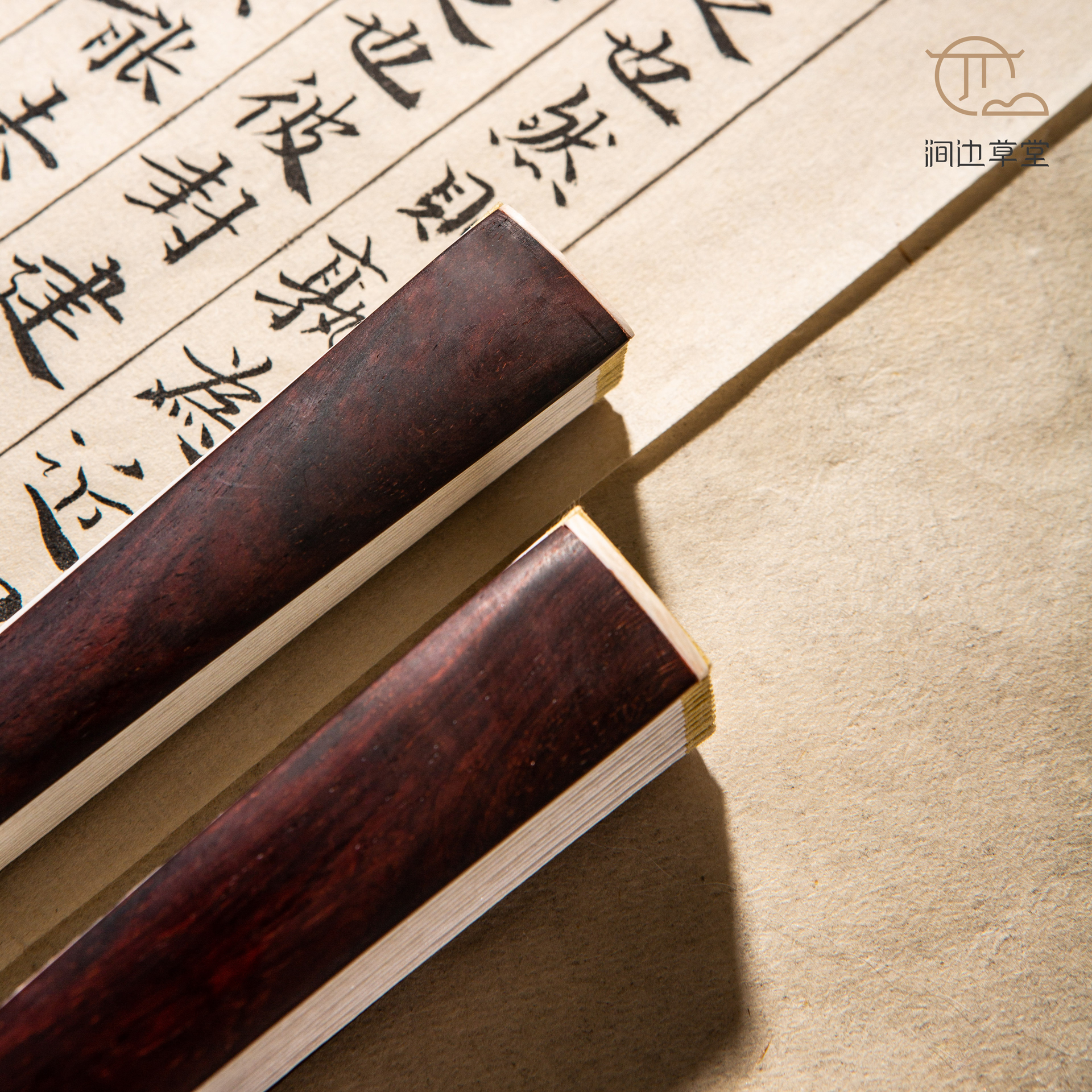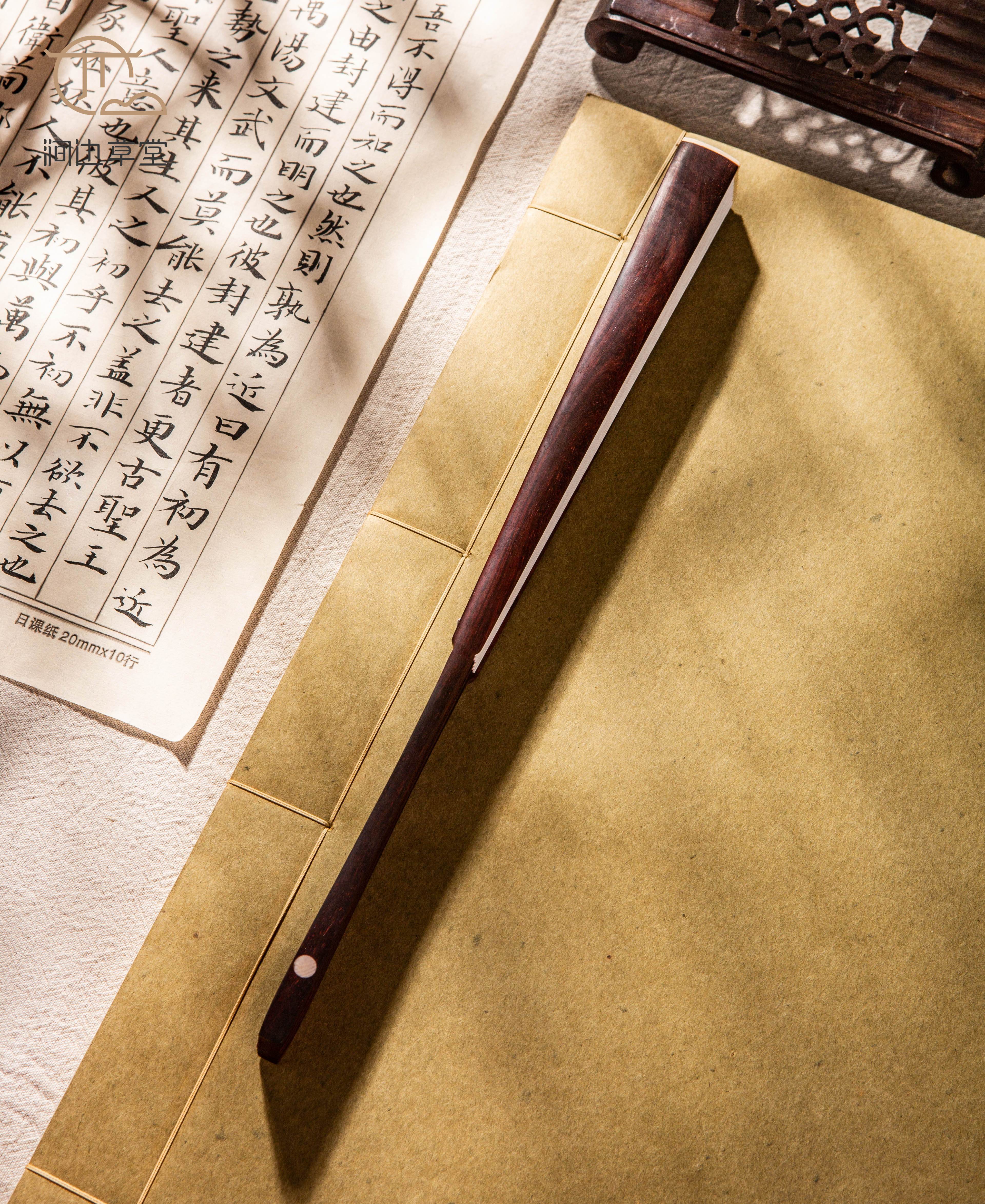清代紫檀老料制苏工折扇,每一根扇骨均为纯手工精制并精细打磨,百年紫檀老料油性大、密度高、颜色沉稳,扇钉为猛犸所制上档次,顶部白色配饰亦为猛犸所制,真可谓是匠心之作。此扇在手尽显风度,亦是一件可传承之物。