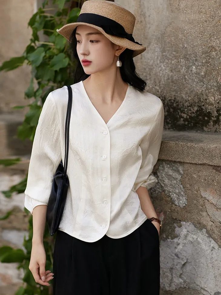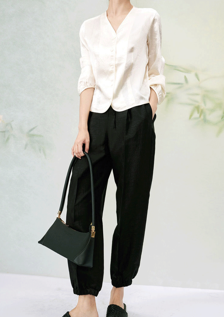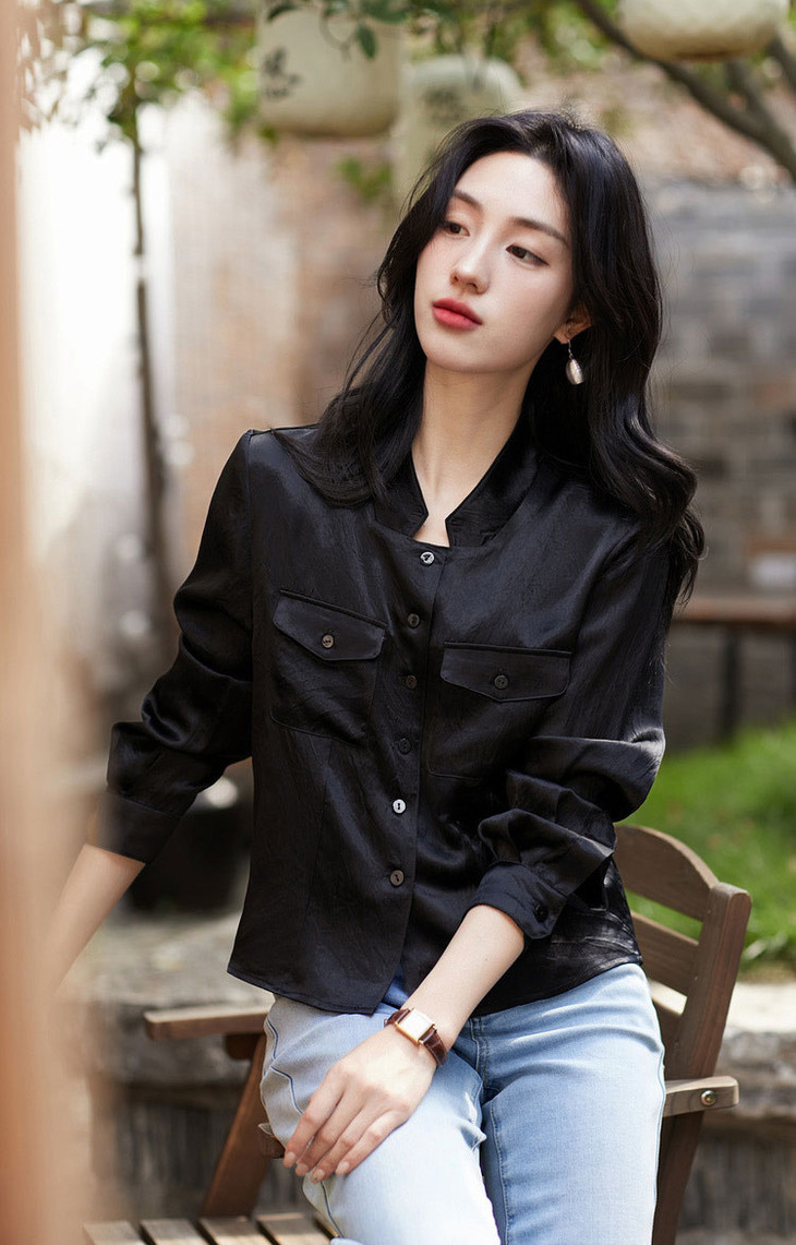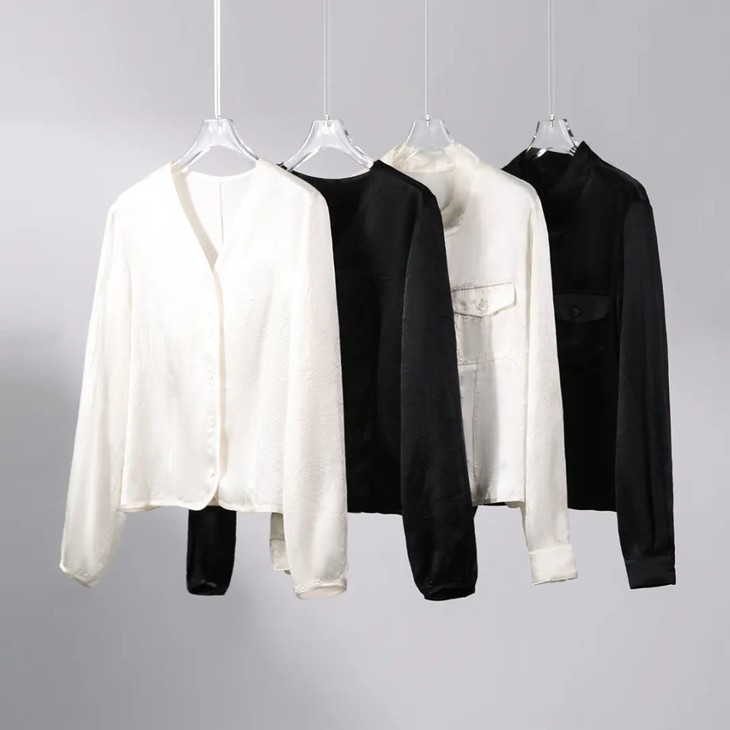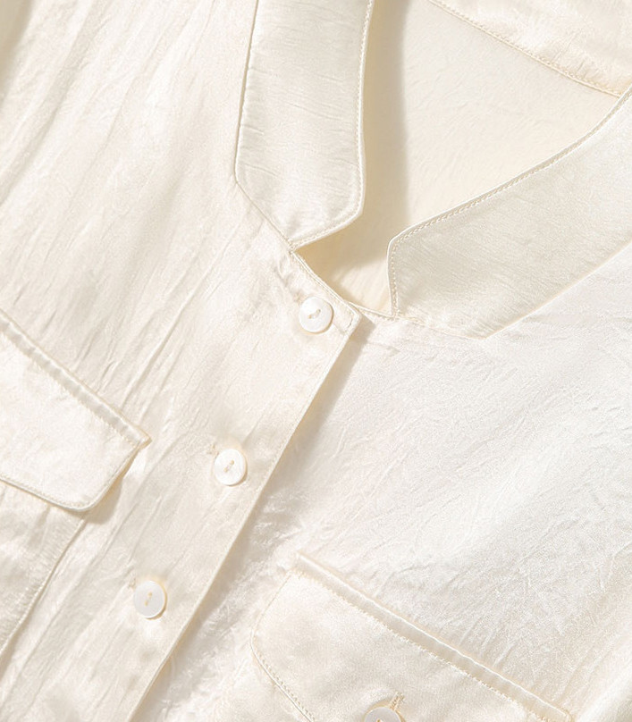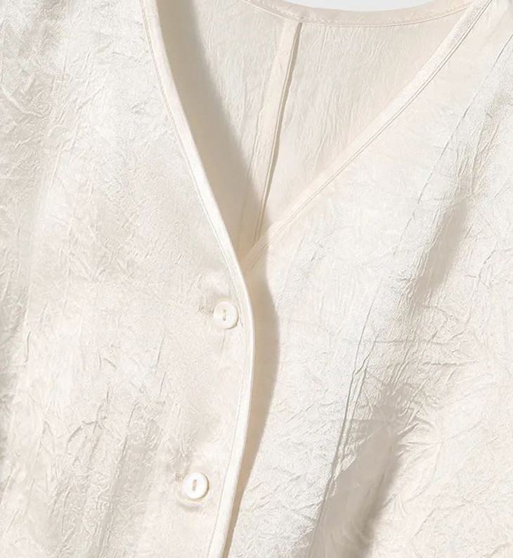 这件上衣,表面有特殊的褶皱肌理,更加上档次。质感光泽感都很媲美真丝,清爽透气。