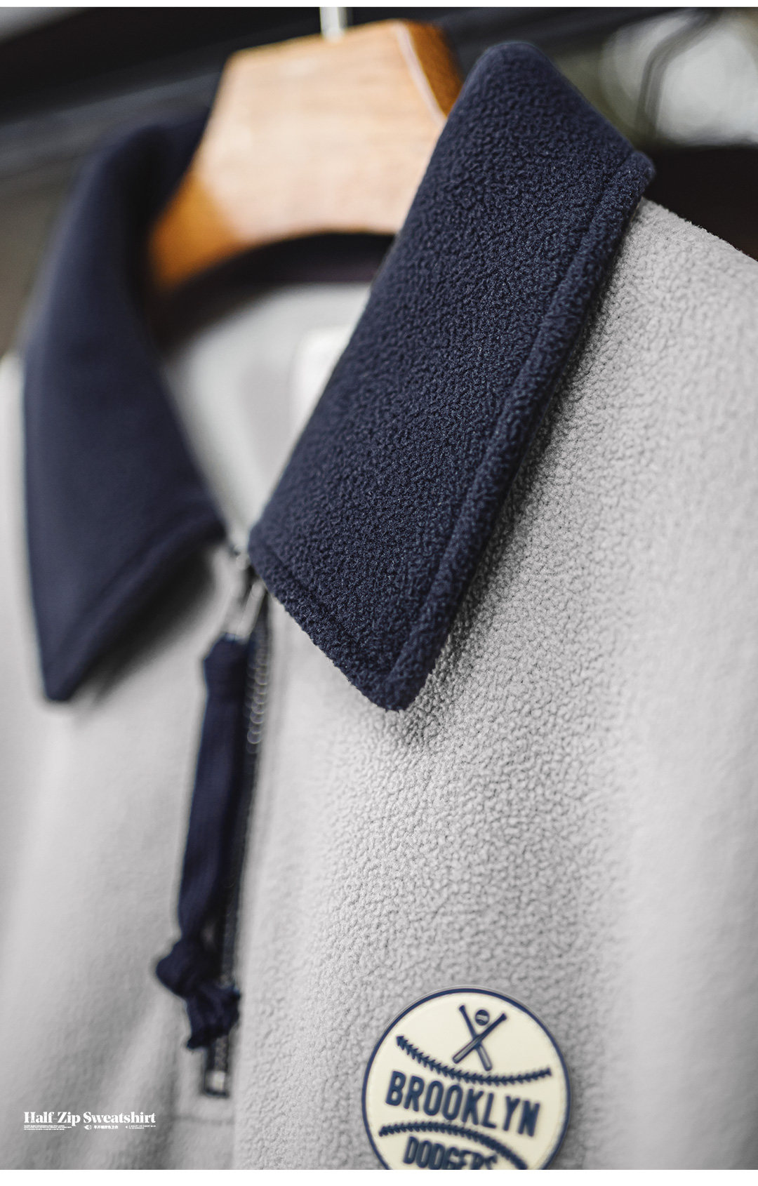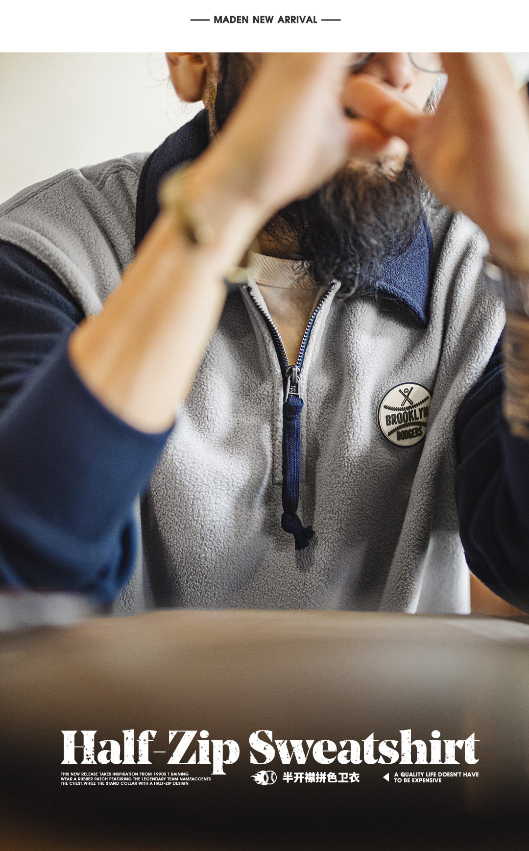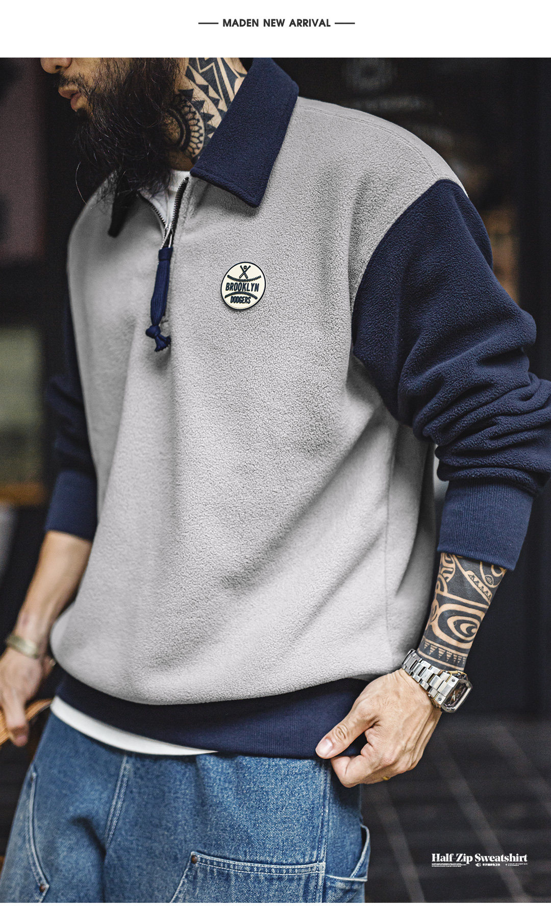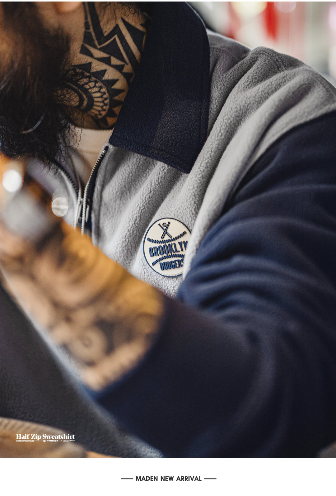 马登工装美式摇粒绒半开襟卫衣学院风polo领撞色套头保暖外套男春