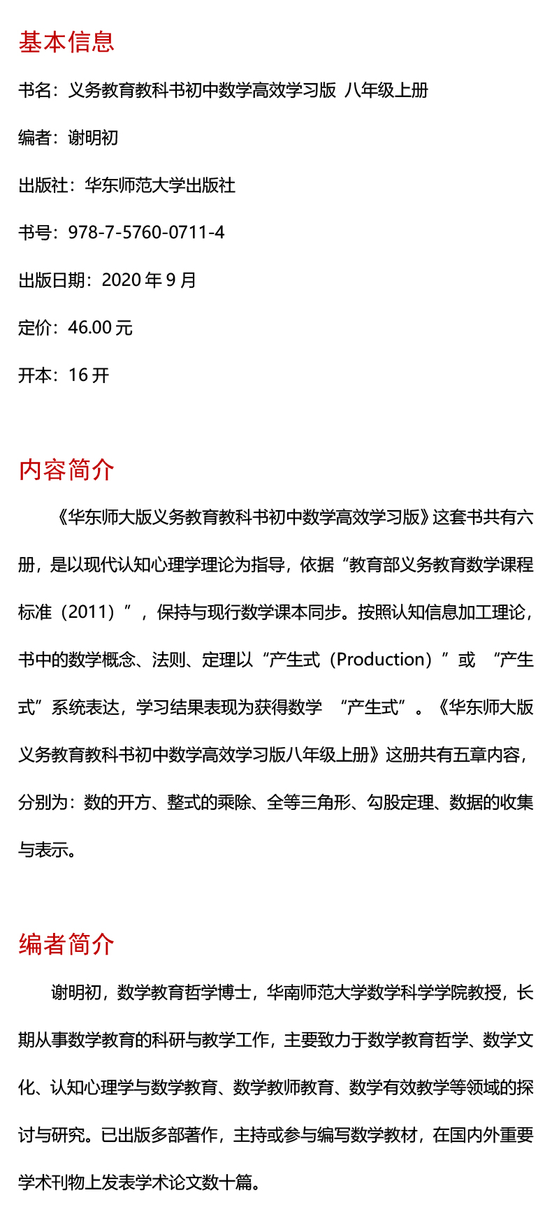 义务教育教科书初中数学高xiao学习版 八年级上册 初中数学教参 谢明初主编 正版 华东师范大学出版社