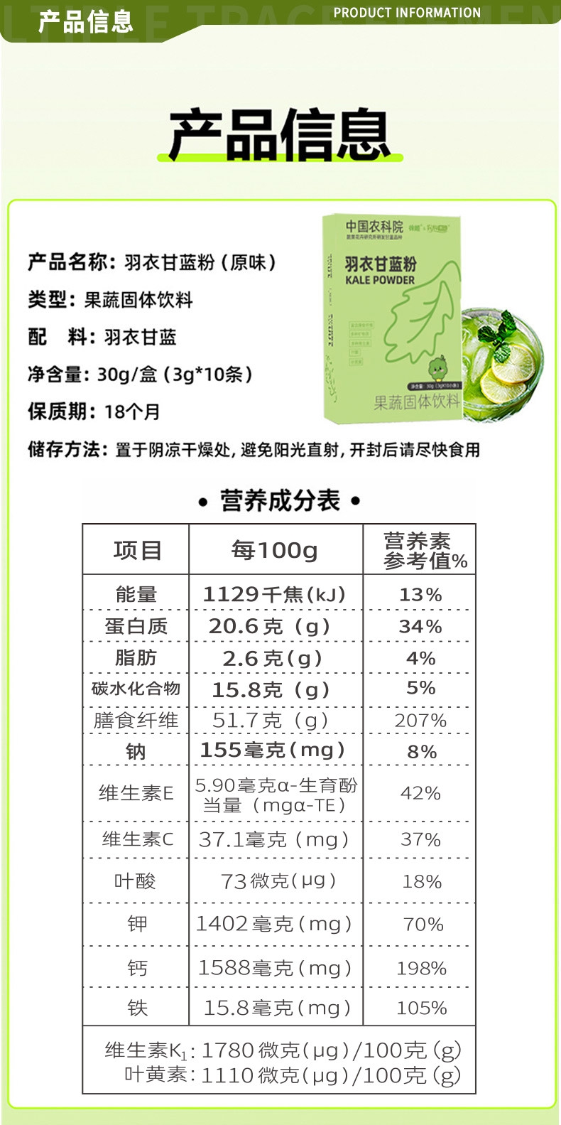 中国农科院纯羽衣甘蓝粉高膳食纤维营养代餐30g