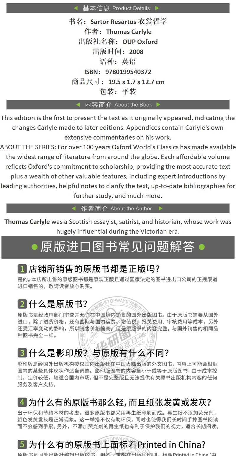 衣裳哲学 英文原版 Sartor Resartus 牛津世界经典系列 Thomas Carlyle 英文版 进口英语书籍
