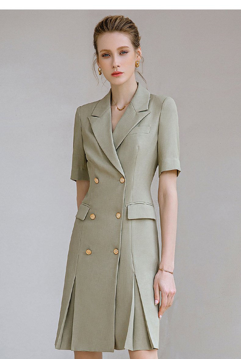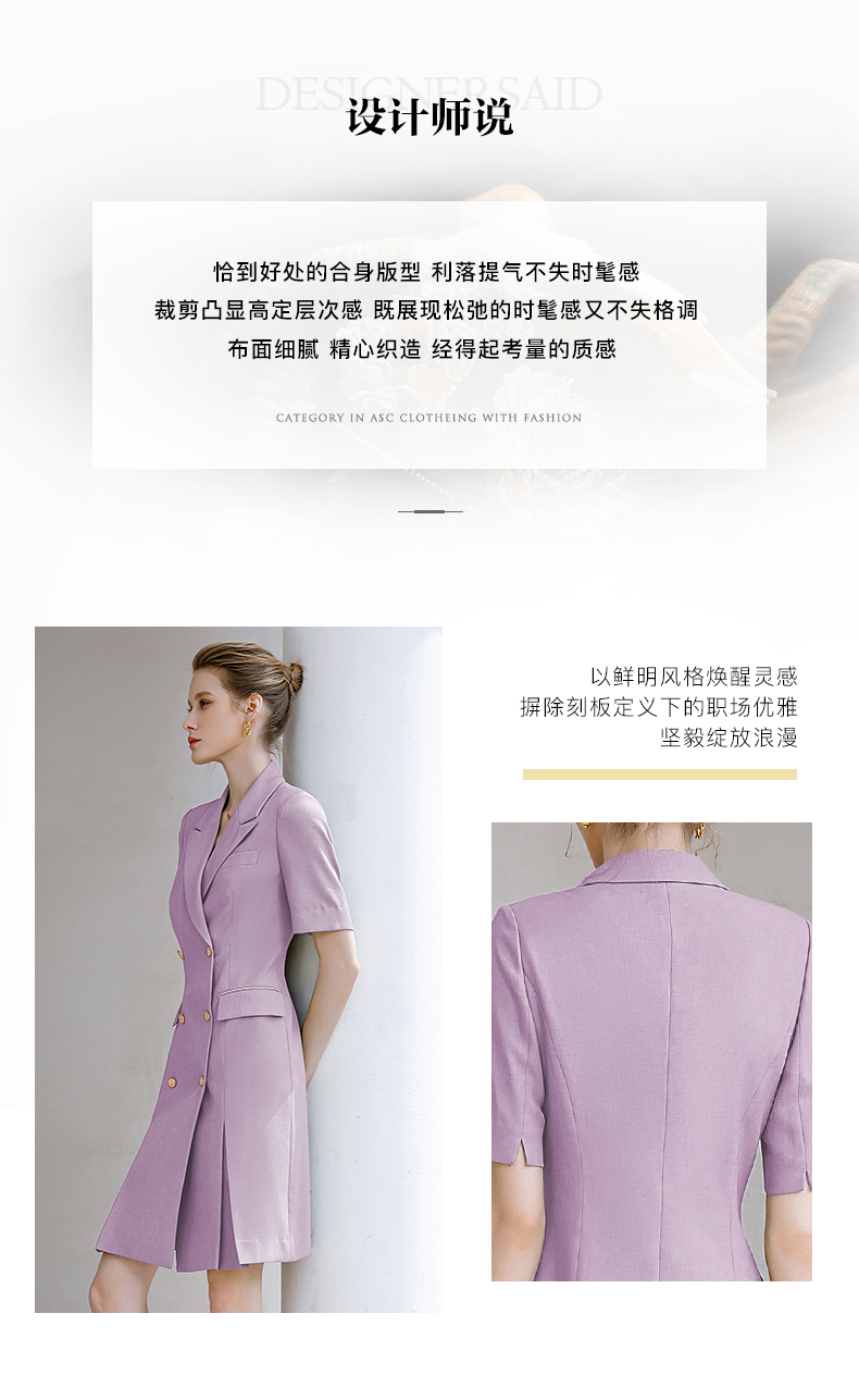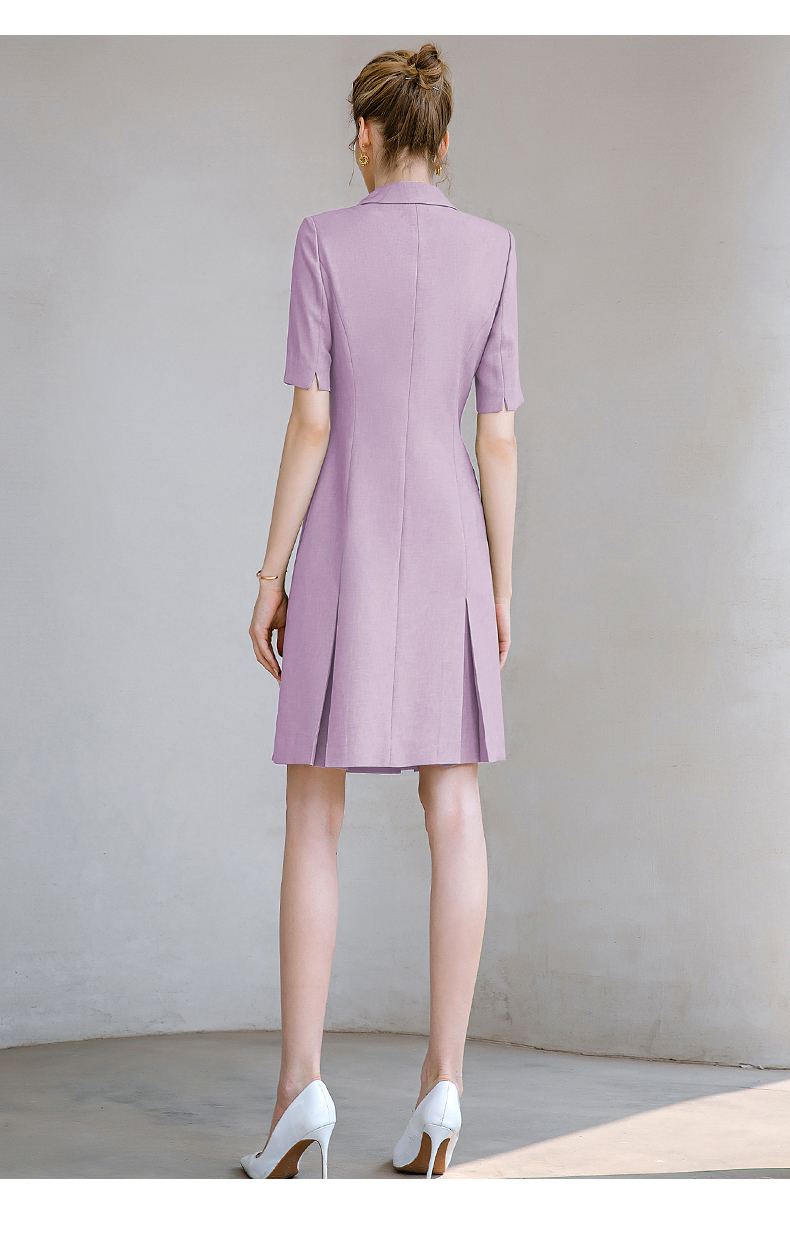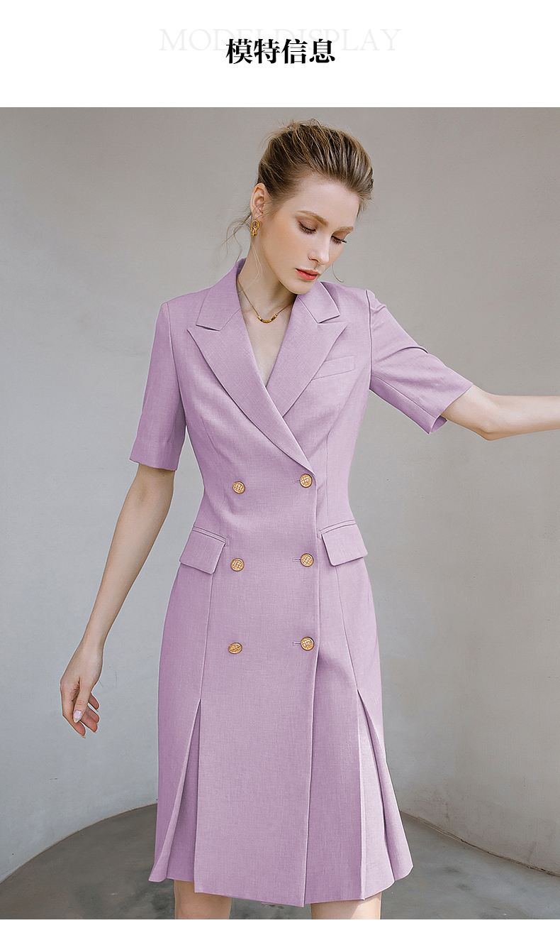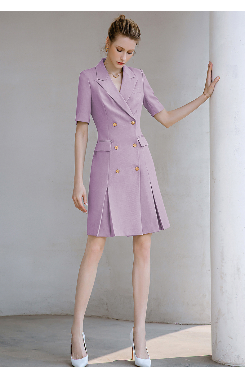 夏季新款高档时尚职业装紫色连衣裙女短袖双排扣西装裙气质女神范
