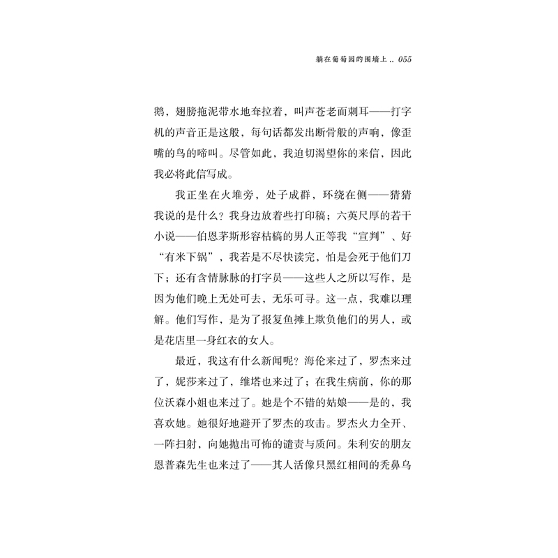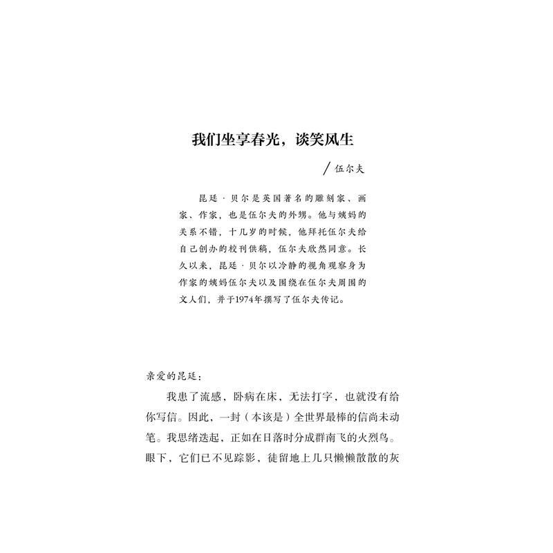 这个地方可爱极了 这可是大海啊/ 济慈 003 这个地方可爱极了/ 伍尔夫 011 这里的紫罗兰,香气扑鼻/ D.H.劳伦斯 014 这里的树木抚慰人心/ D.H.劳伦斯 018 活生生的地球正在我身上呼吸/ 泰戈尔 022 躺在葡萄园的围墙上 我现在还不喜欢生火/ 简奥斯汀 027 我太喜欢你们的房间了/ 王尔德 048 我们坐享春光,谈笑风生/ 伍尔夫 054 给三十来只鸡喂食/ 乔治奥威尔 059 躺在葡萄园的围墙上/ 卡夫卡 071 蛤蜊、舌鳎鱼配白米饭/ 海明威 073钱没有多少,但天气好极了 我只懒到5月末/ 契诃夫 079 钱没有多少,但天气好极了/ 契诃夫 085 明天会更快乐/ 纪德 089 现在我试着自己做饭了/ 乔伊斯 092 我赢得了一个人的掌声/ 叶芝 096 我的生命像一团火焰/ D.H.劳伦斯 099一大片月光向我们袭来 一大片月光向我们袭来/ 王尔德 105 浪漫!真浪漫!/ 布鲁克 116 我无语凝噎/ 泰戈尔 120 我无所畏惧/ 马克吐温 125 这就是生活!/ 马克吐温 129 我从未见过这般场景/ 威廉福克纳 133我不沮丧,也不泄气 接受一切/ 夏洛蒂勃朗特 141 当受的折磨/ 狄更斯 145 信念改变一切/ 乔伊斯 147 幸福是一所最好的大学/ 普希金 150 我不沮丧,也不泄气/ 陀思妥耶夫斯基 155 仰起脸直冲太阳/ 小林多喜二 186幸好您还在这里 等待月亮/ 席勒、歌德 193 幸好您还在这里/ 托马斯曼、黑塞 199 没有妖怪,没有英雄/ 福楼拜、乔治桑 213 我心向您/ 屠格涅夫、托尔斯泰 228 可以望见火山/ 三岛由纪夫、川端康成 237
