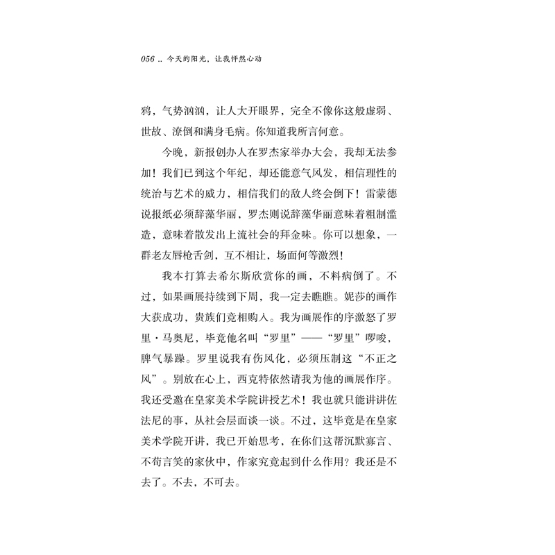 ;书简阅名家系列分为《穿过绿色小径去见你》《今天的阳光,让我怦然心动》《我已经在想春天了》三册,精选了54位具有世界影响力的文学大家的信件。通过阅读这一封封信件,我们得以近距离接触这些耳熟能详的文学家们,就像重新认识一位位老朋友。原来在人生的某一时刻,他们和我们有过同样的悲喜。《今天的阳光,让我怦然心动》主要收录了伍尔夫、泰戈尔、卡夫卡、契诃夫、简奥斯汀等人的信件,涉及人与人的关系、人与自然的关系、人生的苦难、人在旅途等主题,展现了文学家们的生活切面。原来他们也食尽人间烟火,历经一地鸡毛的琐碎,堪称当代年轻人的跨世纪知音。