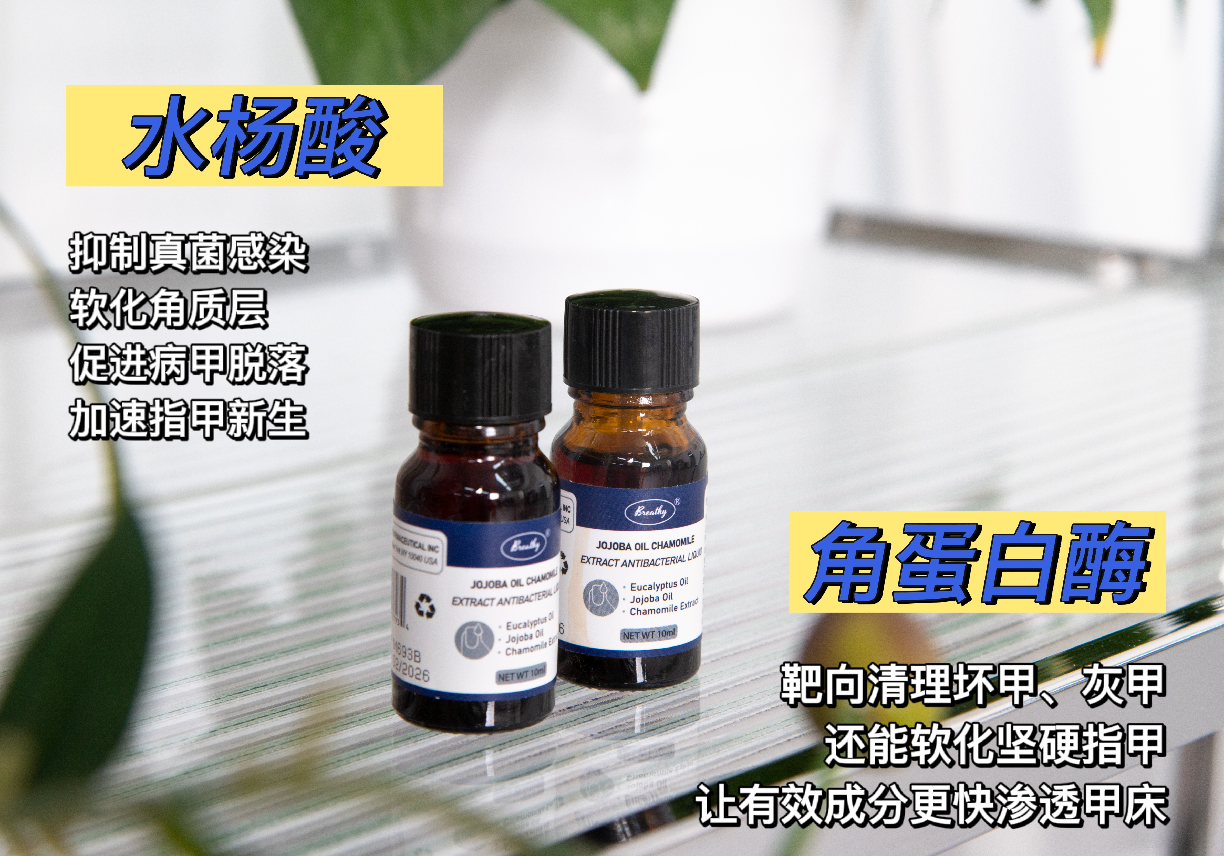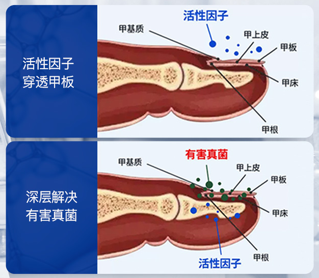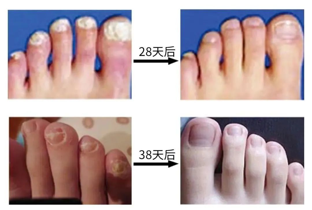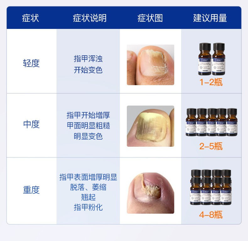 【适用症状】灰指甲,指甲增厚、发黄、发灰、粉化,甲面凹凸不平、甲板萎缩、脱落
