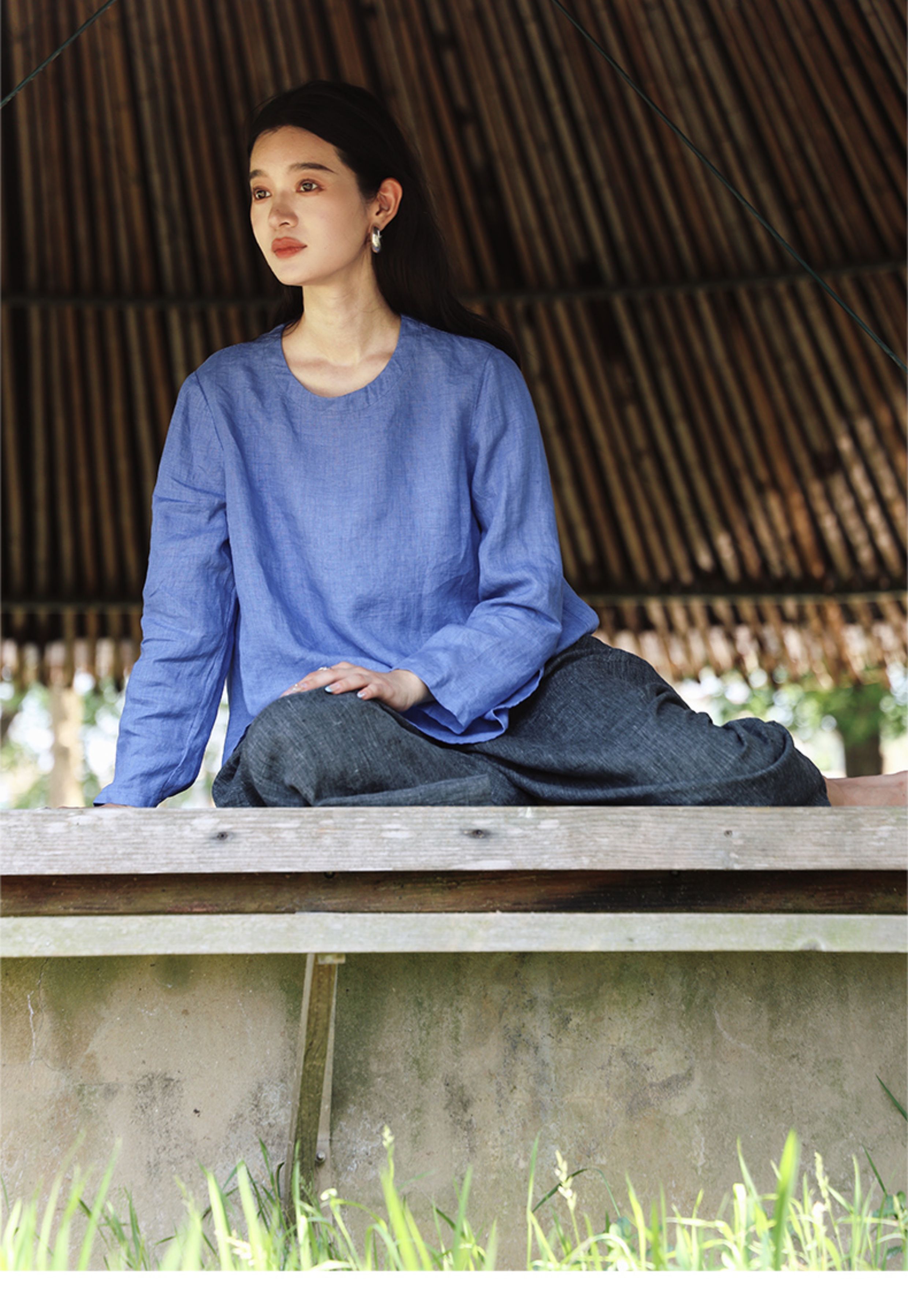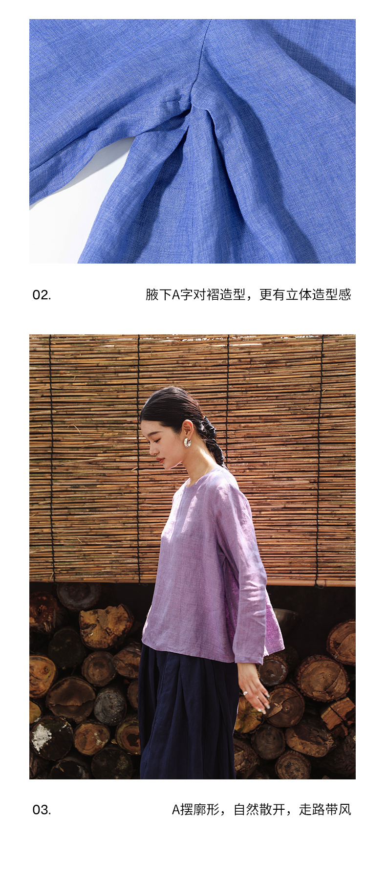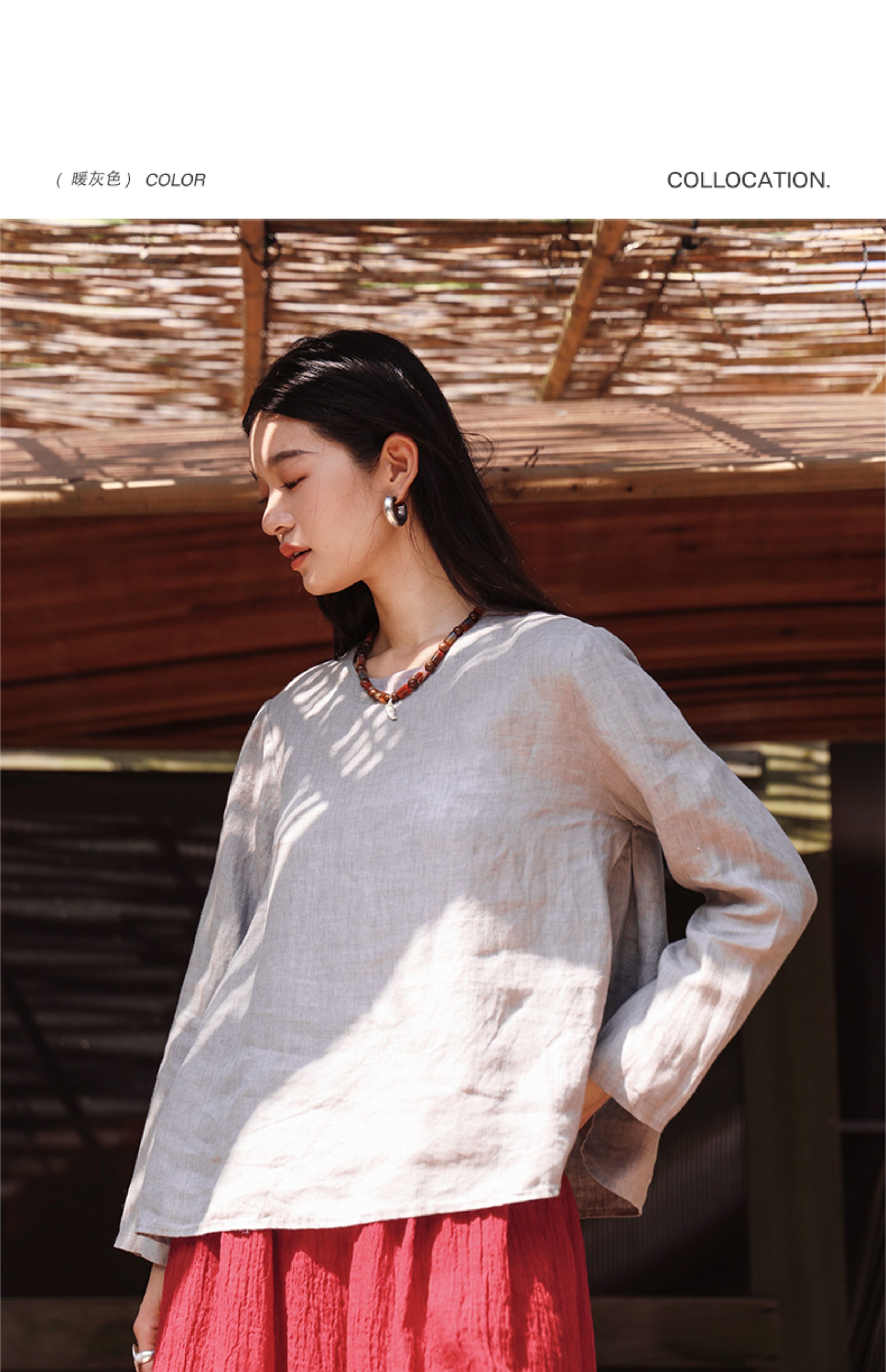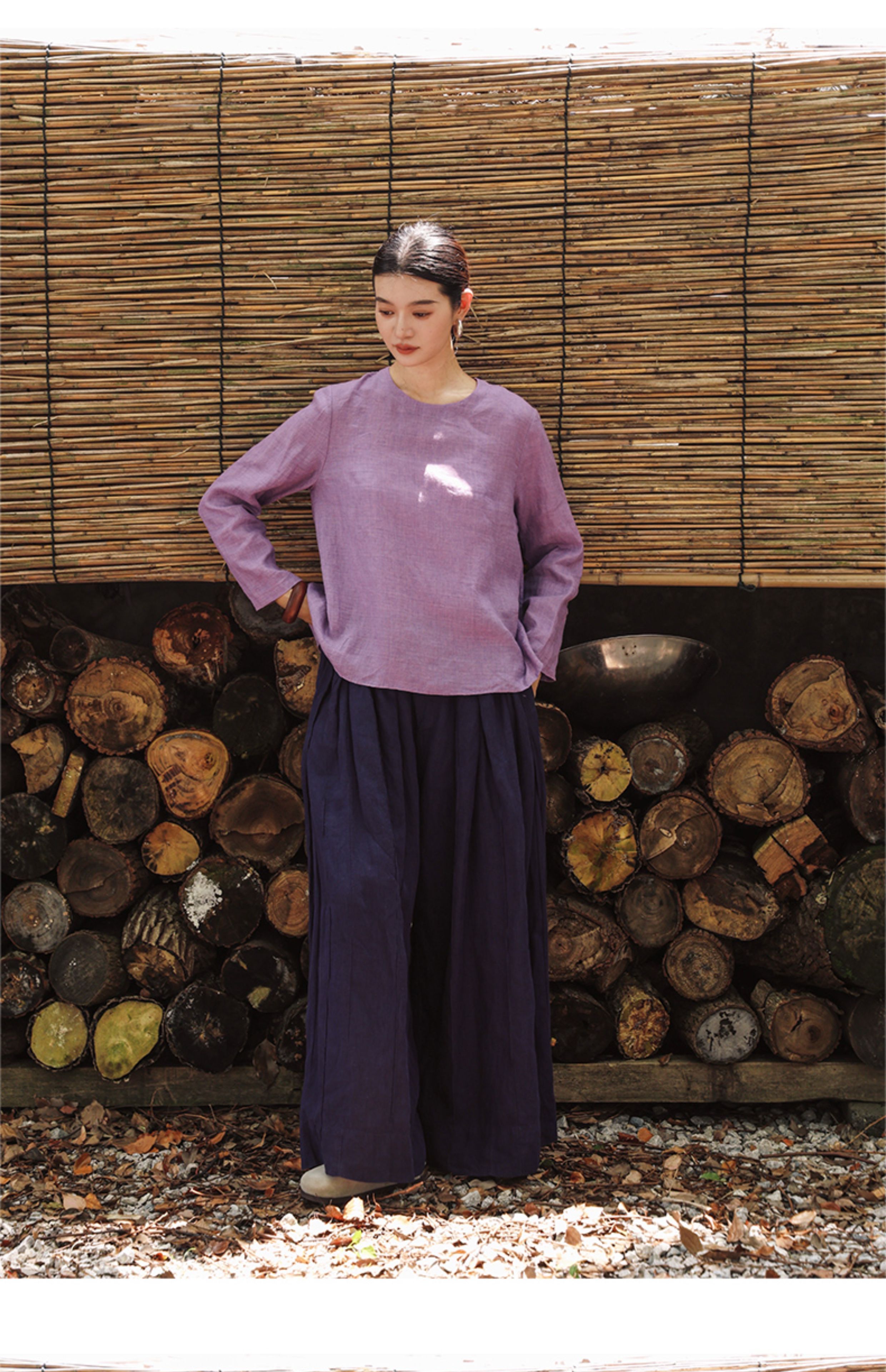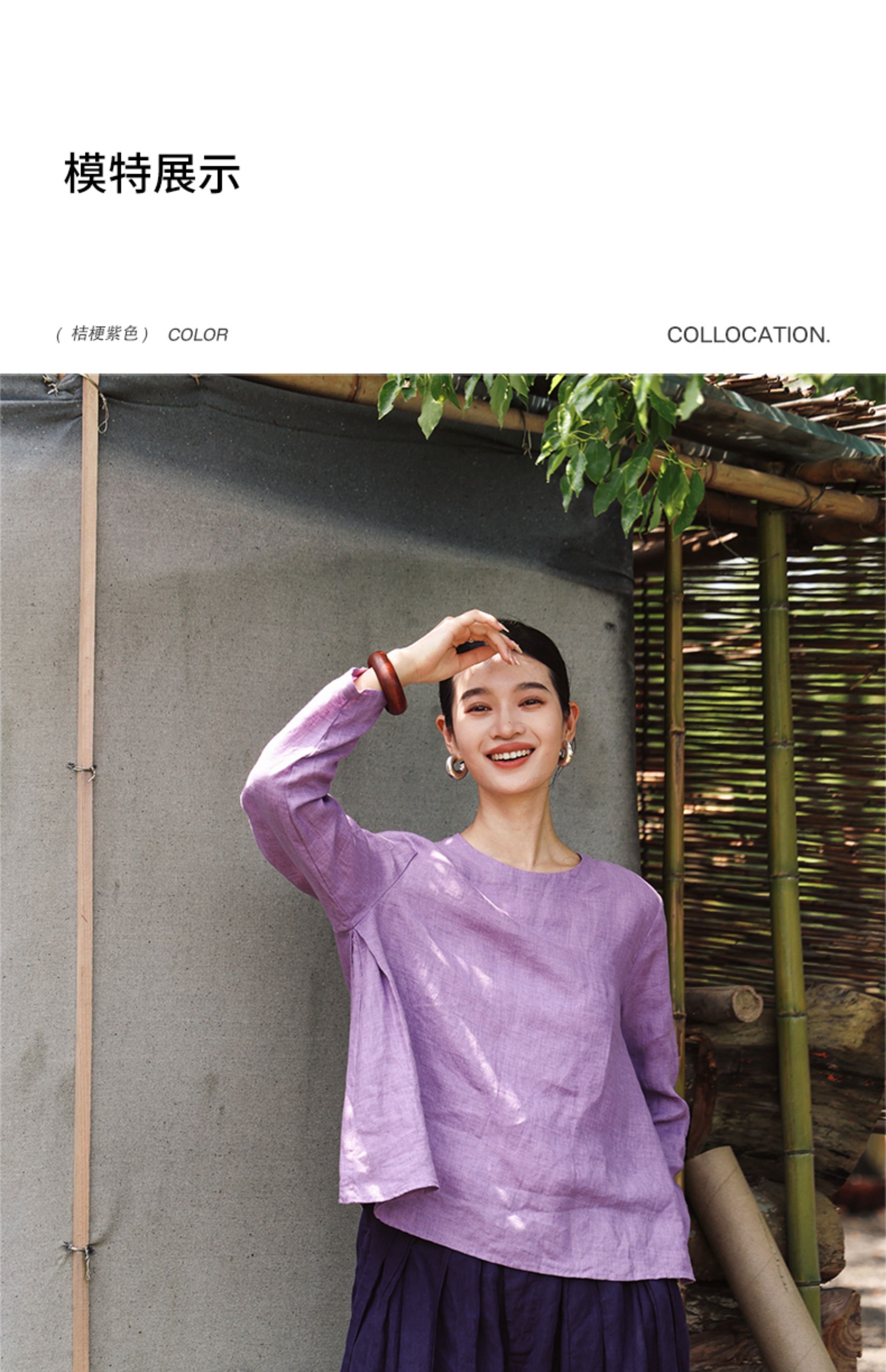 绽放女装491朵/【大山的褶皱】士林色织亚麻A褶长袖梭织T恤打底衫